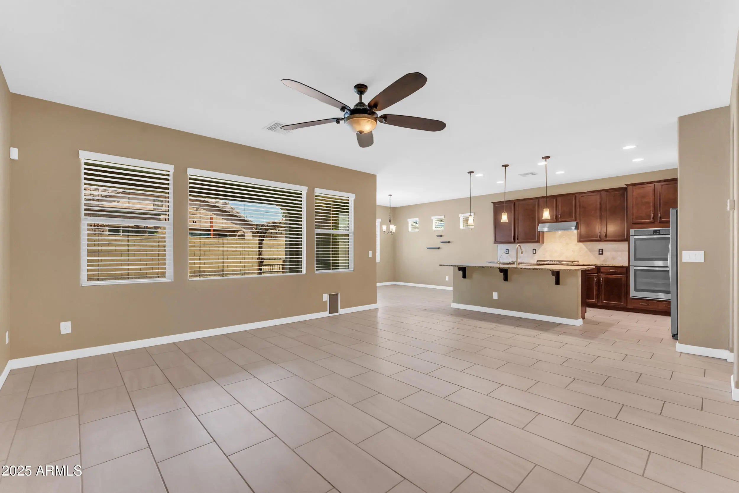 This inviting single-story home in Buckeye offers a bright and comfortable living space designed for both relaxation and entertaining. The open-concept floor plan flows seamlessly from the living area into a modern kitchen featuring sleek cabinetry, ample counter space, and a breakfast bar that's perfect for casual dining. The primary suite provides a peaceful retreat with its own private bath, while additional bedrooms offer flexibility for family, guests, or a home office. Outside, the spacious backyard is ready for gatherings, play, or simply enjoying Arizona's beautiful sunsets. A covered patio adds shade and comfort for outdoor living year-round. Conveniently located near schools, parks, shopping, and easy freeway access, this home combines comfort and practicality.