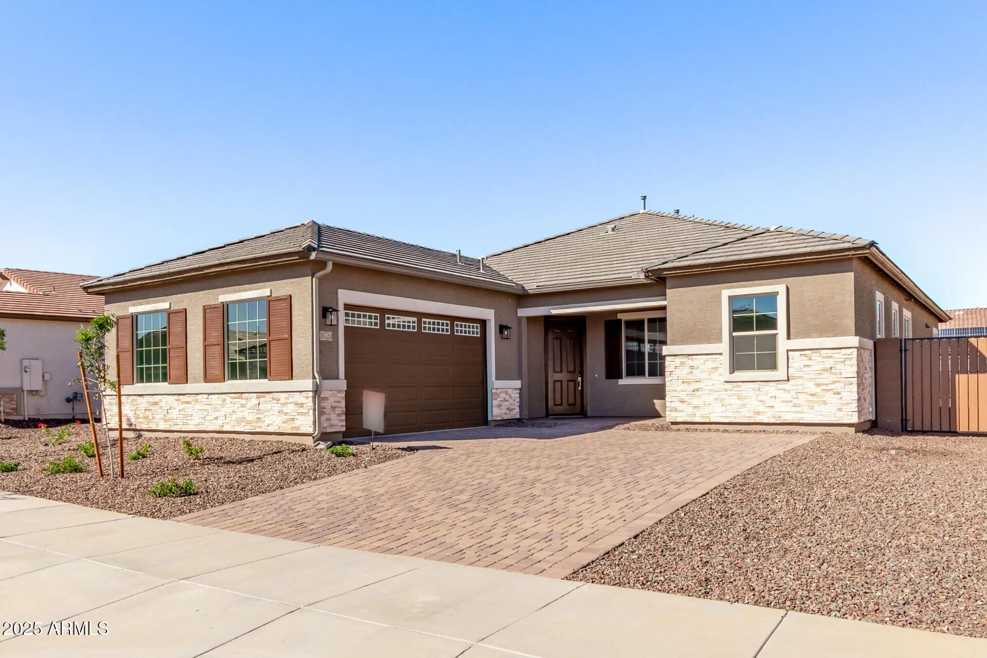 Explore this beautiful Townsend home, ready for quick move-in on a premium homesite with driveway pavers, front yard landscaping, and a spacious backyard that backs to a greenbelt. Inside, you'll find a welcoming covered porch and a gourmet kitchen with 42'' cabinets, quartz countertops, stainless-steel appliances, a walk-in pantry, a roomy nook, and a center island. An impressive guest suite offers a bedroom, bathroom, living room, and kitchenette, while the spacious great room is perfect for gathering. The luxurious primary suite features a private bath with cultured marble countertops and a generous walk-in closet. A private study and a covered patio overlooking the backyard add to the appeal. This home also includes stone tile flooring, ceiling fan prewiring in select rooms, and airy 10' ceilings throughout.