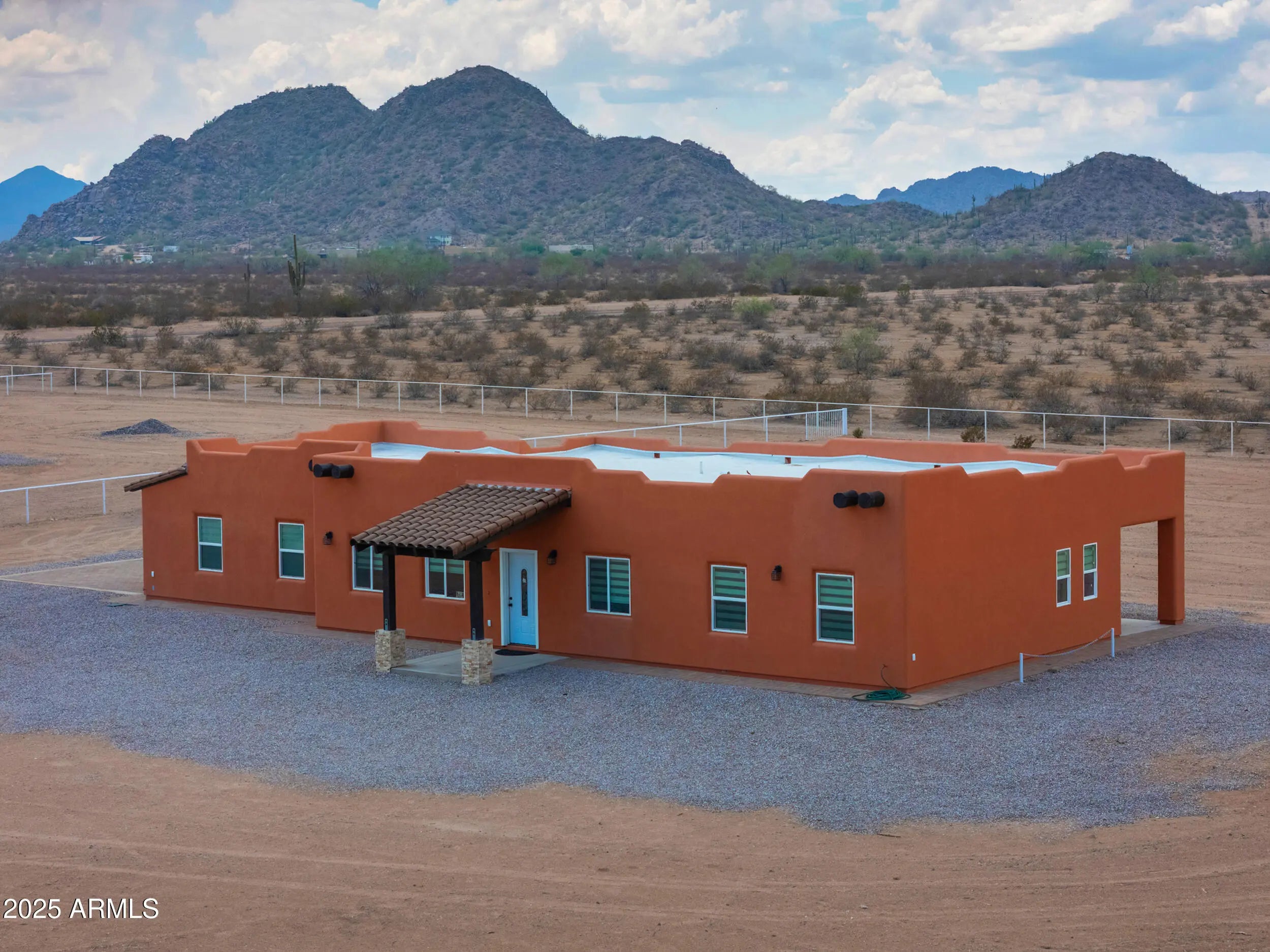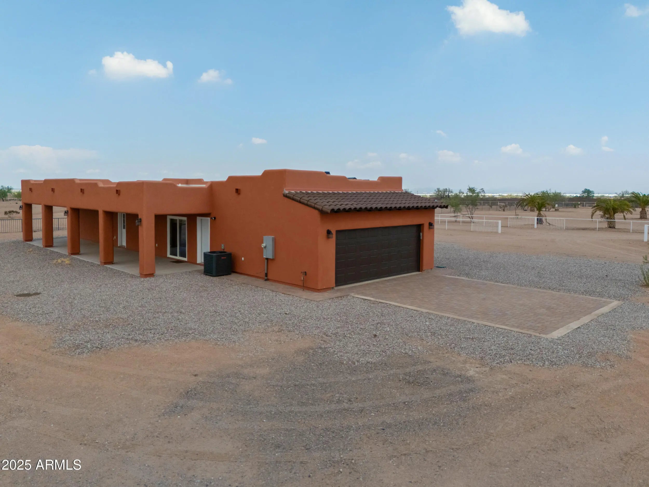 LOCATION, LOCATION, LOCATION! This stunning home sits within a ONE OF A KIND custom home community with 1+ acre lots, no HOA, upgraded shared well & paved roads- it's the perfect blend of convenience & secure country living! Just a half block from Hwy 347, you'll have easy access to Maricopa, Casa Grande, schools, & shopping- close enough to enjoy city perks, yet far enough to embrace peace & quiet! This 2024 built Santa Fe-style home showcases true pride of ownership with 1,515 sq ft (over 2800 total with patios & garage), 3 spacious bedrooms & 2 full baths! The entertainer's kitchen boasts white cabinetry, granite countertops, SS appliances, large island & dining nook overlooking the great room! Additional upgrades include stunning staggered 20 in tile & wood laminate flooring throughout, soaring ceilings, modern fixtures, custom blinds, epoxy garage & more! The palatial primary suite features a double walk-in closet & a luxurious ensuite with a double vanity, large walk-in tiled shower & separate tub/shower! Set on 1.25 acres in Hidden Valley, this level lot offers front & back covered patios, desert landscaping, pipe fencing, & panoramic mountain views! A MUST SEE!
