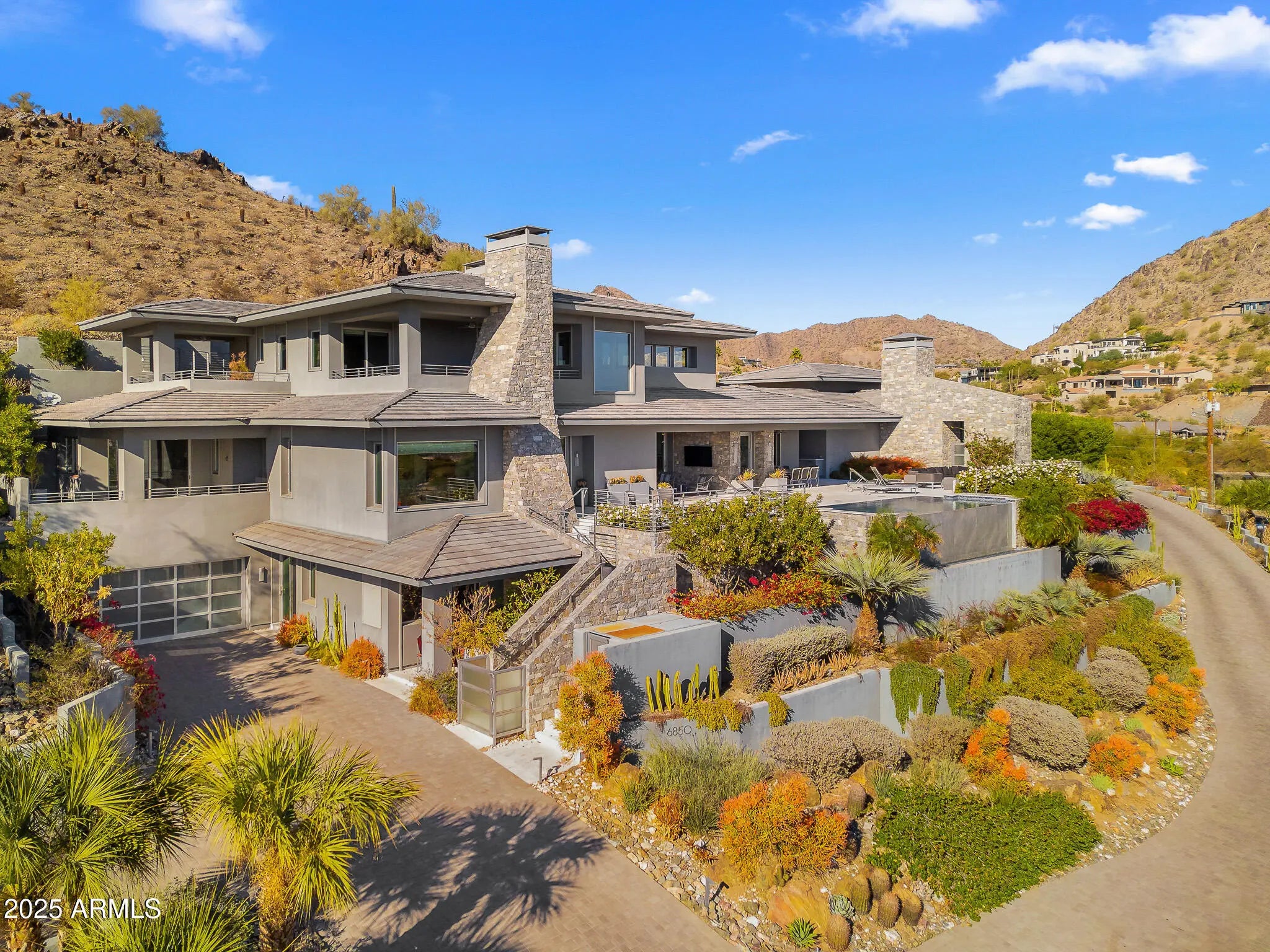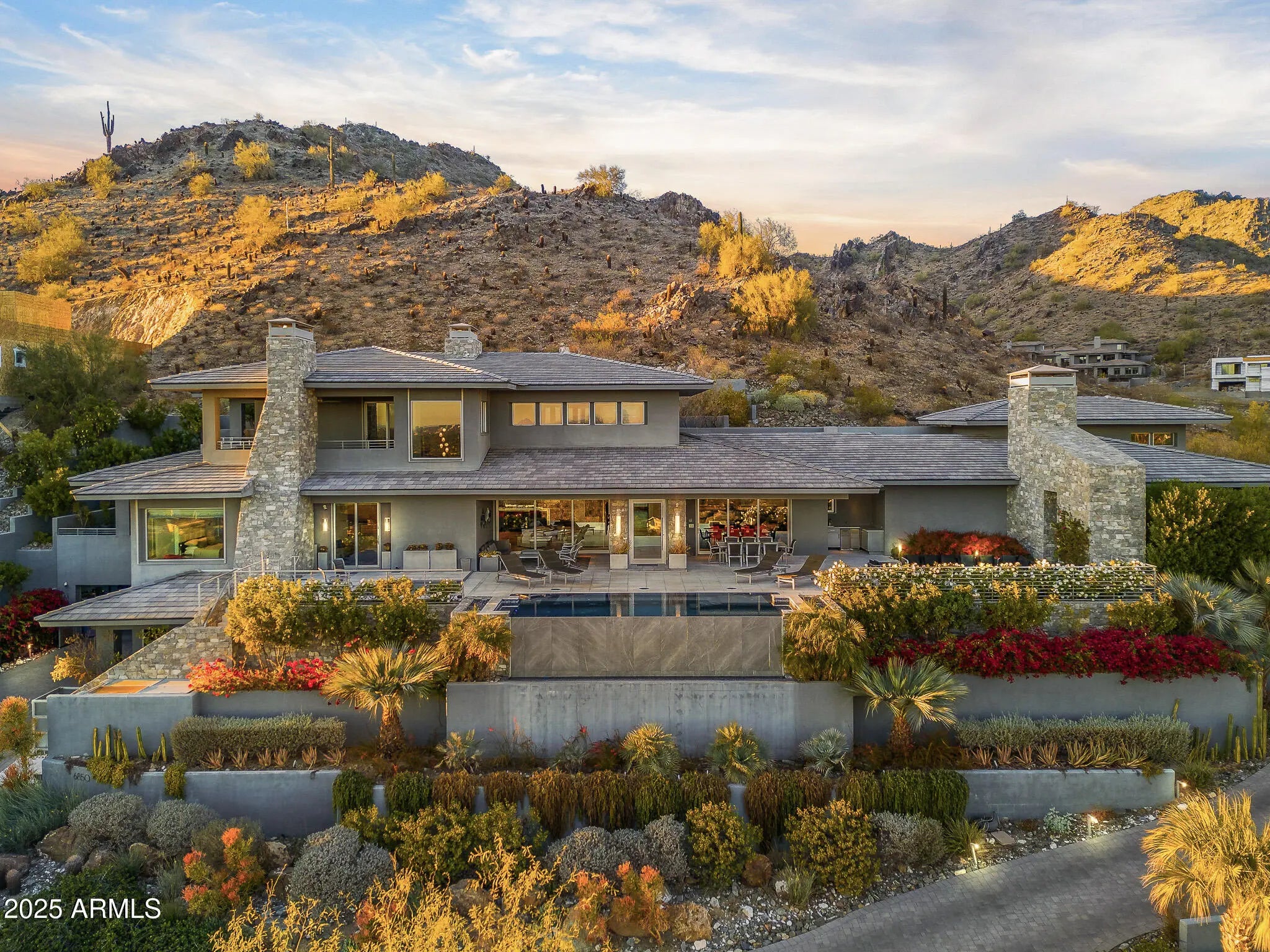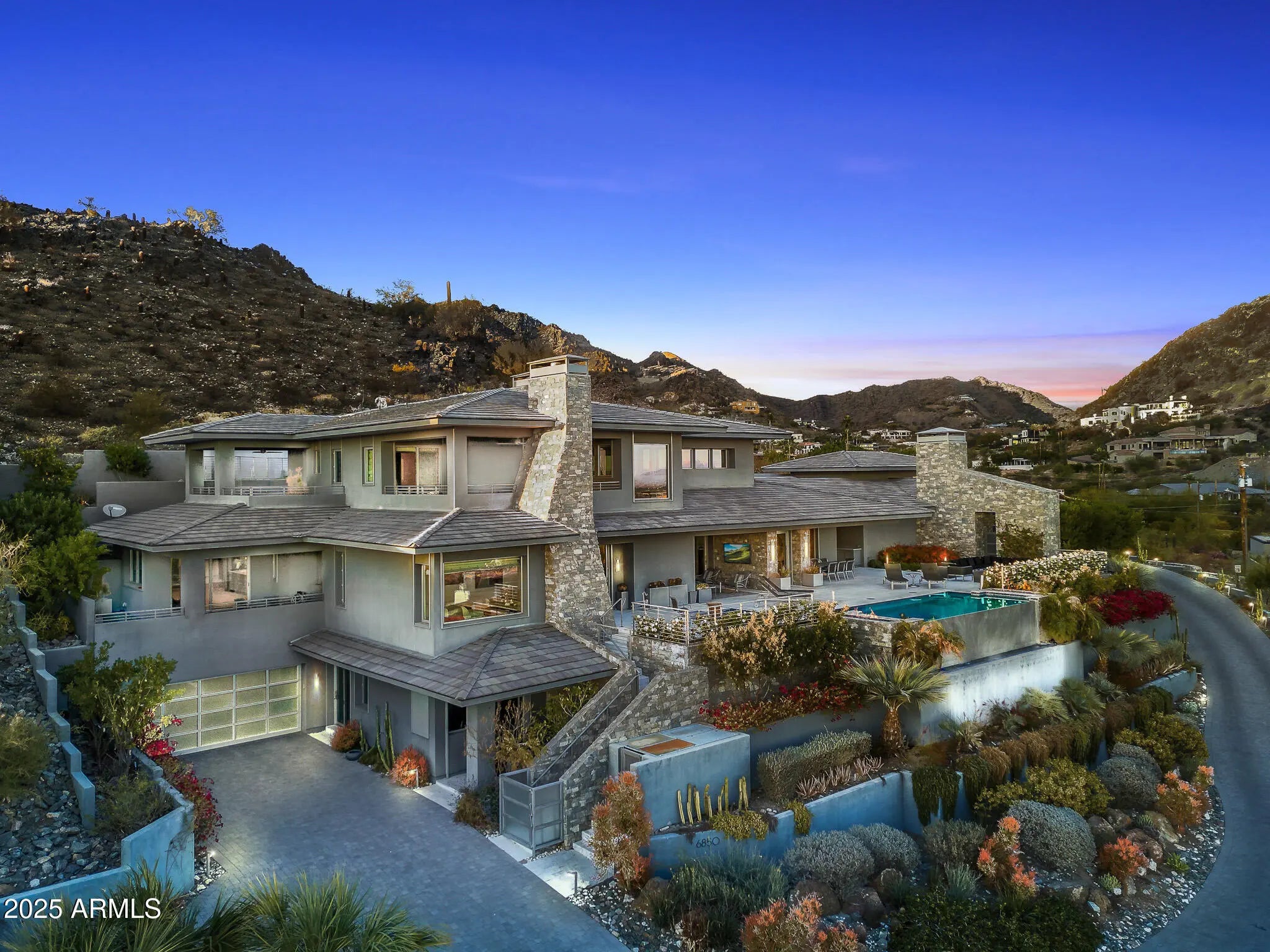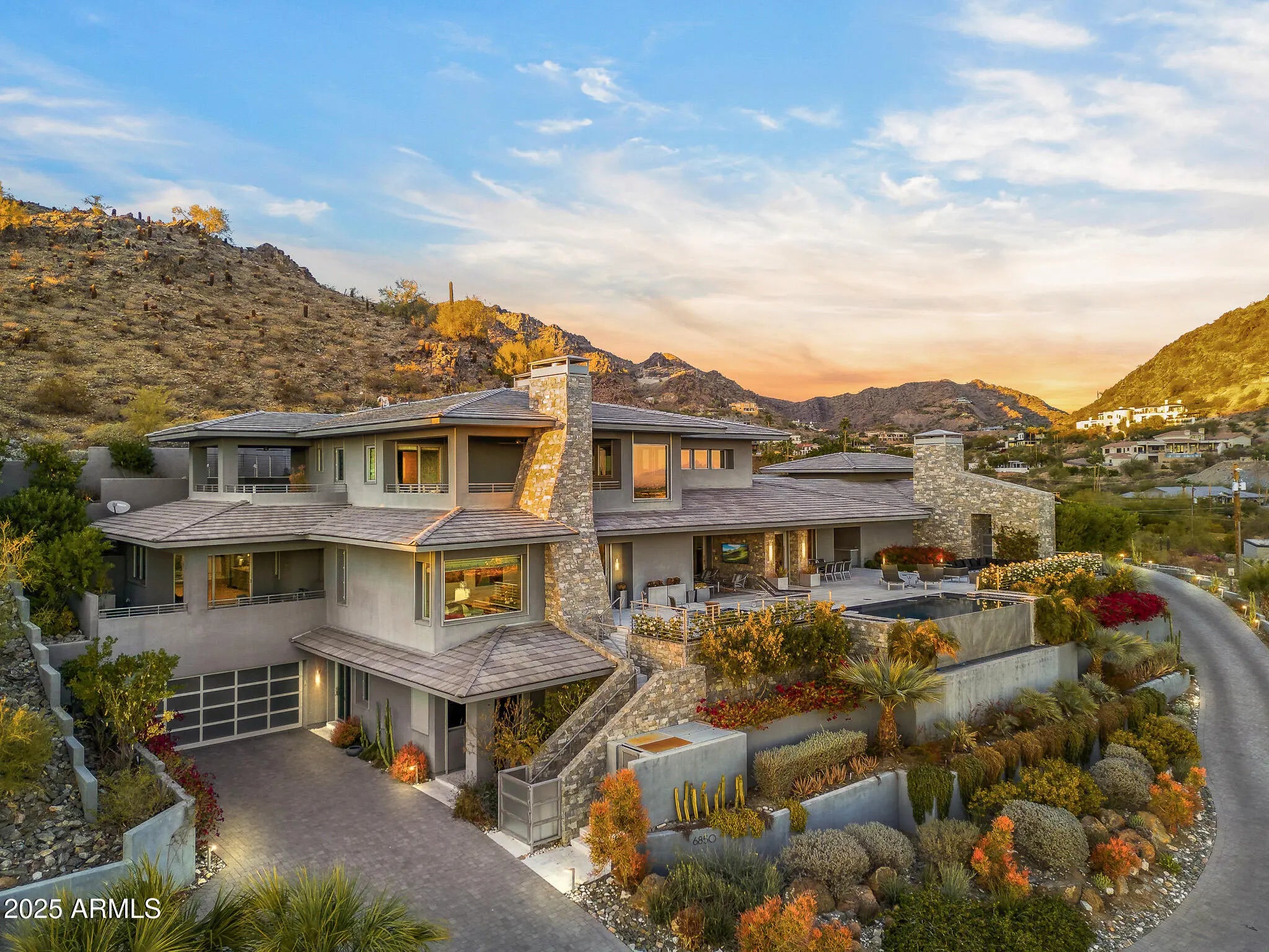 Set on 2.17 hillside acres, this extraordinary contemporary estate is perfectly designed to complement its stunning hillside location. With sweeping views of the valley, city lights, and Camelback Mountain, this home offers a rare combination of beauty and seclusion. Surrounded by native hillside and lush landscaping, the residence exudes masterful craftsmanship, from the intricate tilework to the hand-laid natural stone waterfall that cascades gracefully down the hillside. Designed for seamless indoor-outdoor living, the home maximizes its views from nearly every room. The great room, with its soaring 25-foot ceilings, is made for entertaining, featuring a striking Himalayan fossil stone fireplace and a sophisticated custom glass bar with under-lit accents.... ...The chef's kitchen is a dream, with a sprawling quartz waterfall island and top-tier appliances from Wolf, Sub-Zero, and Miele, including a 60" range with double ovens and a built-in Miele coffee/espresso machine. Expansive walls of glass doors open directly to the outdoor living areas, offering the best views of Camelback Mountain and the city. The outdoor spaces are perfect for entertaining, with shaded dining and living terraces equipped with heaters and a misting system, an infinity-edge pool, heated spa, sundeck, and a fire pit lounge. The luxurious master suite offers a spa-inspired bath with iceberg grey marble countertops, double vanities, and a TV in the mirror. The custom-designed his-and-hers closets are truly exceptional, featuring 11 electric clothes cabinets and built-in safes for each. Her closet includes a glamorous vanity with a Kallista makeup sink, a TV in the custom-lit mirror, and surrounding display cases. The three additional en-suite guest rooms each feature private balconies with beautiful valley views. The home also boasts a modern theater, a fully equipped gym, a putting green, a built-in BBQ, and a Celtic custom 3-floor elevator. The Crestron Automation System allows for easy control of A/V, lighting, shades, and the pool, while commercial-grade roller shutters ensure security when you're away. With two garages providing space for up to six cars, this estate is the perfect haven for both luxury living and privacy. Located within a guard-gated community, this exceptional home is just minutes from world-class shopping, dining, golf, and cultural attractions, offering the perfect blend of elegance, modern luxury, and serene seclusion.