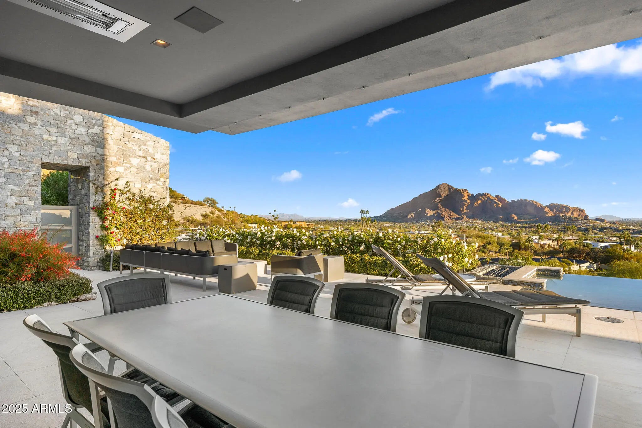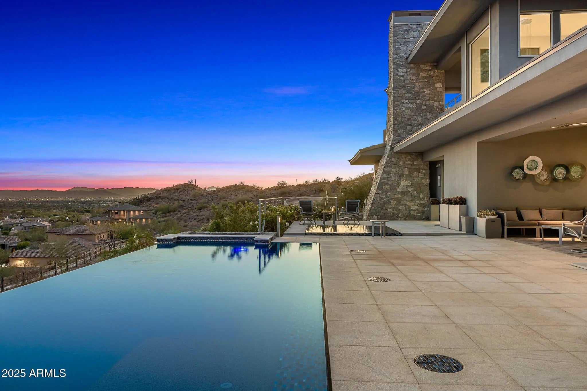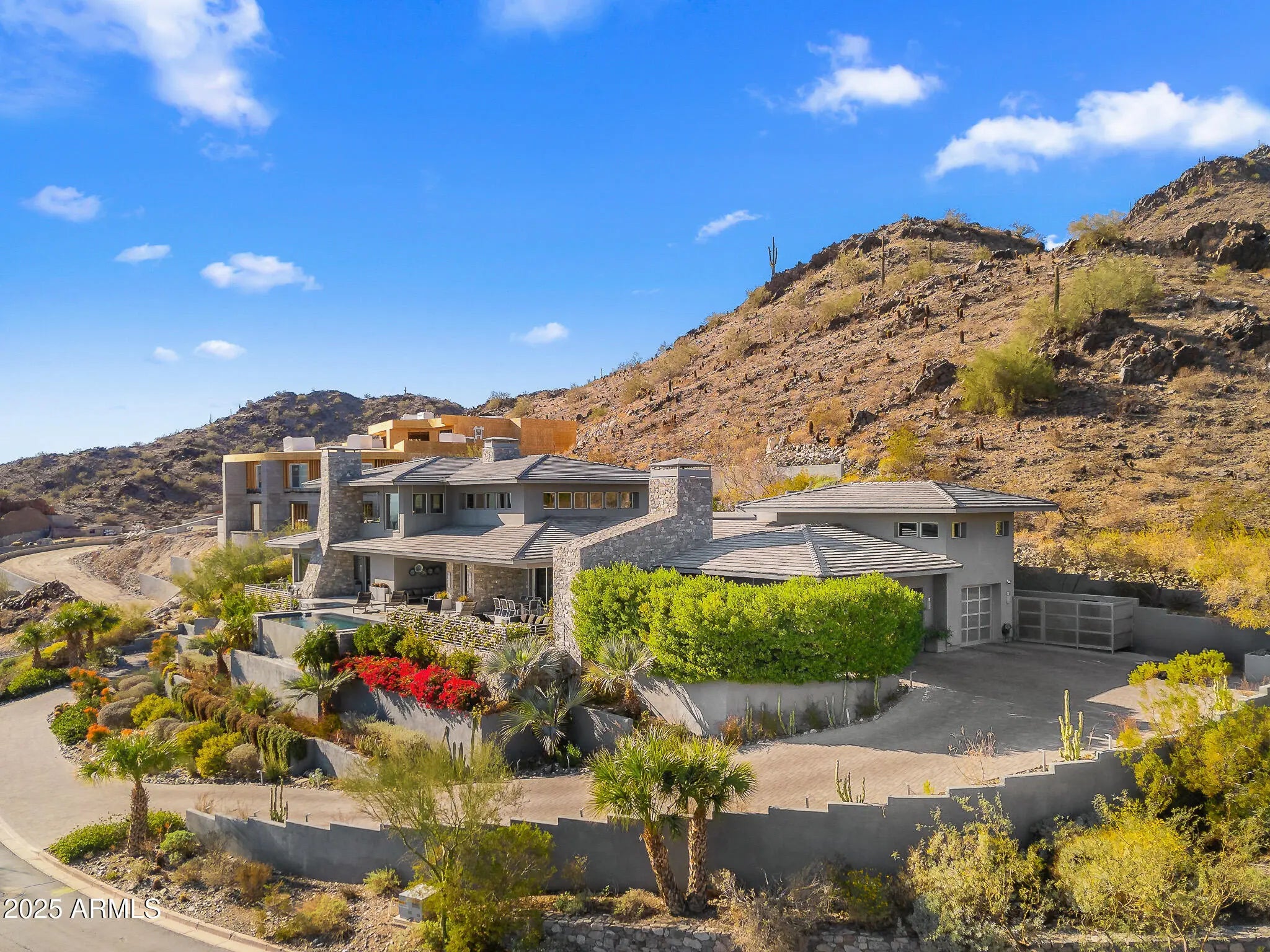 Set on 2.17 hillside acres, this extraordinary contemporary estate is perfectly designed to complement its stunning hillside location. With sweeping views of the valley, city lights, and Camelback Mountain, this home offers a rare combination of beauty and seclusion. Surrounded by native hillside and lush landscaping, the residence exudes masterful craftsmanship, from the intricate tilework to the hand-laid natural stone waterfall that cascades gracefully down the hillside. Designed for seamless indoor-outdoor living, the home maximizes its views from nearly every room. The great room, with its soaring 25-foot ceilings, is made for entertaining, featuring a striking Himalayan fossil stone fireplace and a sophisticated custom glass bar with under-lit accents.... ...The chef's kitchen is a dream, with a sprawling quartz waterfall island and top-tier appliances from Wolf, Sub-Zero, and Miele, including a 60" range with double ovens and a built-in Miele coffee/espresso machine. Expansive walls of glass doors open directly to the outdoor living areas, offering the best views of Camelback Mountain and the city. The outdoor spaces are perfect for entertaining, with shaded dining and living terraces equipped with heaters and a misting system, an infinity-edge pool, heated spa, sundeck, and a fire pit lounge. The luxurious master suite offers a spa-inspired bath with iceberg grey marble countertops, double vanities, and a TV in the mirror. The custom-designed his-and-hers closets are truly exceptional, featuring 11 electric clothes cabinets and built-in safes for each. Her closet includes a glamorous vanity with a Kallista makeup sink, a TV in the custom-lit mirror, and surrounding display cases. The three additional en-suite guest rooms each feature private balconies with beautiful valley views. The home also boasts a modern theater, a fully equipped gym, a putting green, a built-in BBQ, and a Celtic custom 3-floor elevator. The Crestron Automation System allows for easy control of A/V, lighting, shades, and the pool, while commercial-grade roller shutters ensure security when you're away. With two garages providing space for up to six cars, this estate is the perfect haven for both luxury living and privacy. Located within a guard-gated community, this exceptional home is just minutes from world-class shopping, dining, golf, and cultural attractions, offering the perfect blend of elegance, modern luxury, and serene seclusion.