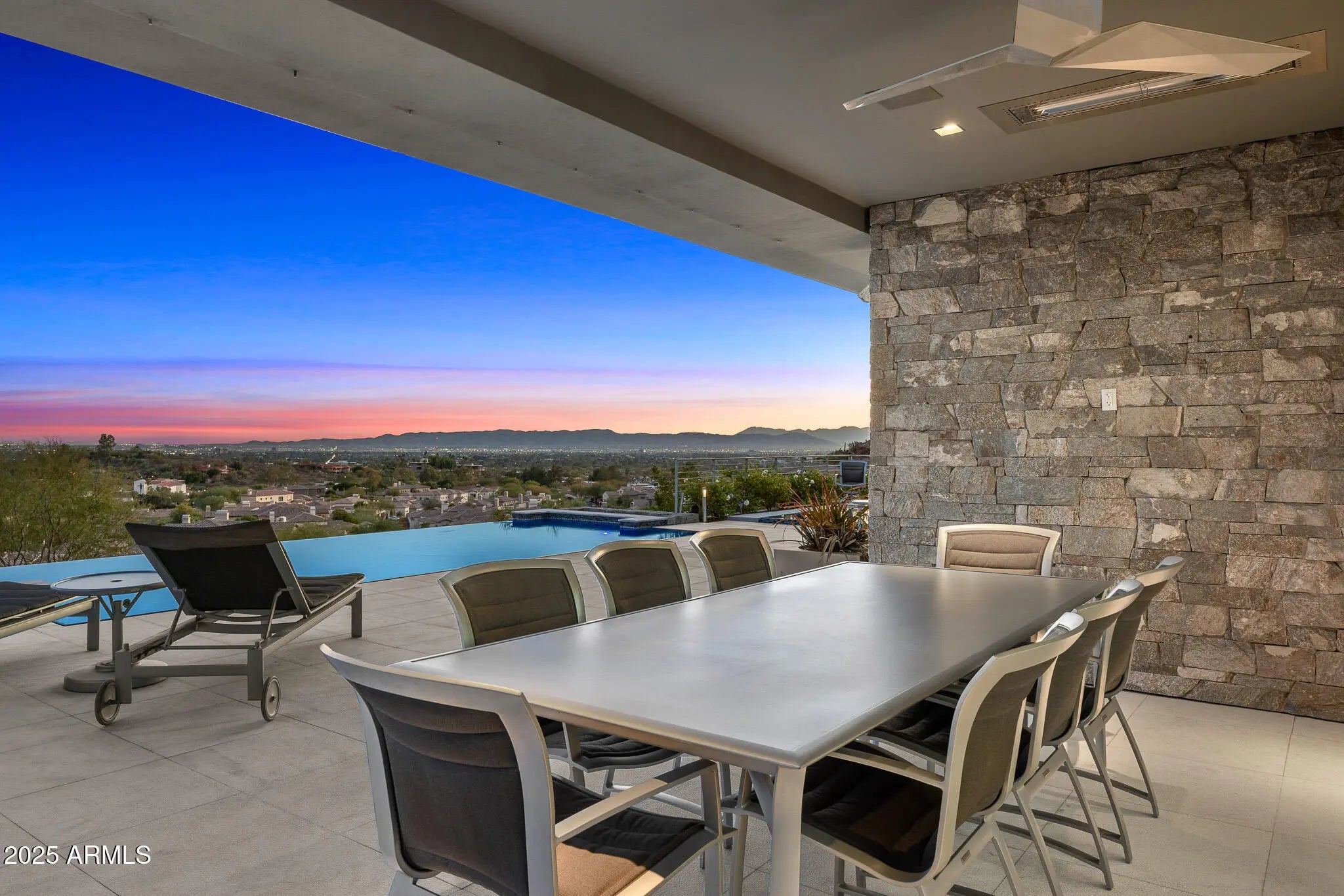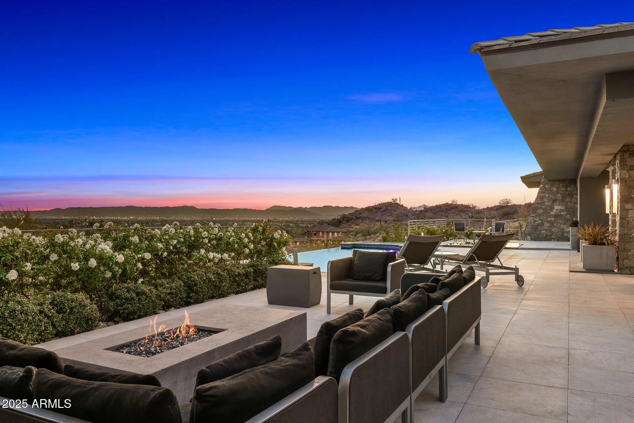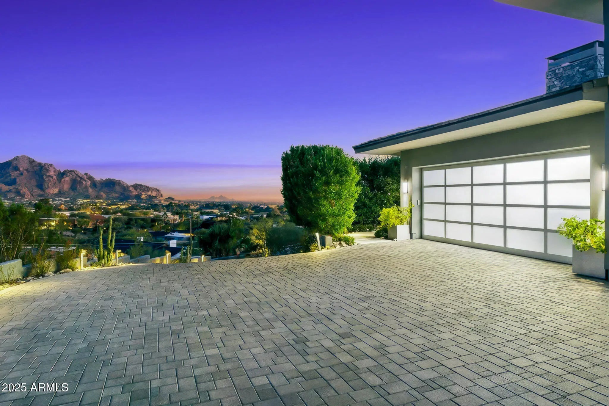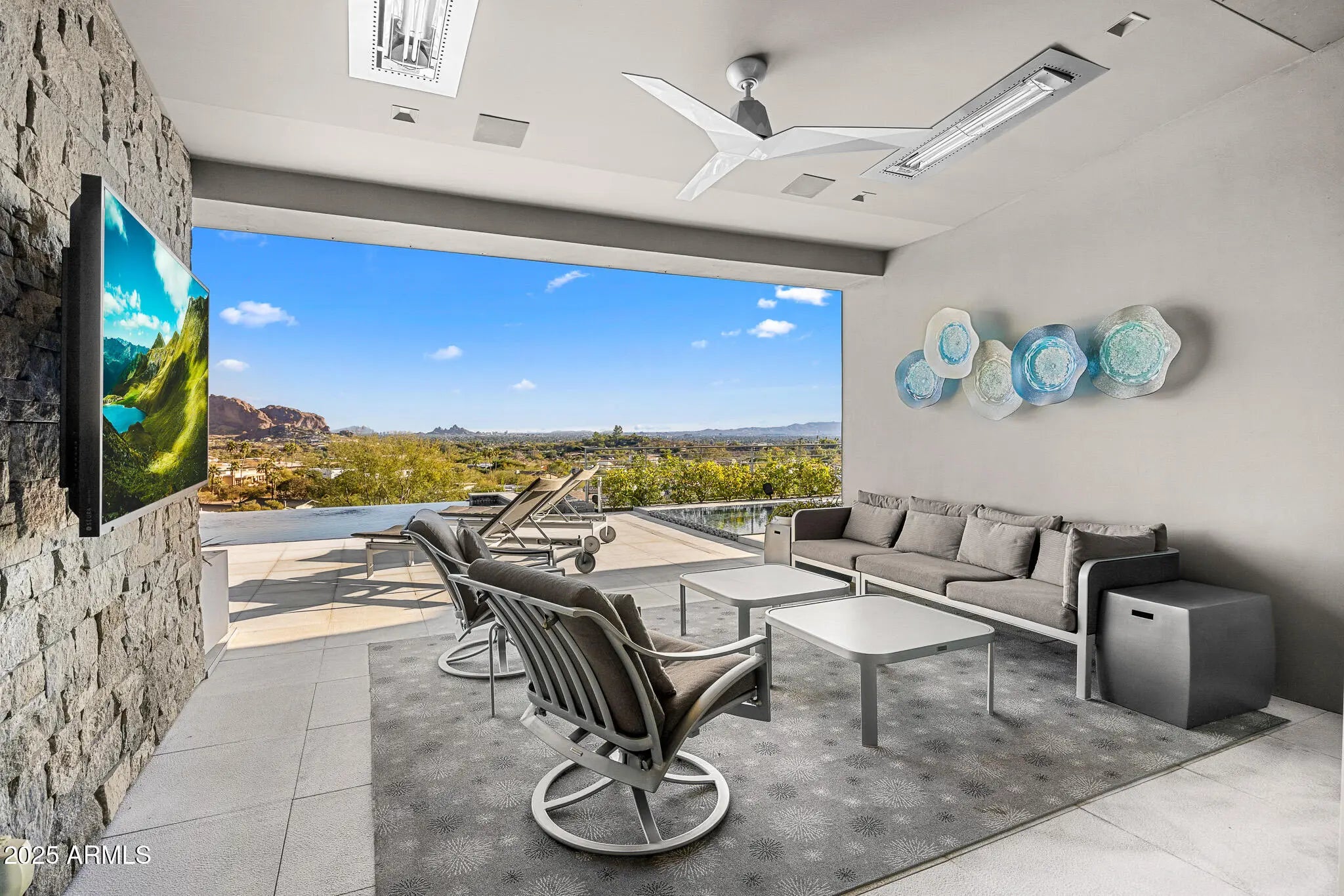 Set on 2.17 hillside acres, this extraordinary contemporary estate is perfectly designed to complement its stunning hillside location. With sweeping views of the valley, city lights, and Camelback Mountain, this home offers a rare combination of beauty and seclusion. Surrounded by native hillside and lush landscaping, the residence exudes masterful craftsmanship, from the intricate tilework to the hand-laid natural stone waterfall that cascades gracefully down the hillside. Designed for seamless indoor-outdoor living, the home maximizes its views from nearly every room. The great room, with its soaring 25-foot ceilings, is made for entertaining, featuring a striking Himalayan fossil stone fireplace and a sophisticated custom glass bar with under-lit accents.... ...The chef's kitchen is a dream, with a sprawling quartz waterfall island and top-tier appliances from Wolf, Sub-Zero, and Miele, including a 60" range with double ovens and a built-in Miele coffee/espresso machine. Expansive walls of glass doors open directly to the outdoor living areas, offering the best views of Camelback Mountain and the city. The outdoor spaces are perfect for entertaining, with shaded dining and living terraces equipped with heaters and a misting system, an infinity-edge pool, heated spa, sundeck, and a fire pit lounge. The luxurious master suite offers a spa-inspired bath with iceberg grey marble countertops, double vanities, and a TV in the mirror. The custom-designed his-and-hers closets are truly exceptional, featuring 11 electric clothes cabinets and built-in safes for each. Her closet includes a glamorous vanity with a Kallista makeup sink, a TV in the custom-lit mirror, and surrounding display cases. The three additional en-suite guest rooms each feature private balconies with beautiful valley views. The home also boasts a modern theater, a fully equipped gym, a putting green, a built-in BBQ, and a Celtic custom 3-floor elevator. The Crestron Automation System allows for easy control of A/V, lighting, shades, and the pool, while commercial-grade roller shutters ensure security when you're away. With two garages providing space for up to six cars, this estate is the perfect haven for both luxury living and privacy. Located within a guard-gated community, this exceptional home is just minutes from world-class shopping, dining, golf, and cultural attractions, offering the perfect blend of elegance, modern luxury, and serene seclusion.