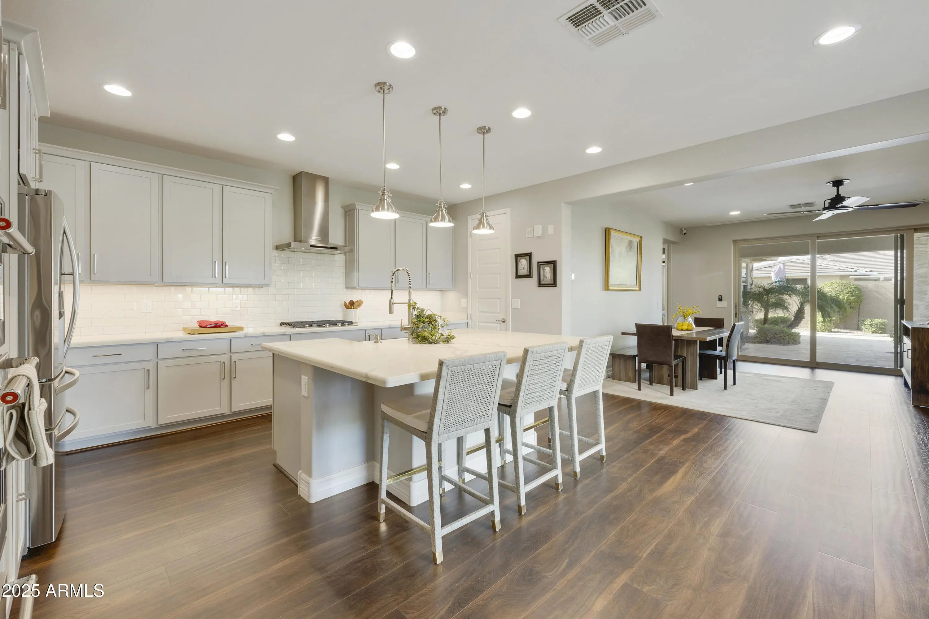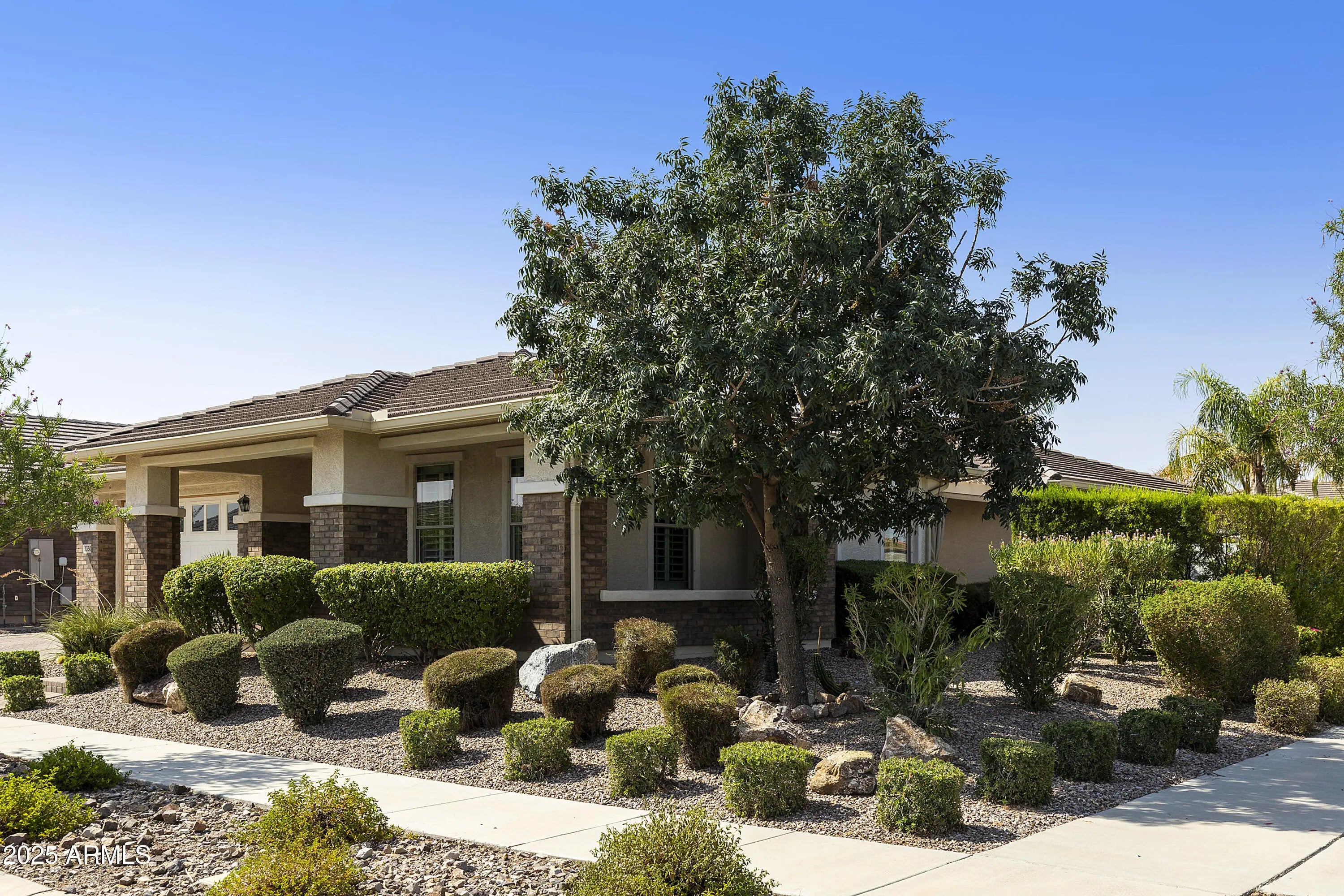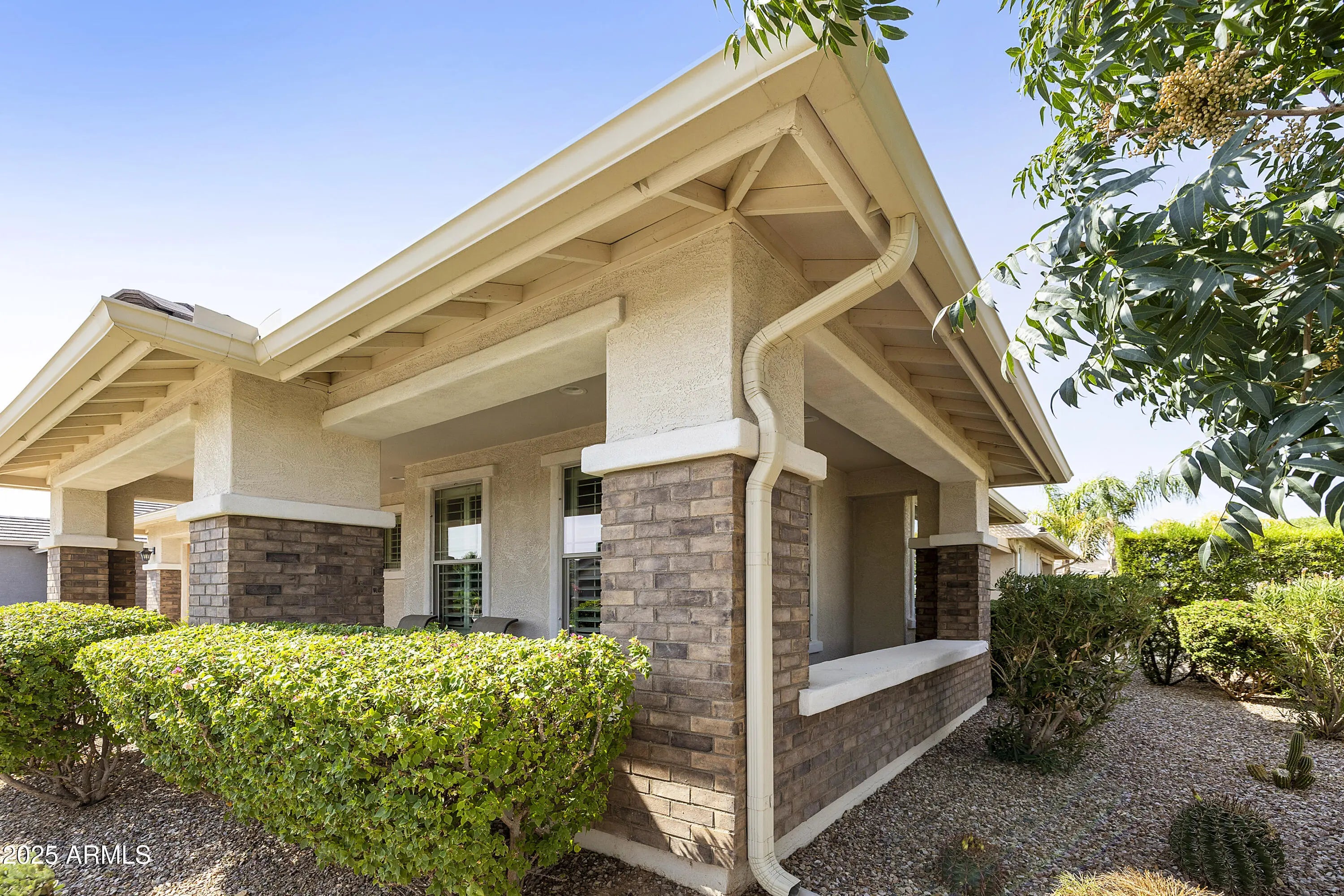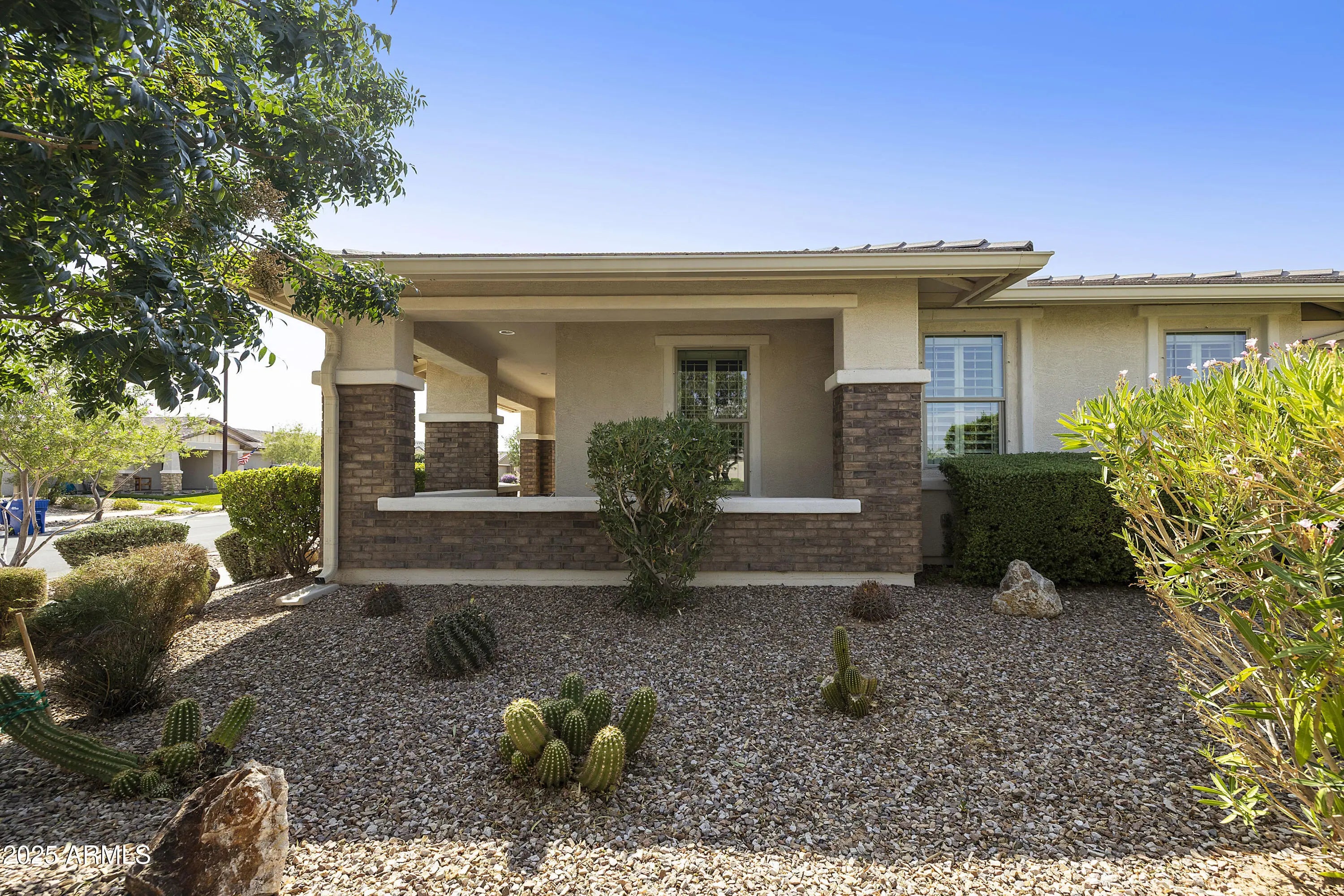 This hard to find 3 bed/2.5 baths home offers the ideal living experience for those seeking active adult living. The expanded Sydney floor plan provides 2 private en-suite baths along with a third bdrm, & den, complemented by a spacious great rm. The chef's kitchen is a standout feature, equipped with KitchenAid SS appliances including wall ovens, a gas cook-top, & a wall-mounted hood. The well-appointed kitchen has 42'' shaker cabinets, subway tile backsplash & pendant lights. The lg island with seating boasts quartz countertops, farm sink, pro-style flex faucet providing ample prep & gathering space. The W-I pantry adds to the kitchen's functionality and storage. Throughout the home, you'll find numerous upgrades, such as 2 multi-sliders (one off the kitchen looking onto the courtyard.. & one off the great room), 8-foot shaker doors, shutters, 5.25-inch baseboards, & engineered wood floors, creating a cohesive & refined aesthetic. Stepping outside, the extended covered patio & spa with steps & storage offers a serene outdoor living space, while the courtyard off the kitchen showcases a pergola & a privacy hedge, providing a lush and private setting. The 2.5-car garage with an epoxy floor, storage cabinets, and overhead storage completes this exceptional property, located on a premium corner lot. You will enjoy the amenities of Encore at Eastmark. Clubhouse with workout facility, movement room, billiards, craft room with 2 kilns, card room, meeting room, Proving Ground Café, pickle ball, tennis and Bocci ball. Something for everyone!! This is a MUST SEE!