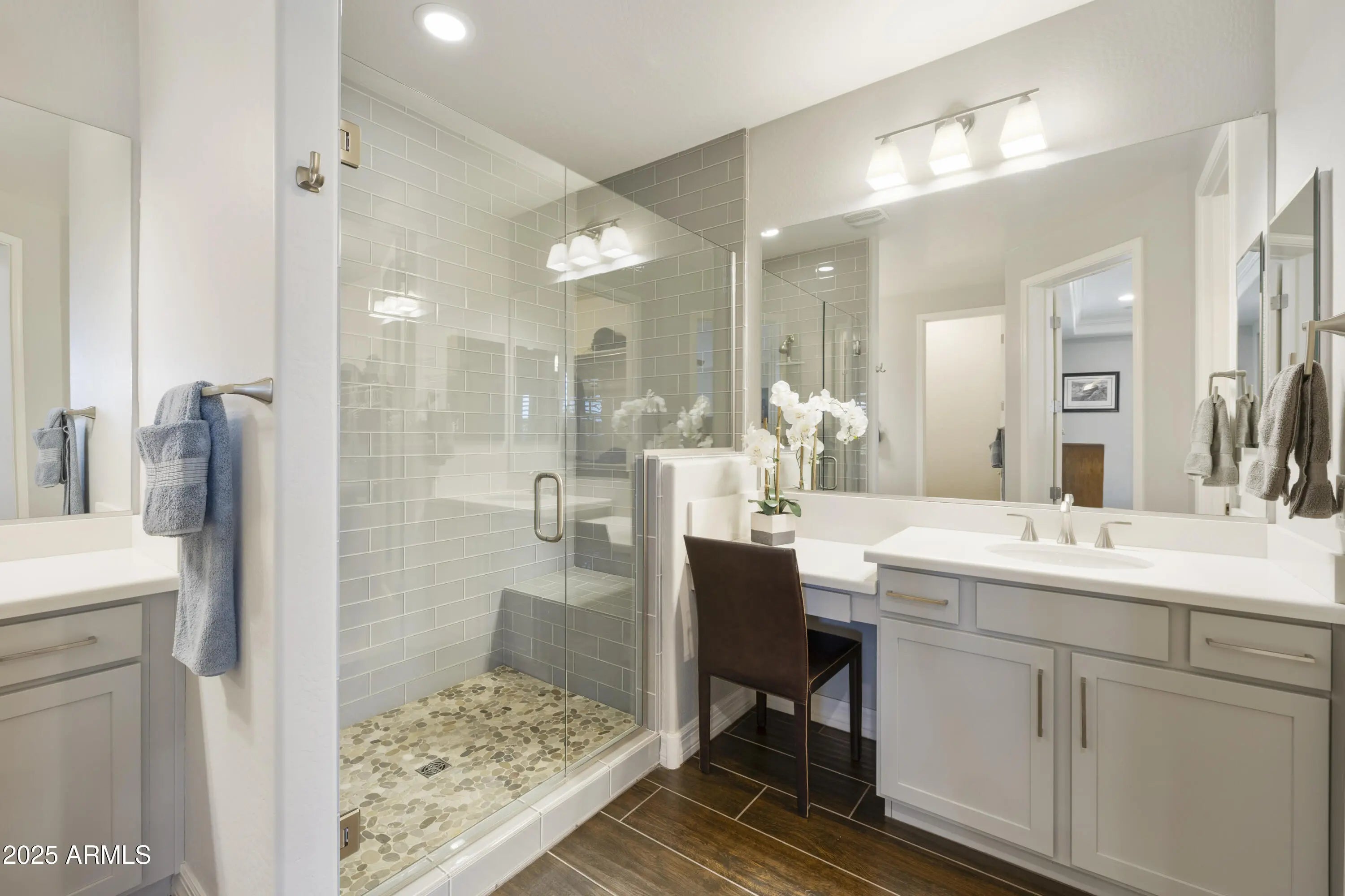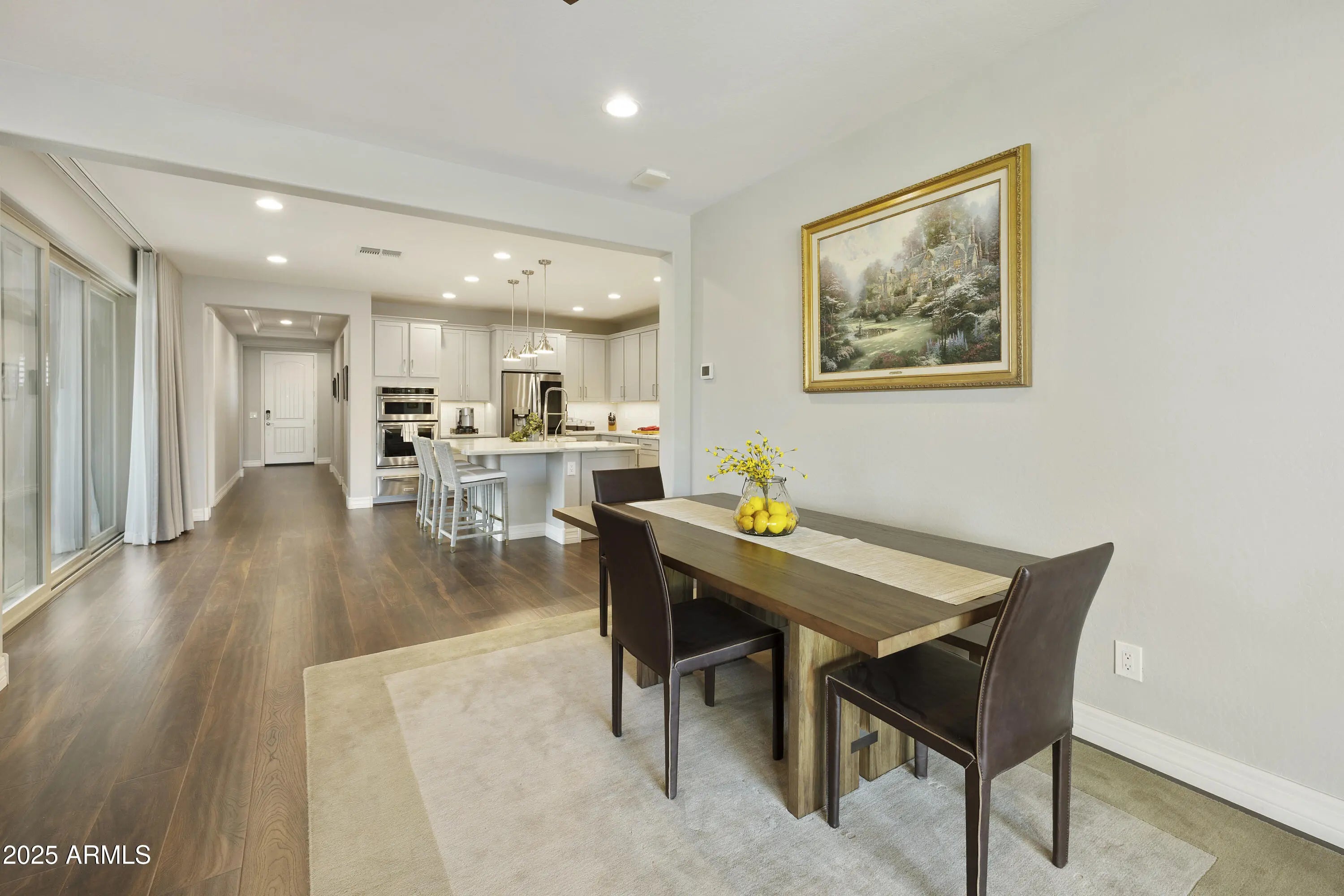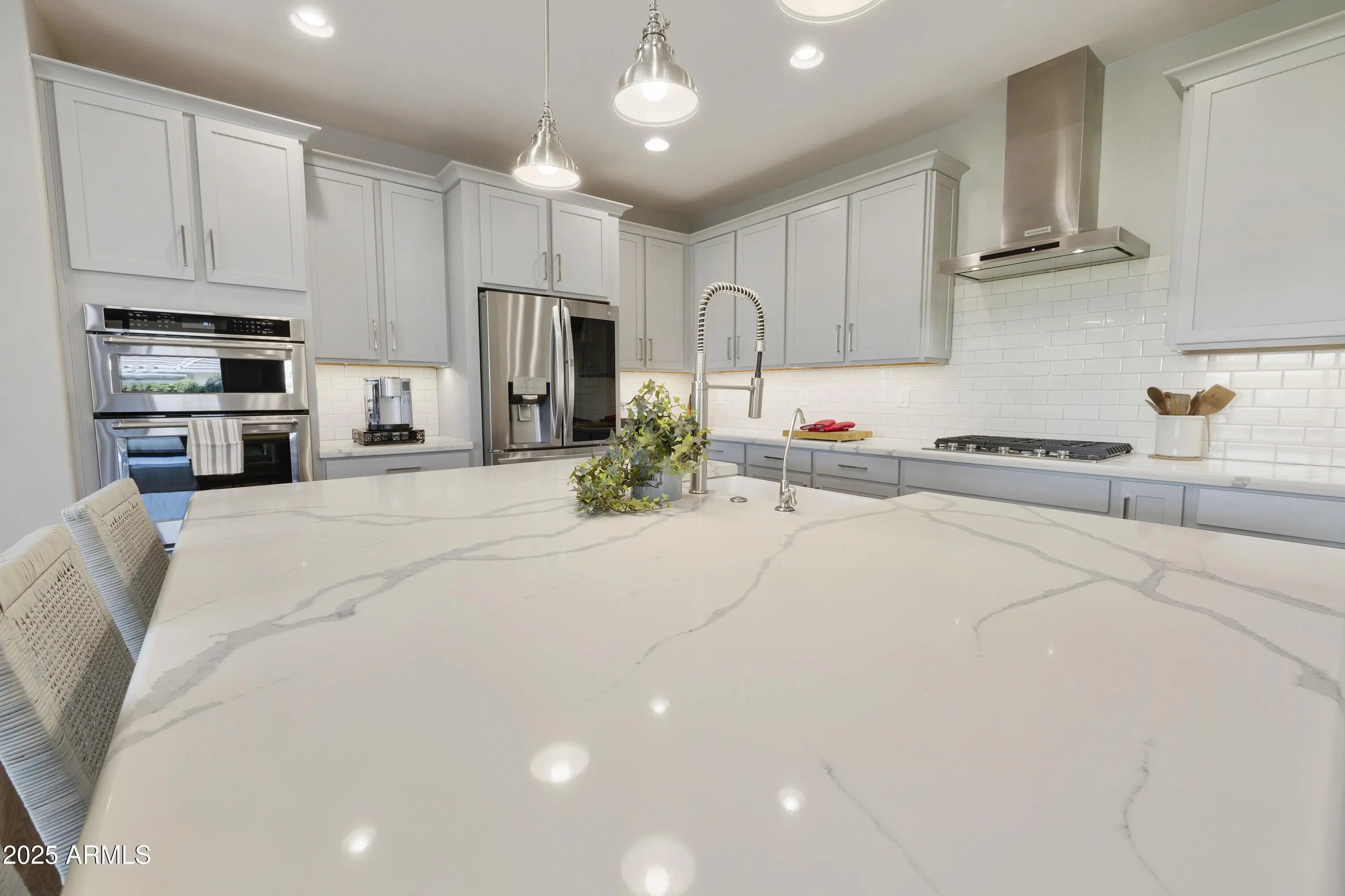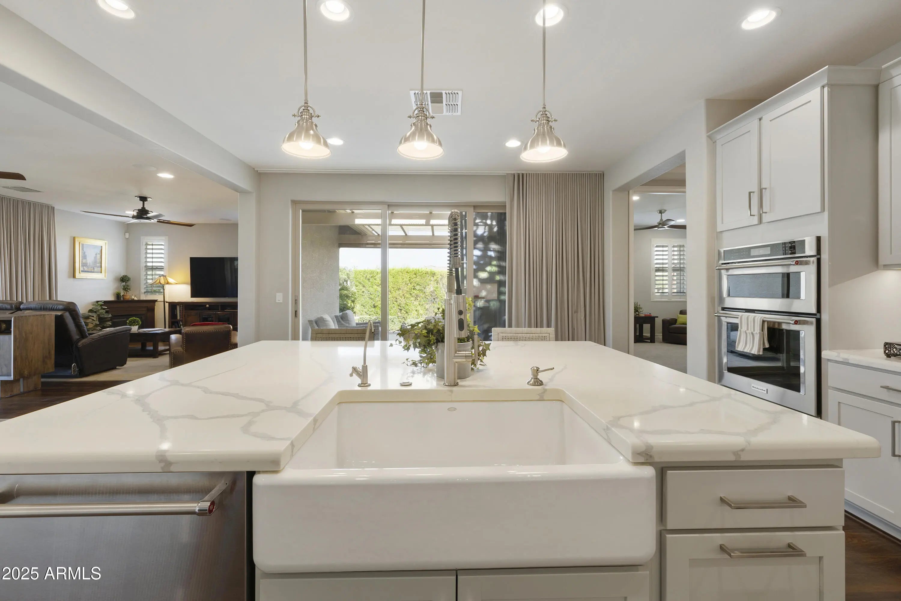 This hard to find 3 bed/2.5 baths home offers the ideal living experience for those seeking active adult living. The expanded Sydney floor plan provides 2 private en-suite baths along with a third bdrm, & den, complemented by a spacious great rm. The chef's kitchen is a standout feature, equipped with KitchenAid SS appliances including wall ovens, a gas cook-top, & a wall-mounted hood. The well-appointed kitchen has 42'' shaker cabinets, subway tile backsplash & pendant lights. The lg island with seating boasts quartz countertops, farm sink, pro-style flex faucet providing ample prep & gathering space. The W-I pantry adds to the kitchen's functionality and storage. Throughout the home, you'll find numerous upgrades, such as 2 multi-sliders (one off the kitchen looking onto the courtyard.. & one off the great room), 8-foot shaker doors, shutters, 5.25-inch baseboards, & engineered wood floors, creating a cohesive & refined aesthetic. Stepping outside, the extended covered patio & spa with steps & storage offers a serene outdoor living space, while the courtyard off the kitchen showcases a pergola & a privacy hedge, providing a lush and private setting. The 2.5-car garage with an epoxy floor, storage cabinets, and overhead storage completes this exceptional property, located on a premium corner lot. You will enjoy the amenities of Encore at Eastmark. Clubhouse with workout facility, movement room, billiards, craft room with 2 kilns, card room, meeting room, Proving Ground Café, pickle ball, tennis and Bocci ball. Something for everyone!! This is a MUST SEE!