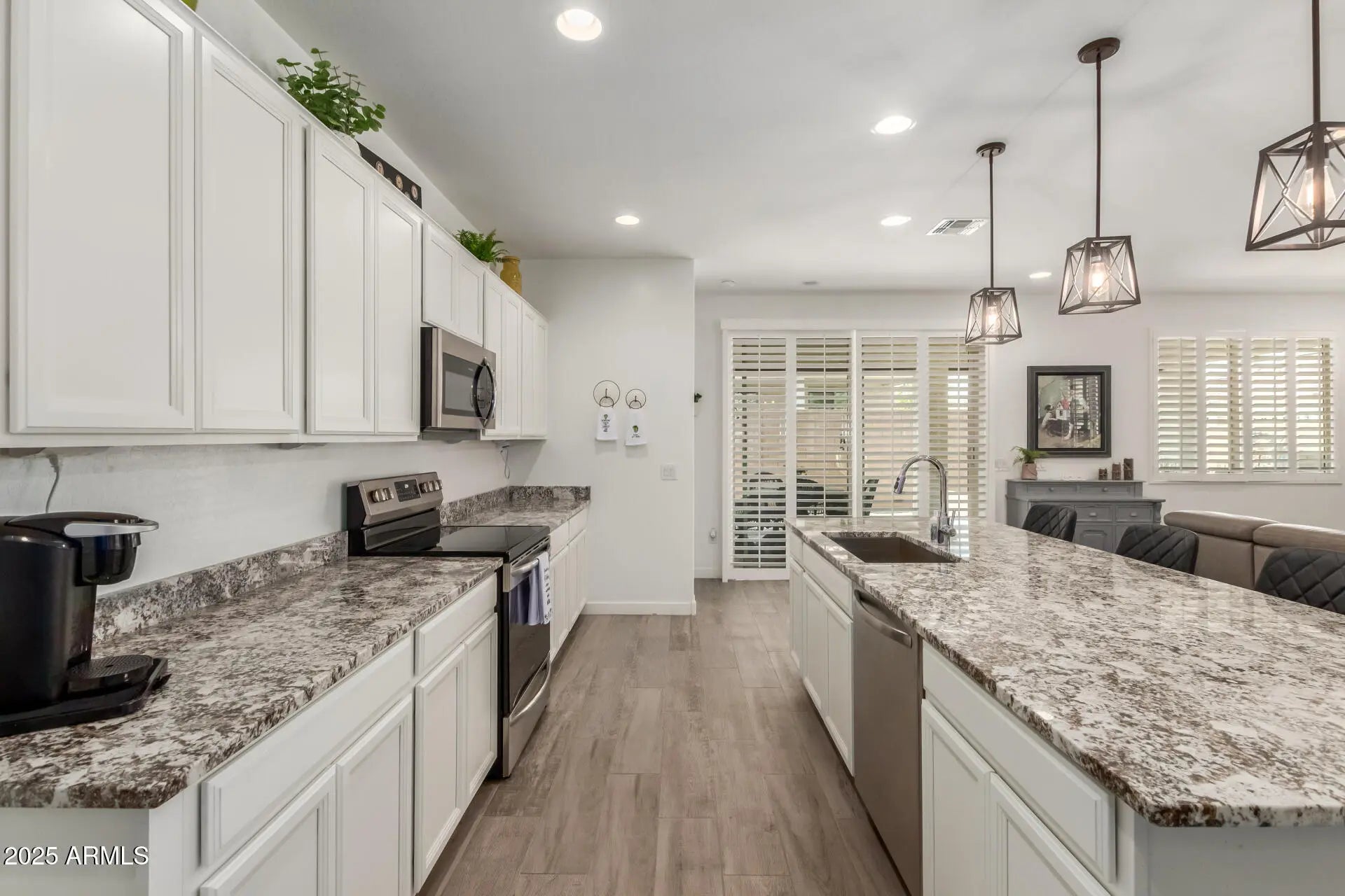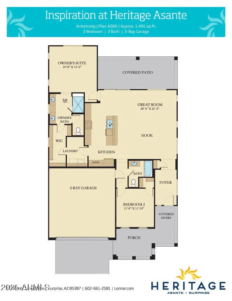 Beautifully Upgraded and Move In Ready Home in Heritage at Asante! Premium Corner Lot on Quiet Street. Enjoy being outdoors on the front porch and Lovely Backyard that is upgraded with pavers, an extended patio, turf, and Custom motorized sun and privacy shades. Inside you will find a popular Great Room plan with two split bedrooms, both with walk in closets. Plantation Shutters on all windows including door to patio, stylish lighting, premium 8'' x 35'' wood plank tile flooring throughout, 8' interior doors, Granite counters in kitchen, double pull out shelves at cabinets and pantry. The garage has coated flooring, built in storage cabinets, and a high end Hyperion Elite Premium water softener and system. Living in Heritage at Asante feels like a vacation every day. The luxurious amenities include gorgeously appointed clubhouse surrounded by mountain views and water, resort-style pool, patios, grill area, pickleball courts, putting course, fitness center, and more.