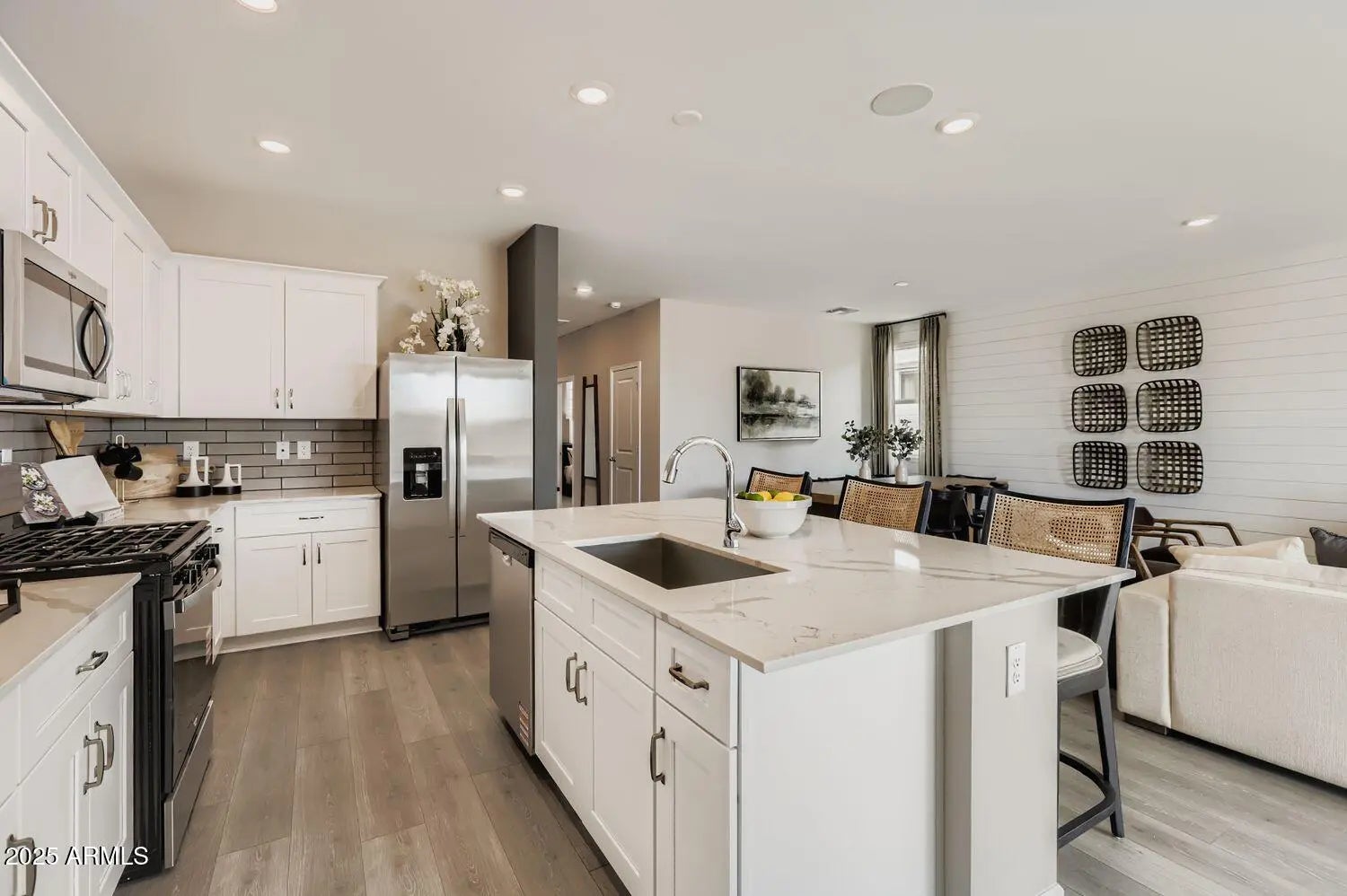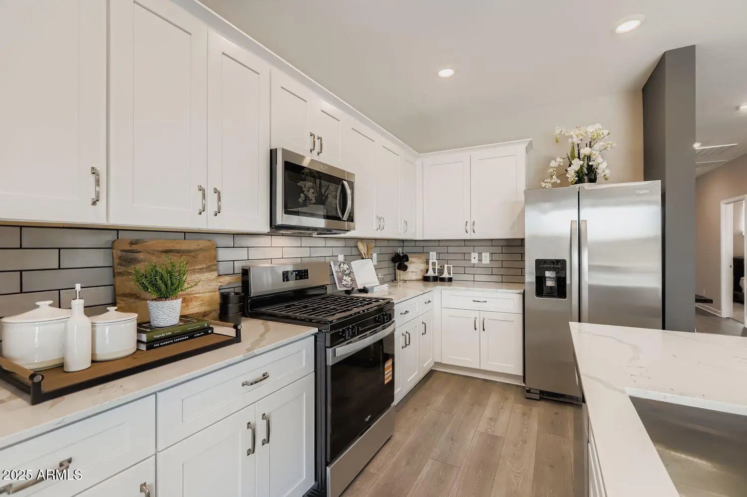 The Horizon floorplan offers exceptional living space and flexibility! The main home features 4 bedrooms and 3 bathrooms, plus a detached Casita with its own bedroom and bath, perfect for parents, extended family, or visiting guests. Step inside through the foyer into a bright, open great room/dining/kitchen area. The kitchen is a showstopper with quartz countertops, full tile backsplash, stainless steel Whirlpool appliances (including a gas range, built-in microwave, and dishwasher), a large center island, double-door pantry, and abundant cabinetry. The oversized owner's suite features a spacious walk-in closet and a luxurious bath with dual vanities, walk-in shower, and a linen closet. Located near community parks and walking trails!