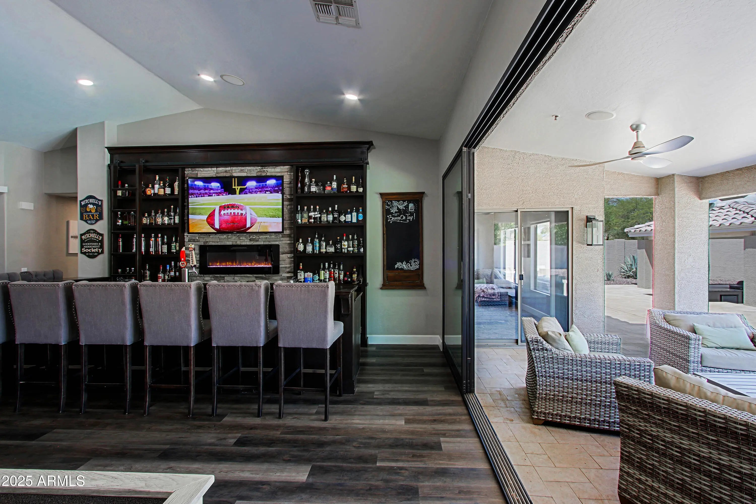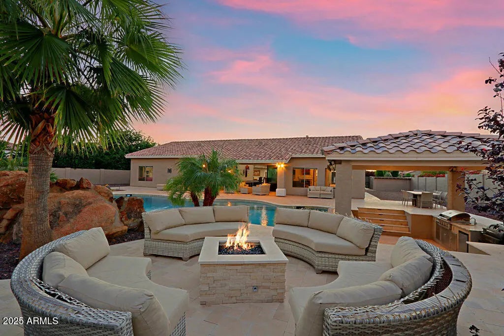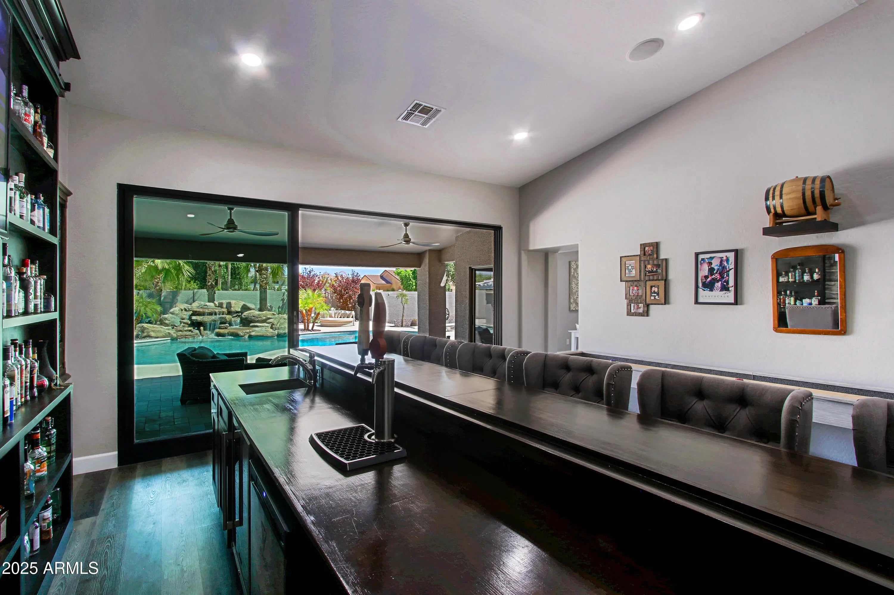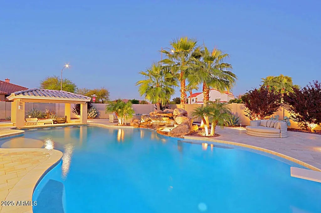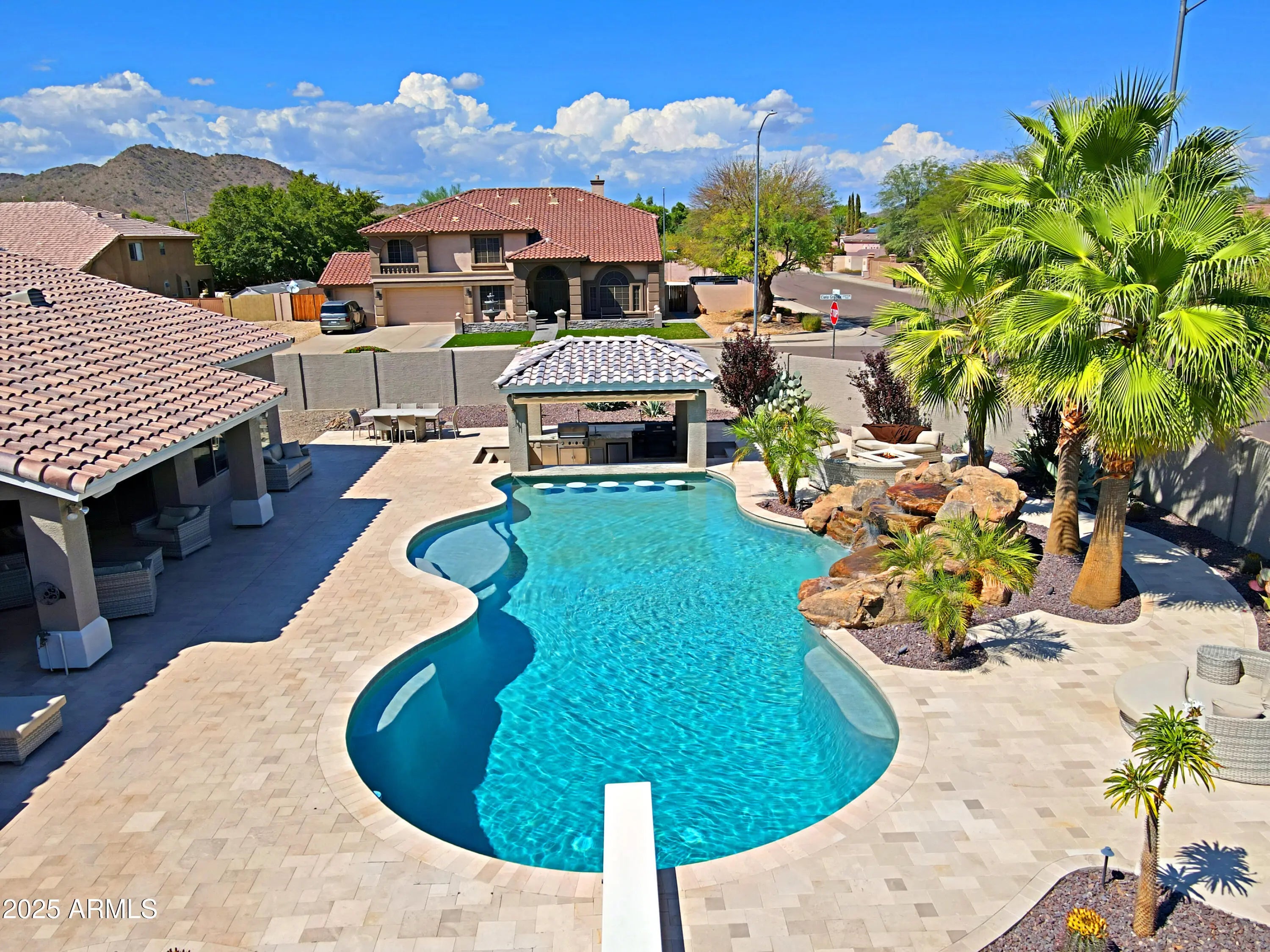 Experience Resort Style Living! Panoramic sliding doors reveal stunning waterfall flowing into heated diving pool w swim up bar to outdoor kitchen pavilion. Continuing indoors, gathering room has custom wet bar w built-ins & kegerator. Spacious kitchen has 6-burner gas range, marble counters + oversized island seats 4 and overlooks family room w fireplace. Relax in the primary bedroom w sitting area & fireplace. Primary bath features immersive walk-in shower, freestanding soaking tub & sizable custom closet. En suite sanctuary is perfect for long term guests. 3 additional bedrooms & all baths upgraded. See full features list for details on this masterpiece! Close to fine dining, HOA allows & lot has room for 20 x 35 RV garage, If the bar is not your style, check out the AI image removal.