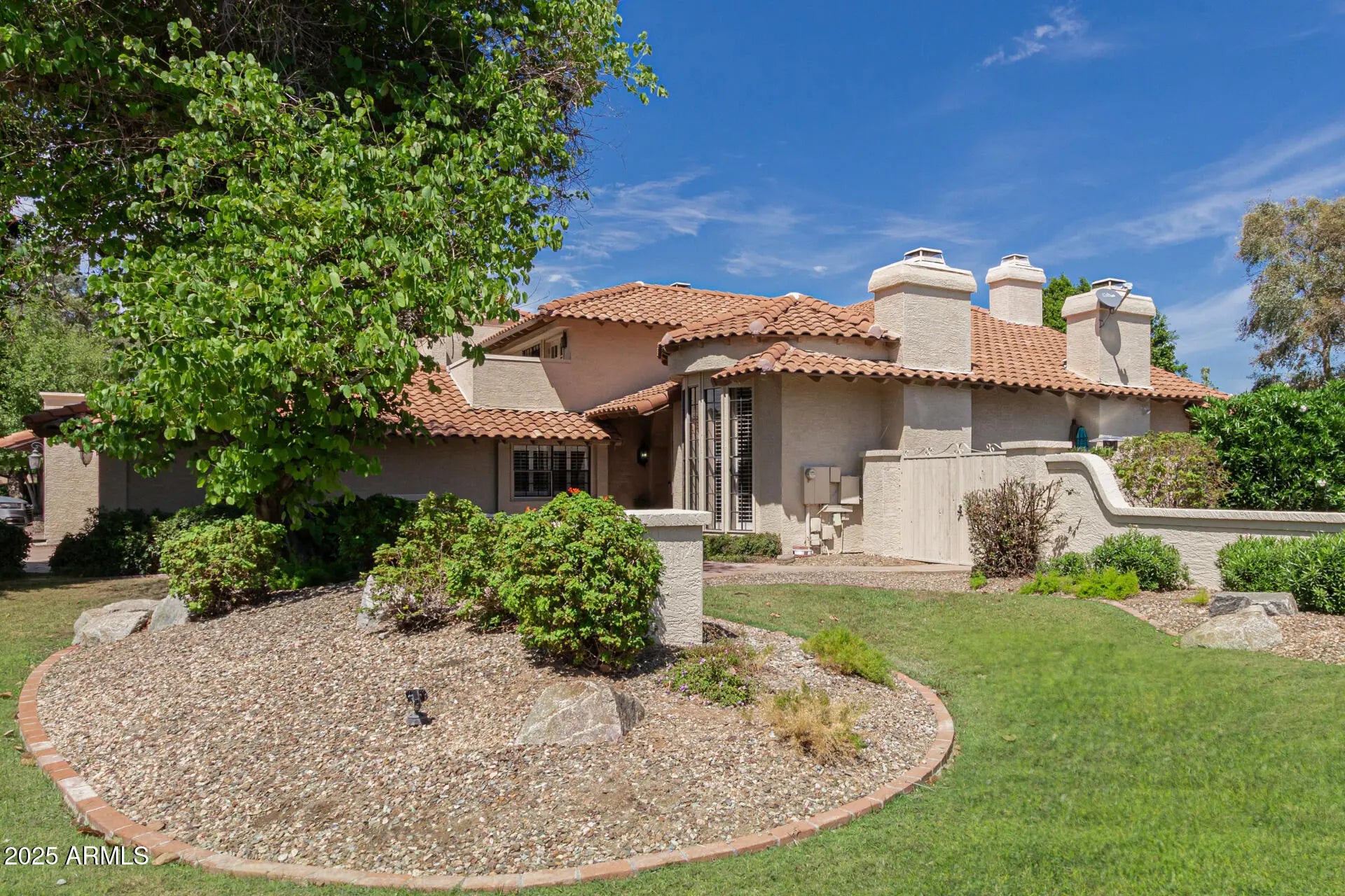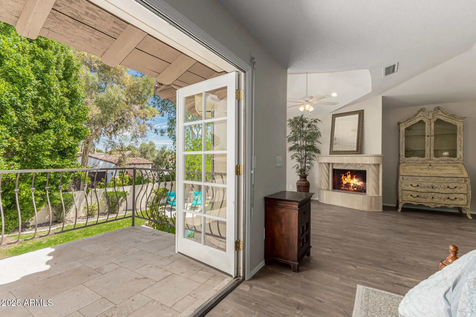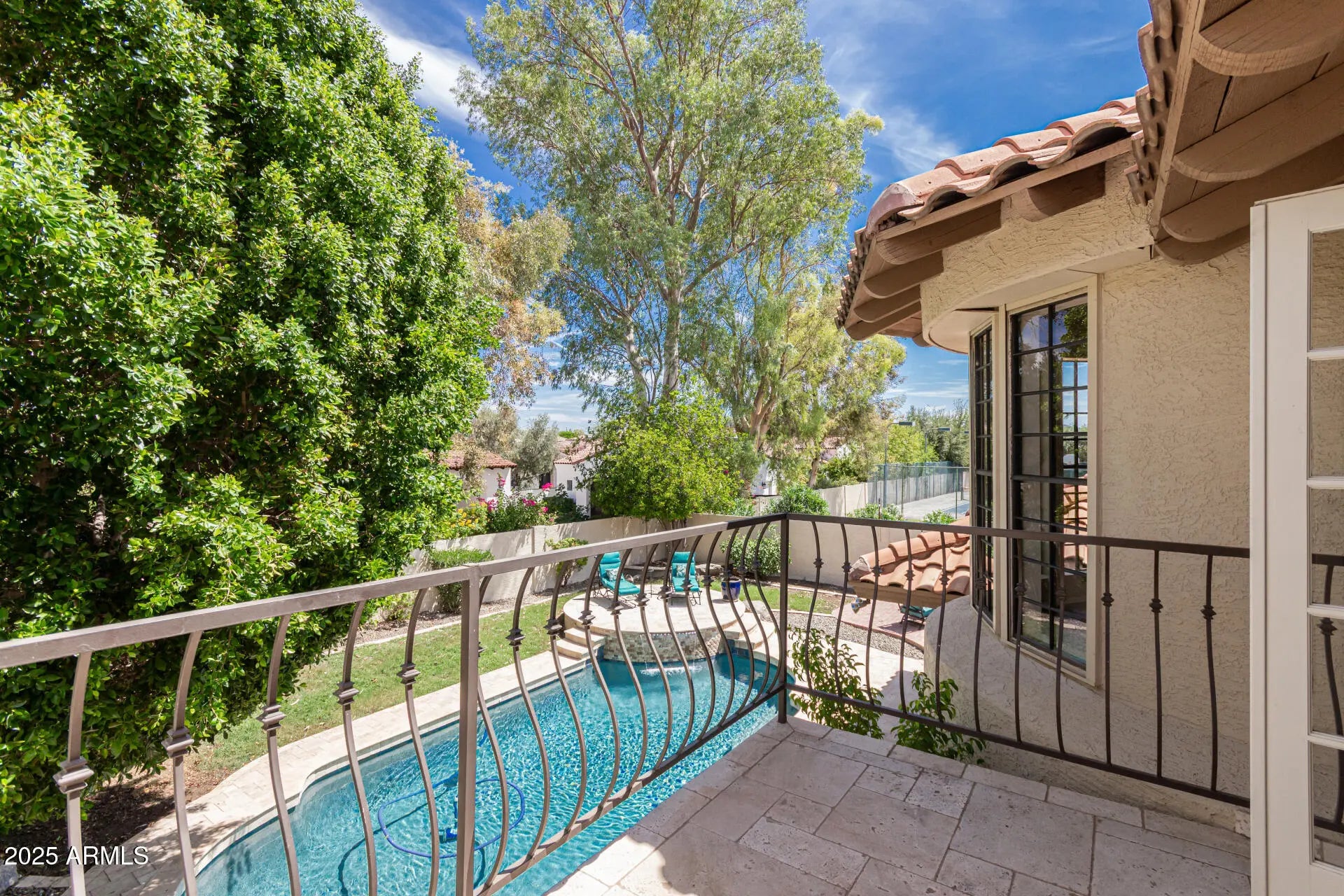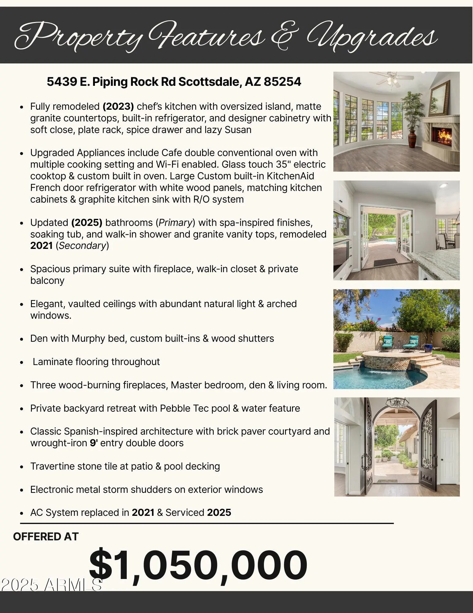 Nestled behind the gates of Las Colonias, an exclusive 22-home enclave, this residence embodies privacy, prestige, and timeless architecture. From the moment you arrive, the charm of Spanish-inspired design welcomes you with tile roofing, a brick-paver courtyard, and striking 9-foot wrought iron doors that set the tone for what lies within. Inside, soaring vaulted ceilings and expansive windows flood the home with natural light, highlighting the balance of old-world character and modern updates. The centerpiece is a fully remodeled chef's kitchen, boasting matte granite countertops, an oversized island, designer backsplash, built-in refrigerator, and custom cabinetry. The layout flows seamlessly into open living areas with three wood-burning fireplaces, creating inviting spaces for both entertaining and everyday living. The versatile den offers built-in cabinetry and a Murphy bed, while throughout the home, updated laminate flooring ties each space together with warmth and sophistication. Retreat to the luxurious primary suite, complete with a fully remodeled spa-like bathroom featuring dual vanities, a soaking tub, walk-in shower, and an oversized closet. French doors open to a private balcony overlooking the backyard, where a Pebble Tec pool and cascading water feature create a serene retreat. With its combination of classic Santa Barbara architecture, modern design, and resort-style amenities, all set within the highly coveted Magic Zip Code 85254where Scottsdale prestige meets Phoenix services and Paradise Valley schoolsthis home is a rare opportunity in one of the Valley's most desirable gated communities.