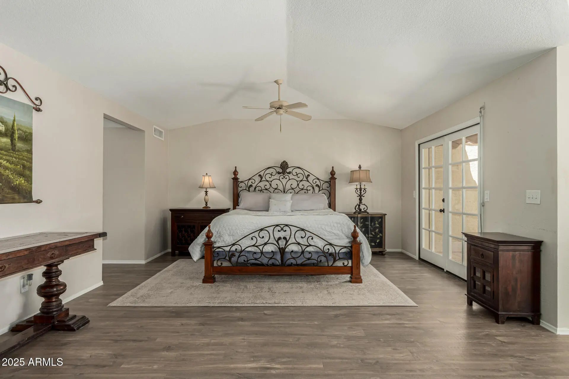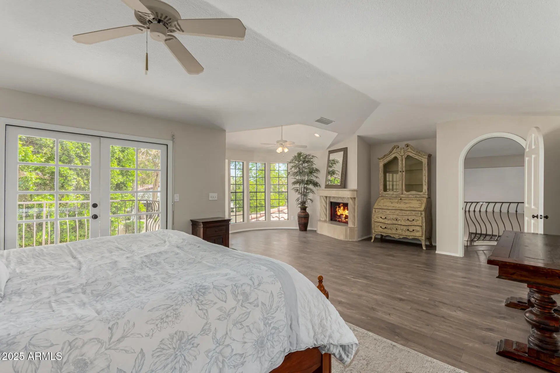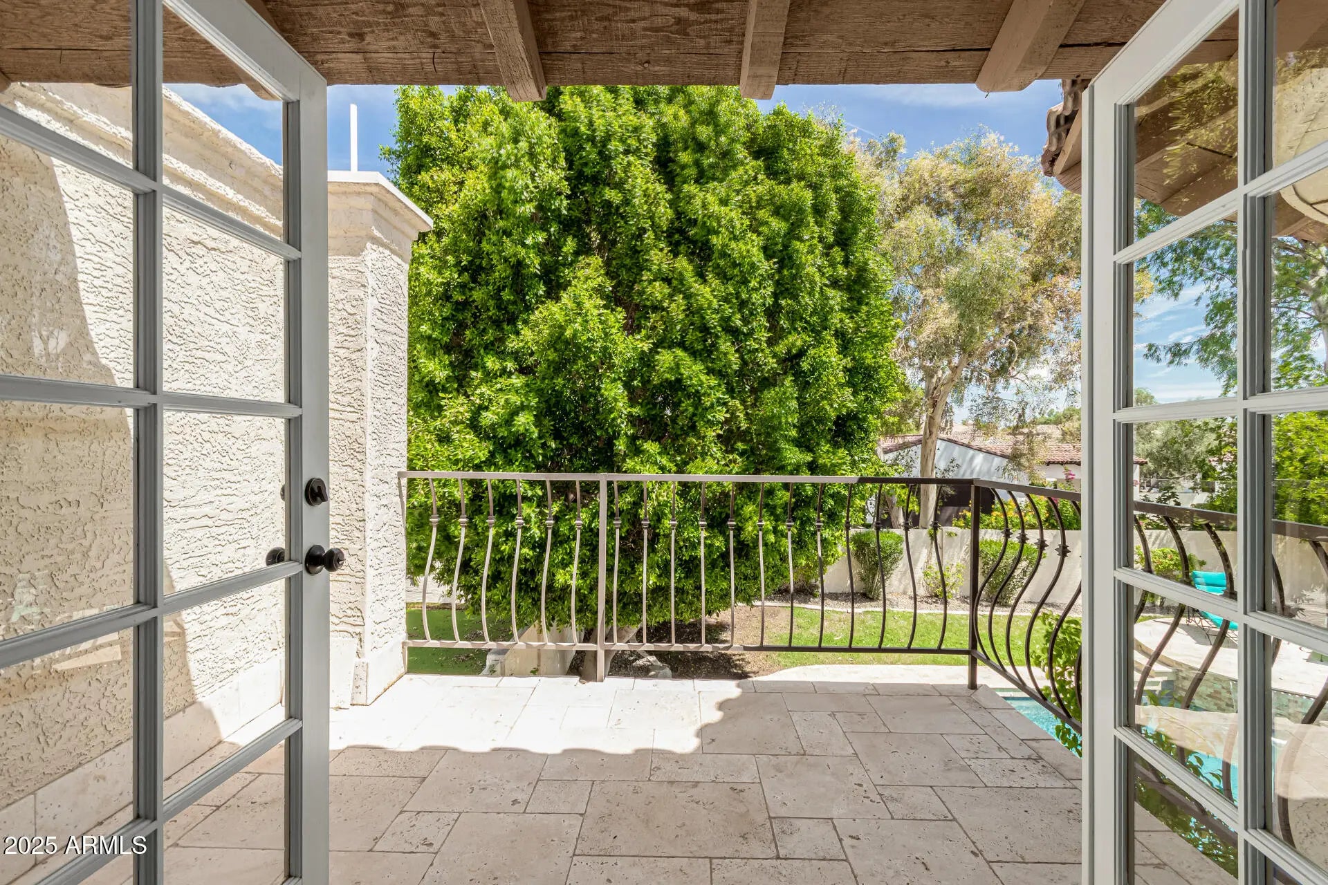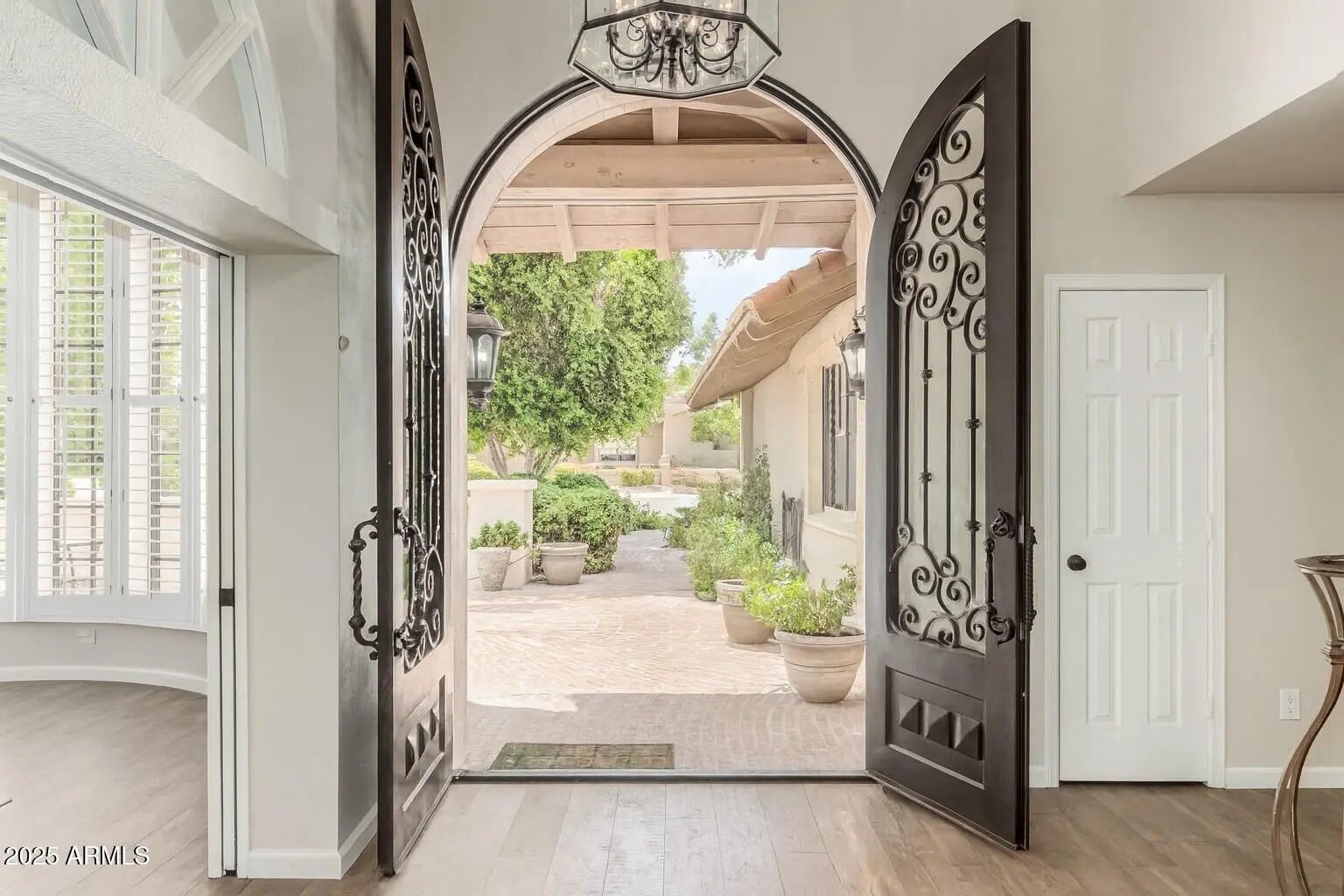 Nestled behind the gates of Las Colonias, an exclusive 22-home enclave, this residence embodies privacy, prestige, and timeless architecture. From the moment you arrive, the charm of Spanish-inspired design welcomes you with tile roofing, a brick-paver courtyard, and striking 9-foot wrought iron doors that set the tone for what lies within. Inside, soaring vaulted ceilings and expansive windows flood the home with natural light, highlighting the balance of old-world character and modern updates. The centerpiece is a fully remodeled chef's kitchen, boasting matte granite countertops, an oversized island, designer backsplash, built-in refrigerator, and custom cabinetry. The layout flows seamlessly into open living areas with three wood-burning fireplaces, creating inviting spaces for both entertaining and everyday living. The versatile den offers built-in cabinetry and a Murphy bed, while throughout the home, updated laminate flooring ties each space together with warmth and sophistication. Retreat to the luxurious primary suite, complete with a fully remodeled spa-like bathroom featuring dual vanities, a soaking tub, walk-in shower, and an oversized closet. French doors open to a private balcony overlooking the backyard, where a Pebble Tec pool and cascading water feature create a serene retreat. With its combination of classic Santa Barbara architecture, modern design, and resort-style amenities, all set within the highly coveted Magic Zip Code 85254where Scottsdale prestige meets Phoenix services and Paradise Valley schoolsthis home is a rare opportunity in one of the Valley's most desirable gated communities.