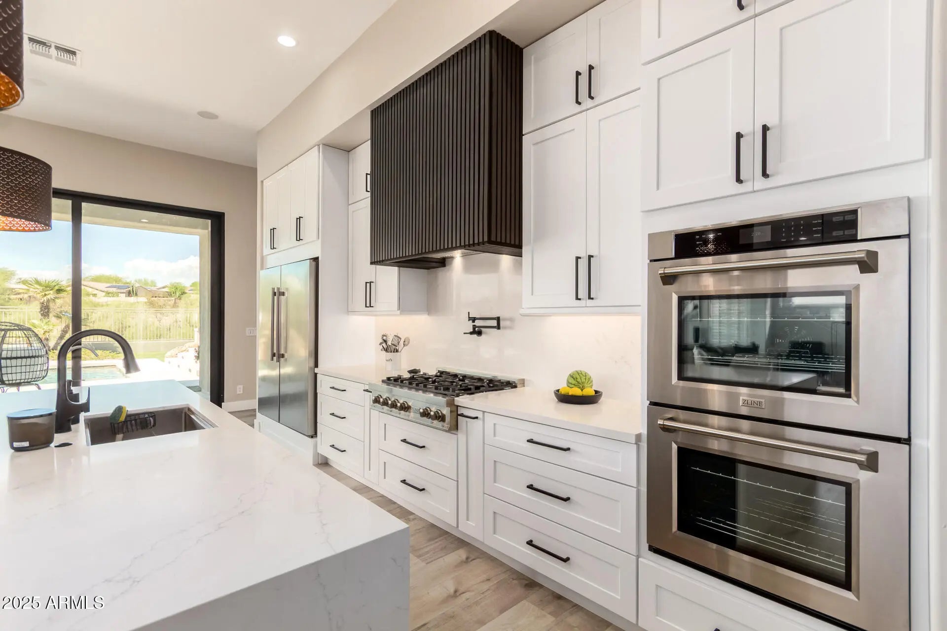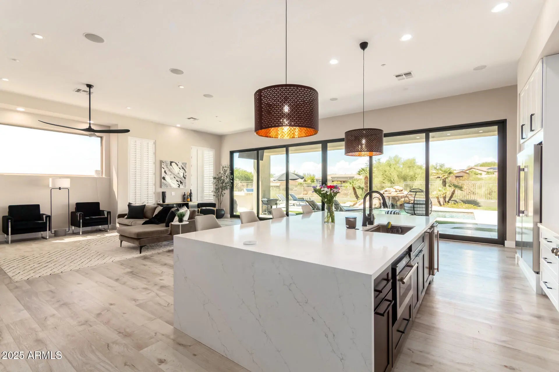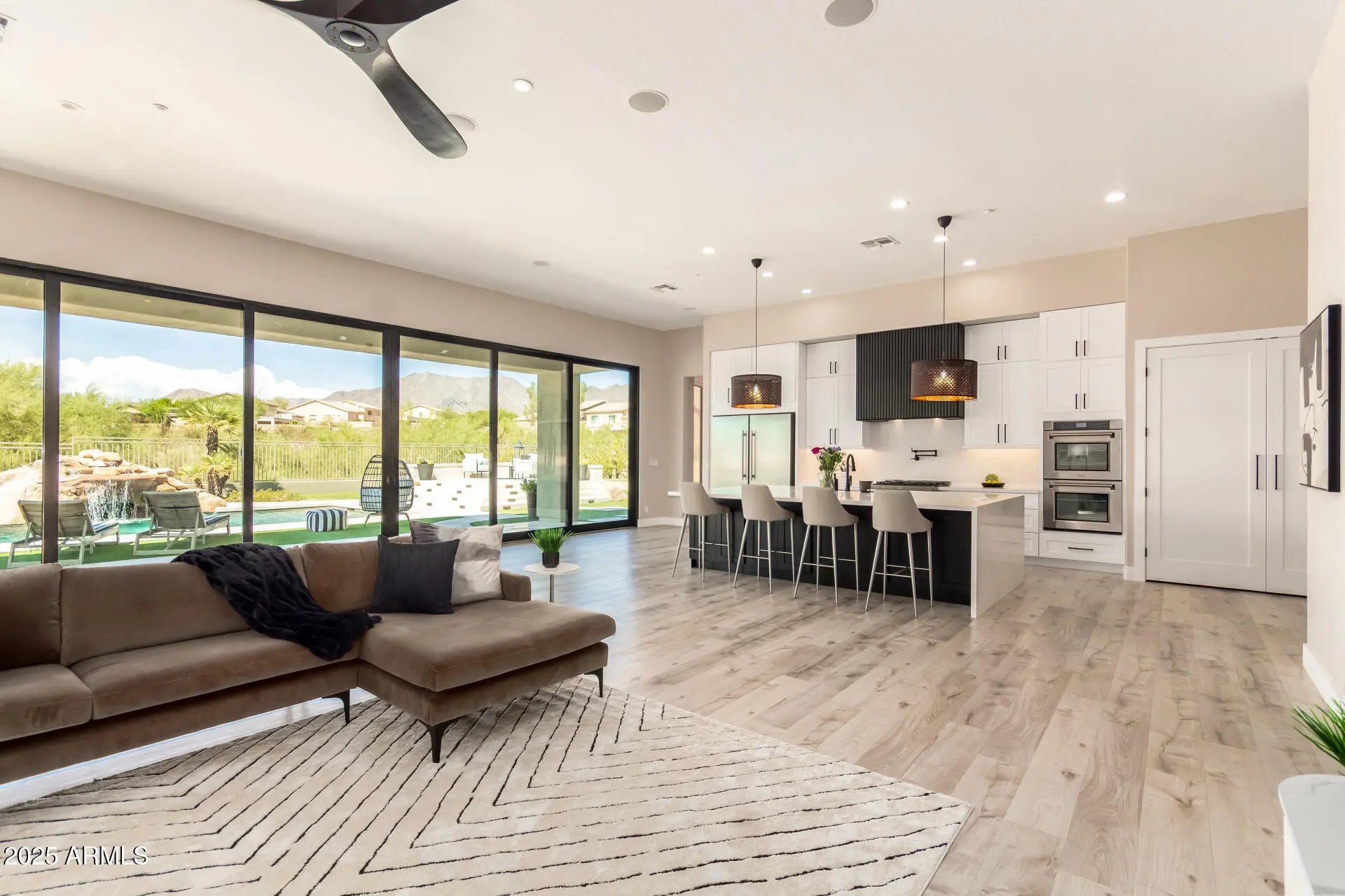 Luxury living in the gated Sonoran Estates at McDowell Mountain Ranch. This fully remodeled estate on over an acre backs to a desert wash with unobstructed McDowell Mountain views. The 3,685 sq ft single-level split floorplan offers 5 bedrooms, 3.5 baths, soaring 12-ft ceilings, and a dramatic 30-ft glass wall that blurs the line between indoor and outdoor living. The chef's kitchen is the centerpiece of the home, showcasing a waterfall-edge Alaskan Blizzard quartz island and backsplash, 42'' upper cabinets, 36'' drawer bases, dual pull-out spice cabinets, ZLINE 36'' 6-burner rangetop, ZLINE double ovens, pot filler, Asko panel-ready dishwasher, microwave drawer, RO system, and walk-in pantry. The primary suite features a bay window seating area, large walk-in closet, and quartz shower.. with dual rainfall heads & bench. Guest suite with ensuite bath. Wide-plank luxury vinyl flooring, new interior paint. Backyard with private pool, grotto, waterslide, and expansive mountain views. 3-car garage, tankless water heater, new AC, soft water system, and ice machine.