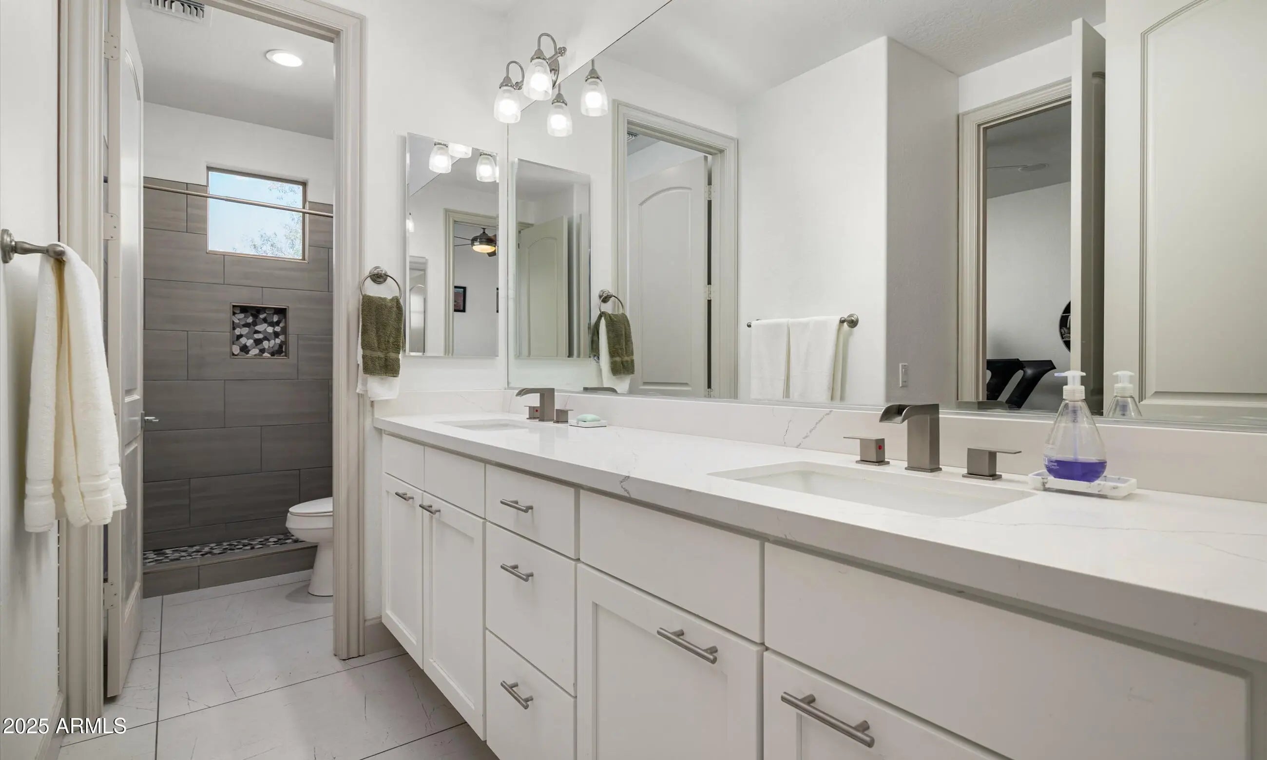 This is an entertainer's dream and a rare opportunity for modern luxury living! As one of the largest single-level floor plans offered in the area, this stunning 4,342 SqFt home blends flexible living with stylish upgrades and a truly one-of-a-kind lifestyle. Currently configured as a 4 bed / 3.5 bath, the layout also features an open bonus room, separate office/den, and enclosed bonus room, all of which can be easily modified for up to 7 bedrooms. Inside, you'll find a crisp modern renovation with white and grey tones, a chef's kitchen w/ unique ''T'' island, stainless appliances, double ovens, quartz counters, and sleek pendant lighting. Every bath has been updated with new tile, fixtures, etc. The expansive owner's suite includes a re-imagined bathroom, dual walk-in closets (one was added w/ a garage reconfiguration). Outside, the resort-style yard is sure to wow family and friends! The refinished pool with stone water features surrounds an "island" platform shaded by a pergola, creating an outdoor living experience you won't find anywhere else. You'll appreciate dual garages offering 3.5 spaces. You'll save year 'round with the efficient solar system plus EV charging station.