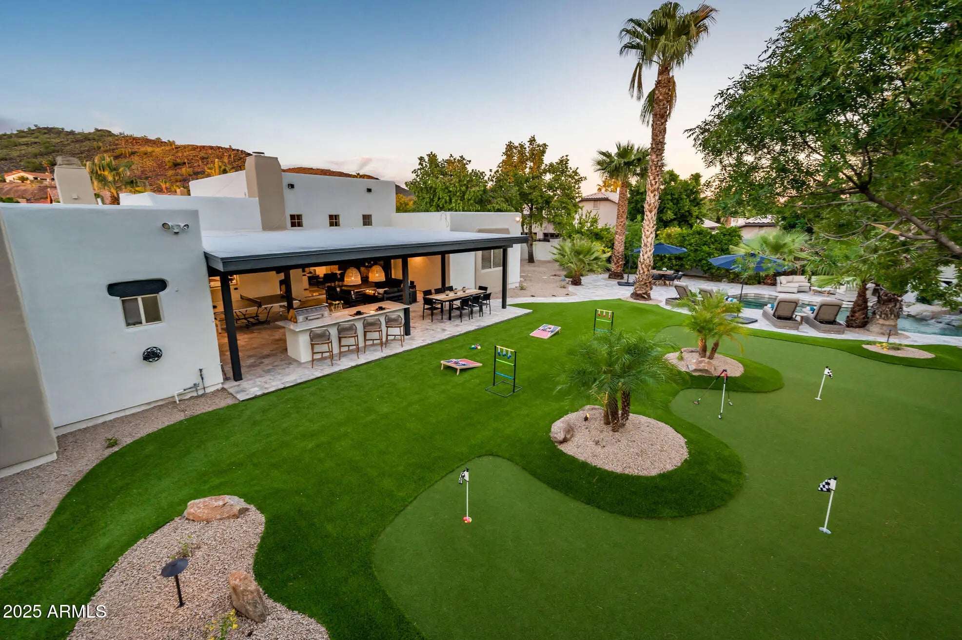 The home features a spacious, open layout with multiple living and entertainment areas, a chef's kitchen, and well-appointed bedrooms designed for both comfort and privacy. The resort-style backyard is a true highlight, boasting a sparkling pool, putting green, lounge areas, and mature desert landscaping perfect for entertaining or enjoying the serene evenings. With its proven rental history, modern amenities, and sought-after address, this property is ideal for both investors seeking a turnkey STR and buyers looking for a private desert escape with income potential. Seller is related to agent