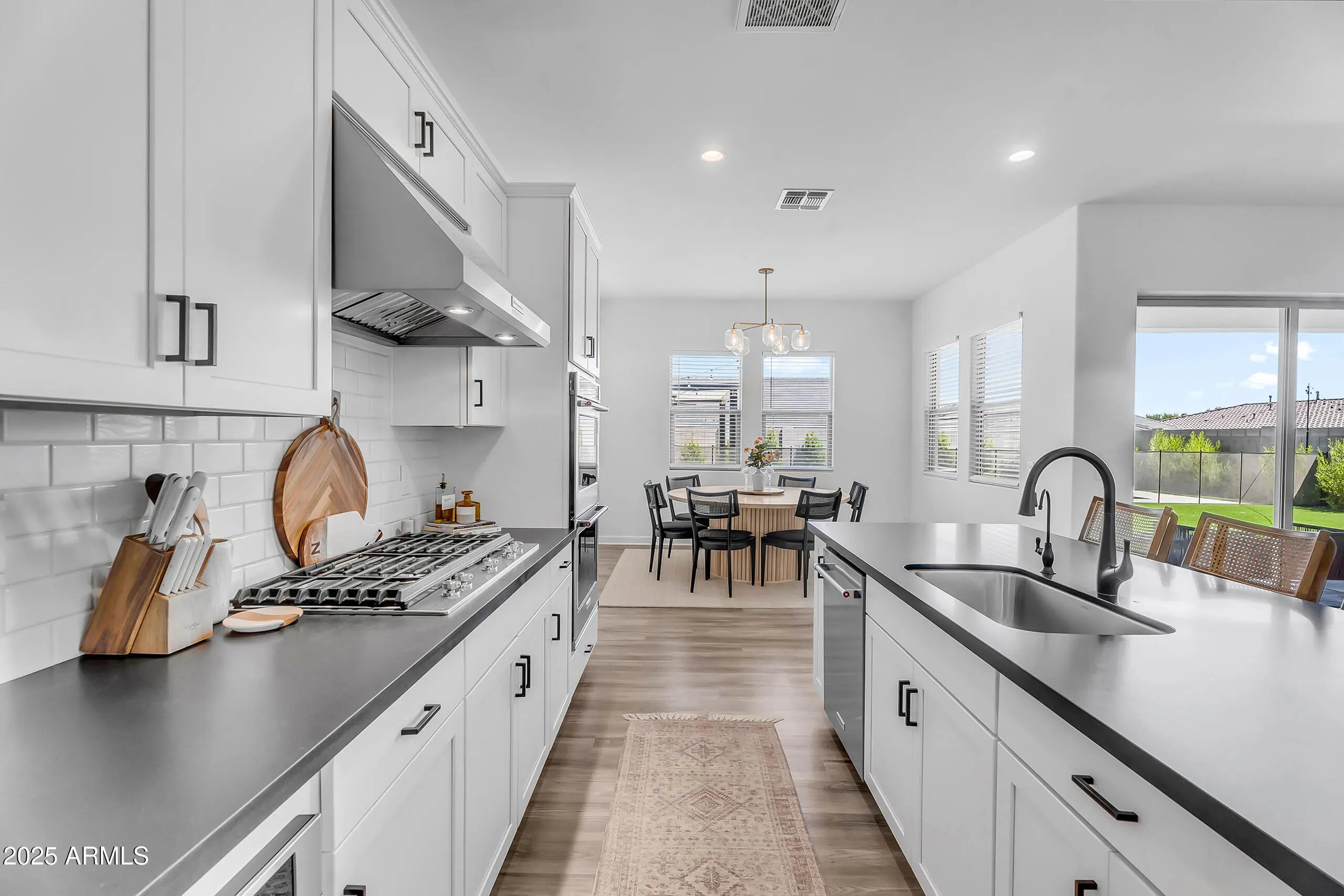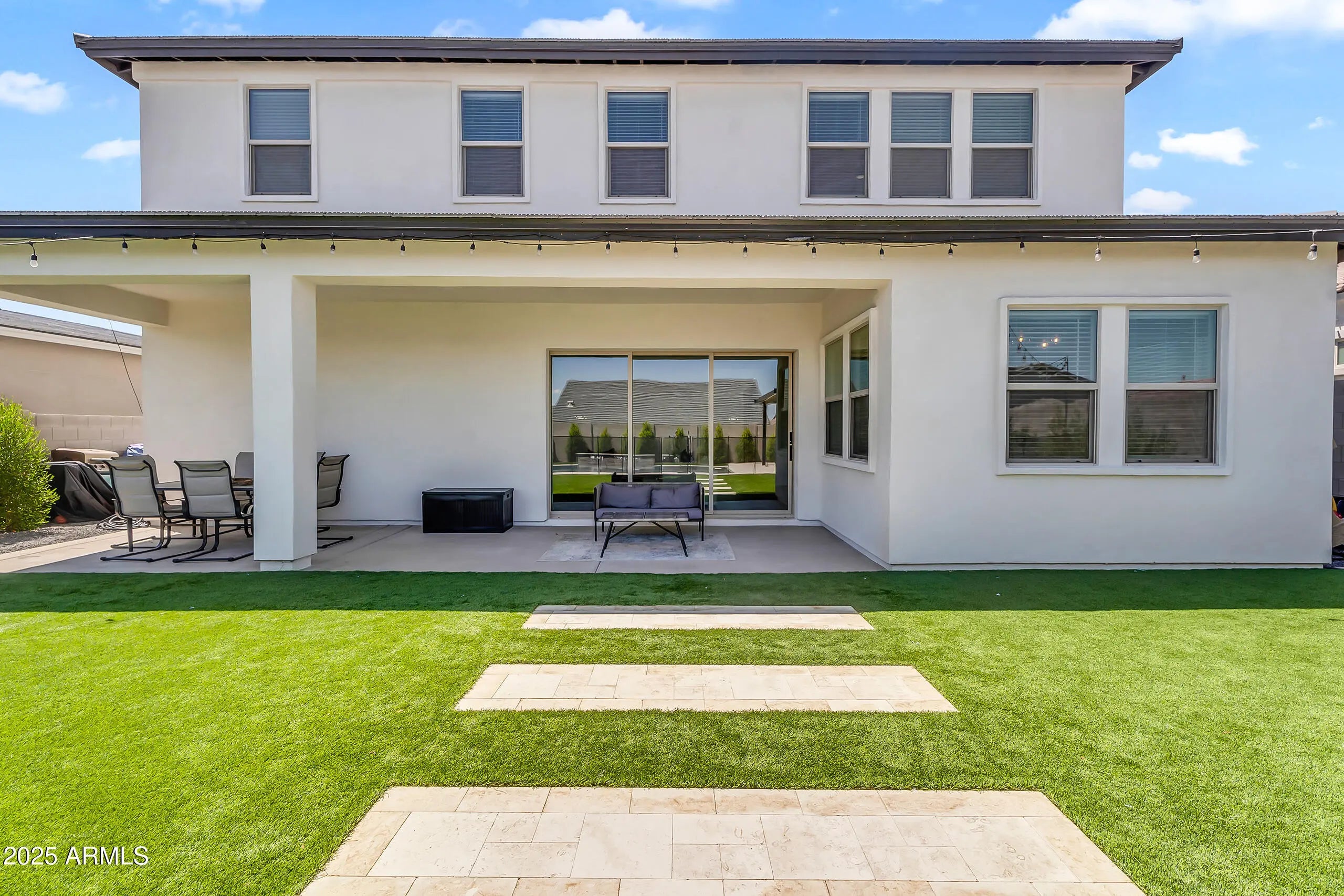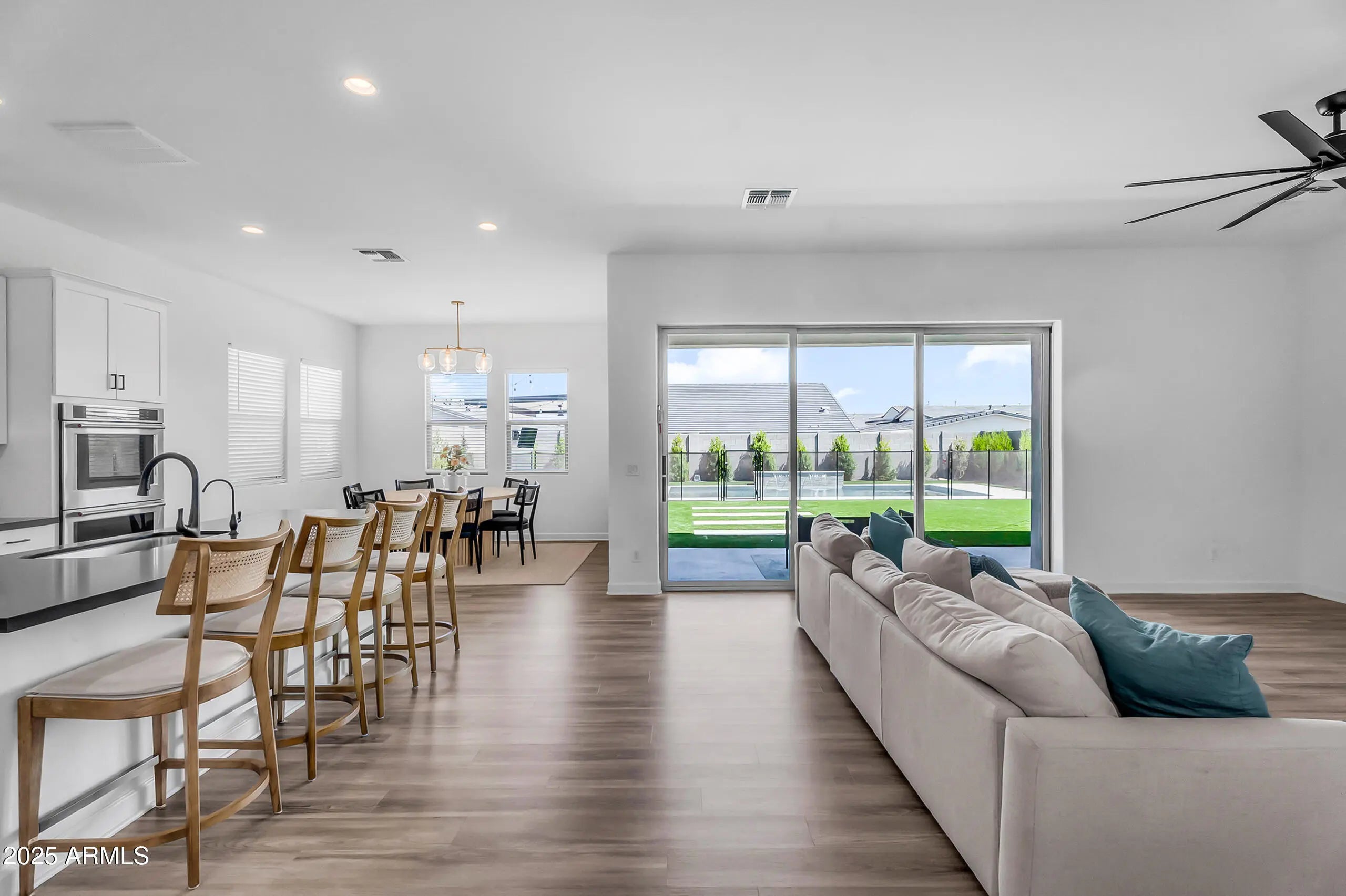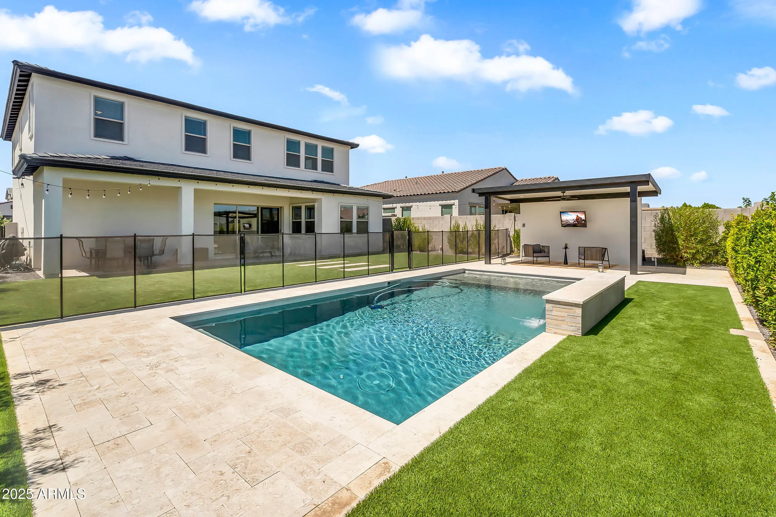 This beautiful two-story home blends modern design with functional living. The open floor plan features a spacious living area, gourmet kitchen with stainless steel appliances, double ovens, subway tile backsplash, and a large island with bar seating. Oversized sliding glass doors open to a backyard built for entertaining, complete with a sparkling pool and water feature, travertine decking, turf, a custom pergola, and a spacious extended patio. Upstairs, generously sized bedrooms provide space for the whole family, while the primary suite offers a bright and private retreat. With low-maintenance curb appeal in the front and a resort-style yard in the back, this home is move-in ready and truly has it all.