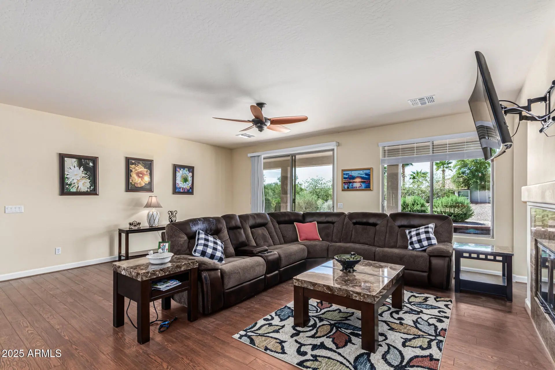 Best Value in Robson Ranch to start your dream life! This Calabria model has everything you need. Completely FURNISHED including Patio furniture and BBQ! Large 2 Bedroom, Den, 2 full Bathrooms, 2 Car Garage + Golf Cart Garage. Patio is completely covered with large back and side yards views to the Open Space & Trail system. This Integra Block Home is energy efficient and quite! Enjoy the Wood Floors in all areas except Bedrooms(carpet) and Bathrooms(tile). Large Great Room even has a Gas Log Fireplace. Kitchen with Granite Island. Primary Bedroom has additional bump-out sitting area. Primary Bathroom has dual sink Vanity, walk-in shower with seat, AND generous Walk-In Closet. Guest Bedroom is perfect size along with Full Bathroom. Laundry Room w/ Washer & Dryer SELLER CAN FINANCE