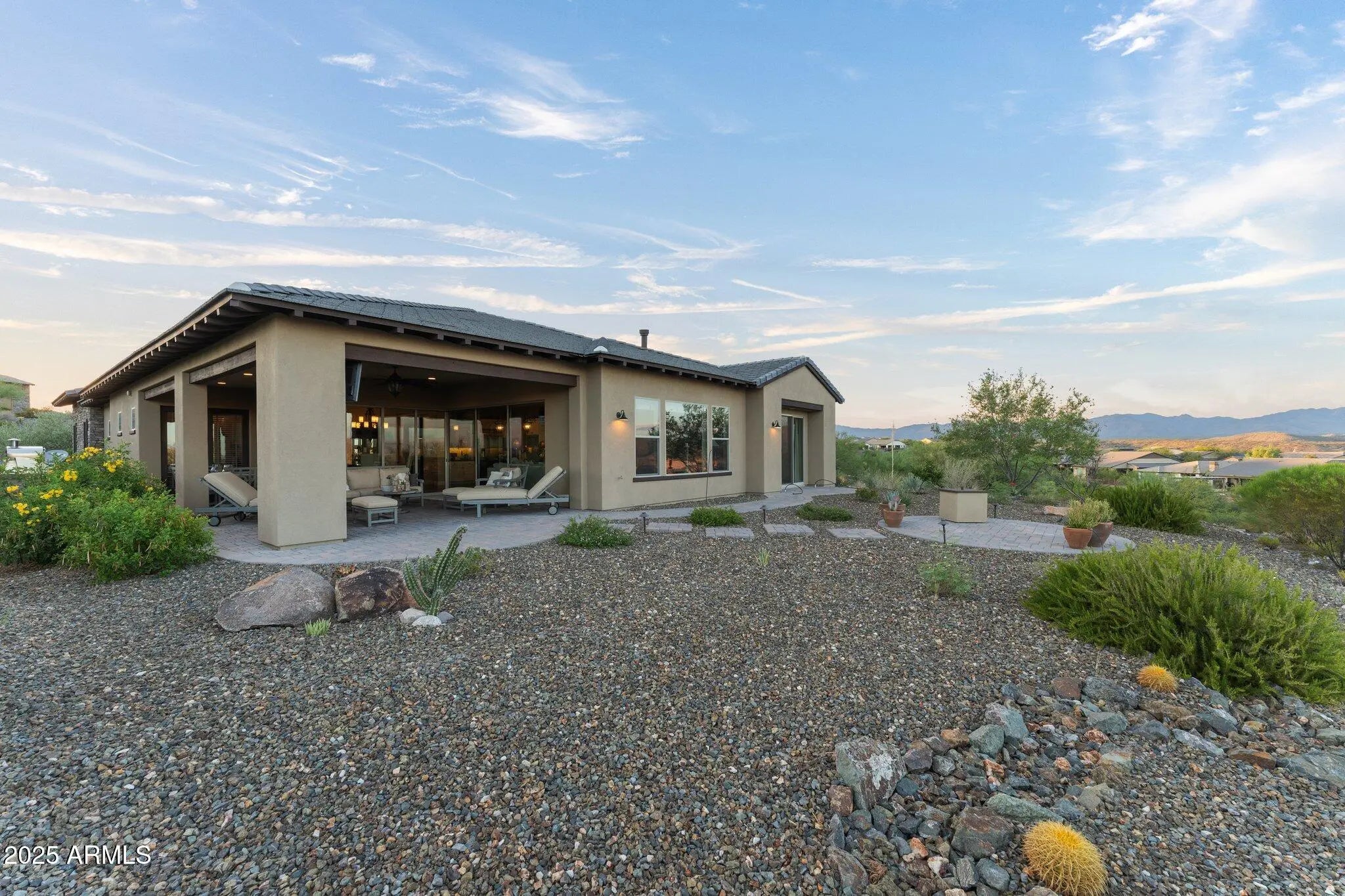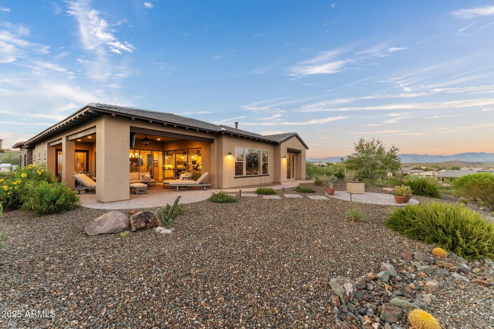 VIEWS VIEWS VIEWS VIEWS!!!!!!!!!This exquisite home located on the golf course, offers breathtaking views of Vulture Peak and the Weaver Mountains. Nestled on a large cul-de-sac lot adjacent to common areas, this home provides both privacy and picturesque scenery. You'll be captivated by the oversized patios featuring a built-in BBQ, pizza oven, and a majestic rock fireplace—ideal for entertaining or simply enjoying a tranquil evening. No expense was spared in crafting this remarkable home, where every detail has been thoughtfully designed. Upon entering, you'll be greeted by a sophisticated den complete with a built-in wine cabinet, perfect for relaxing with your favorite vintages. The gourmet kitchen is a chef's dream, boasting upgraded appliances including wall ovens, a gas range top, a stainless-steel vent, granite countertops, and a stunning limestone backsplash. The expansive living room showcases a dramatic rock fireplace and accent wall, creating a cozy yet elegant atmosphere. Glass sliders seamlessly connect the indoor living space to the outdoor patios, enhancing the flow and making indoor-outdoor living a breeze. High-end wood and tile flooring, coupled with stylish chandelier lighting, add a touch of luxury throughout the home. The master suite is a true retreat, featuring two walk-in closets and a lavish bathroom with a walk-in shower and a soaking tub. Glass doors open directly to the patio, providing a serene private escape. The guest bedroom is generously sized and includes its own patio exit, while the guest bathroom offers ample space and comfort. The charming courtyard is perfect for gatherings, featuring pavers, a massive rock fireplace, a shade screen, and extensive entertainment space. The separate casita provides an ideal space for guests, with a spacious living area, a full bathroom, and a walk-in closet. Additional highlights include a large laundry room that doubles as an office with ample cabinetry for storage, and an extended-length garage providing extra room for additional storage needs. This Shea Latigo home in Wickenburg Ranch offers unparalleled luxury, comfort, and style.