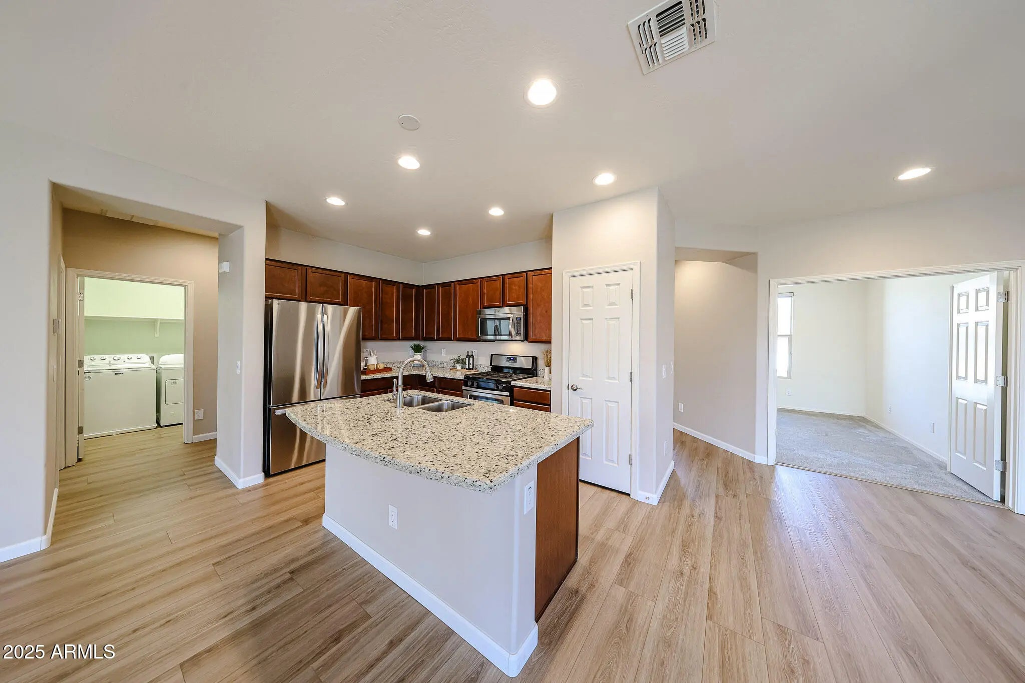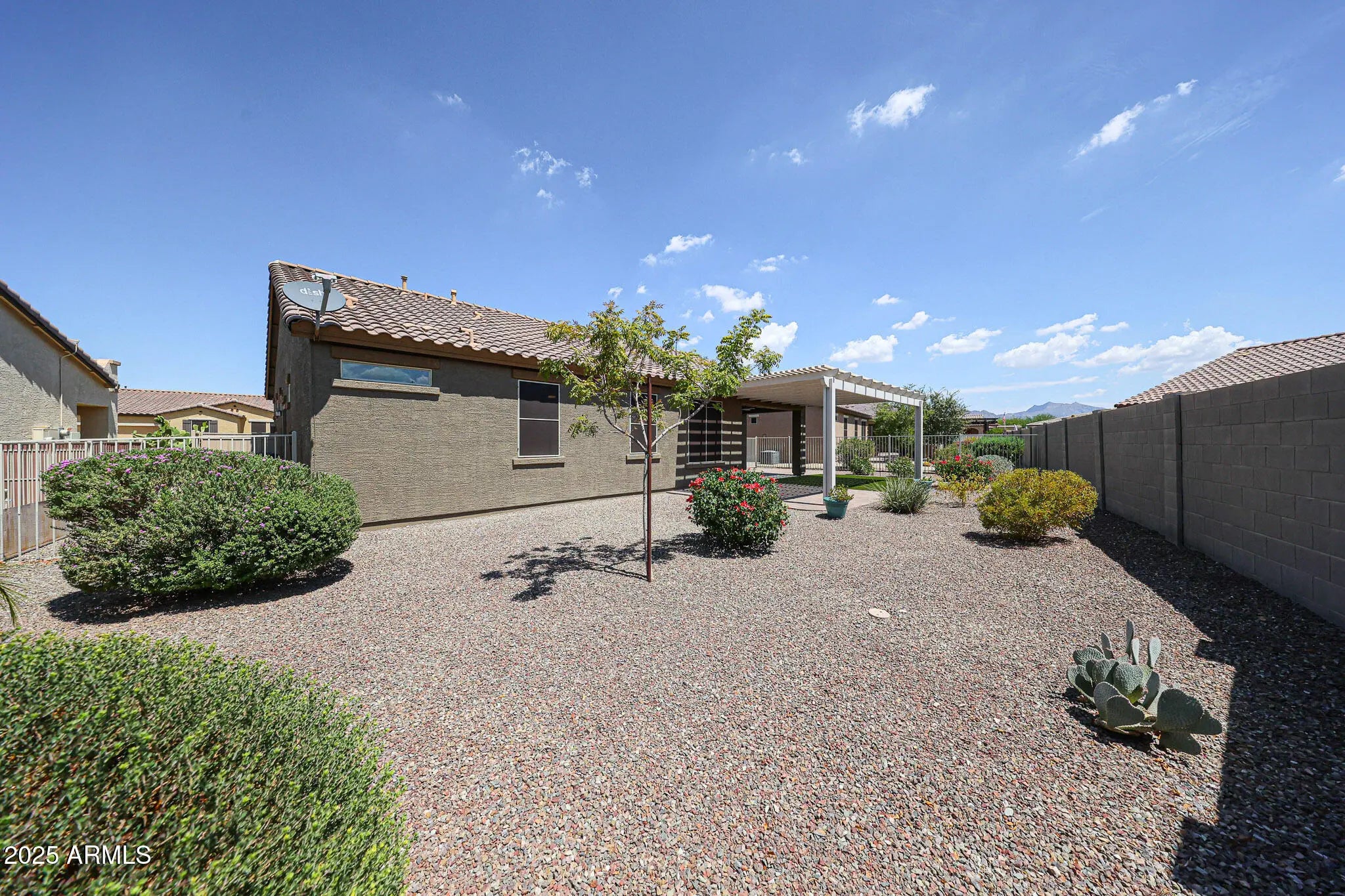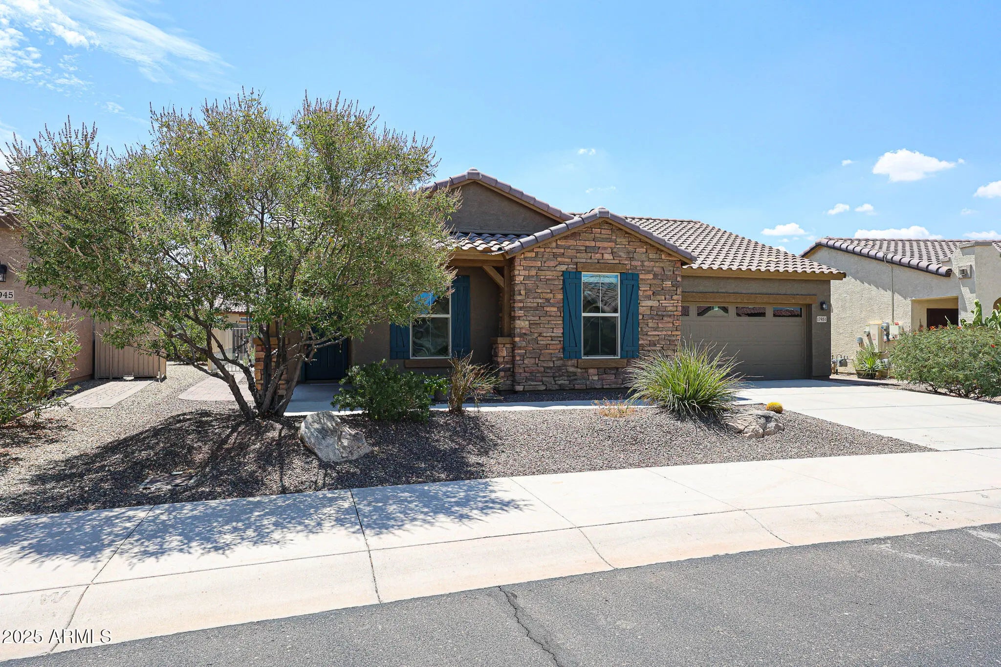 Welcome to this beautifully appointed 2-bedroom, 2-bath home with a versatile office/den. From the moment you arrive, the home's charm shines through with stone accents, a welcoming covered front porch, and easy-care desert landscaping that invites you right in. Inside, the open-concept design creates a natural flow between the great room, kitchen, and dining area - an ideal layout for entertaining friends or enjoying cozy evenings at home. Newer luxury plank vinyl floors run throughout high-traffic areas, adding modern warmth and easy upkeep. The kitchen is a cook's delight, featuring natural wood cabinetry, granite countertops, a gas stove, newer refrigerator, and a convenient trash compactor—everything you need to make preparing meals a pleasure. The spacious primary suite is your private retreat, offering dual sinks, a large walk-in shower with a new glass door, and plenty of room to unwind. A split floor plan ensures privacy, with the secondary bedroom tucked away for guests, while the office with French doors provides flexibility - ideal as a den, craft room, or additional guest space. Step outside to your own backyard oasis. A large covered paver patio and pergola offer both sun and shade, creating the perfect setting for morning coffee, al fresco dining, or evenings spent under the Arizona sky. Artificial turf and mature shrubs add vibrant greenery with minimal upkeep, making it easy to enjoy your outdoor space year-round. The 2-car garage is designed with practicality in mind, offering built-in storage cabinets, epoxy floors, and a water softener. Best of all, this home is nestled in CantaMia, an award-winning 55+ active adult community where lifestyle truly takes center stage. Here, you'll enjoy resort-style living with access to a state-of-the-art clubhouse, fitness center, sparkling pools, and miles of scenic walking and biking trails. With a full calendar of social events, clubs, and activities, it's the perfect place to stay active, make new friends, and embrace the very best of Arizona living.