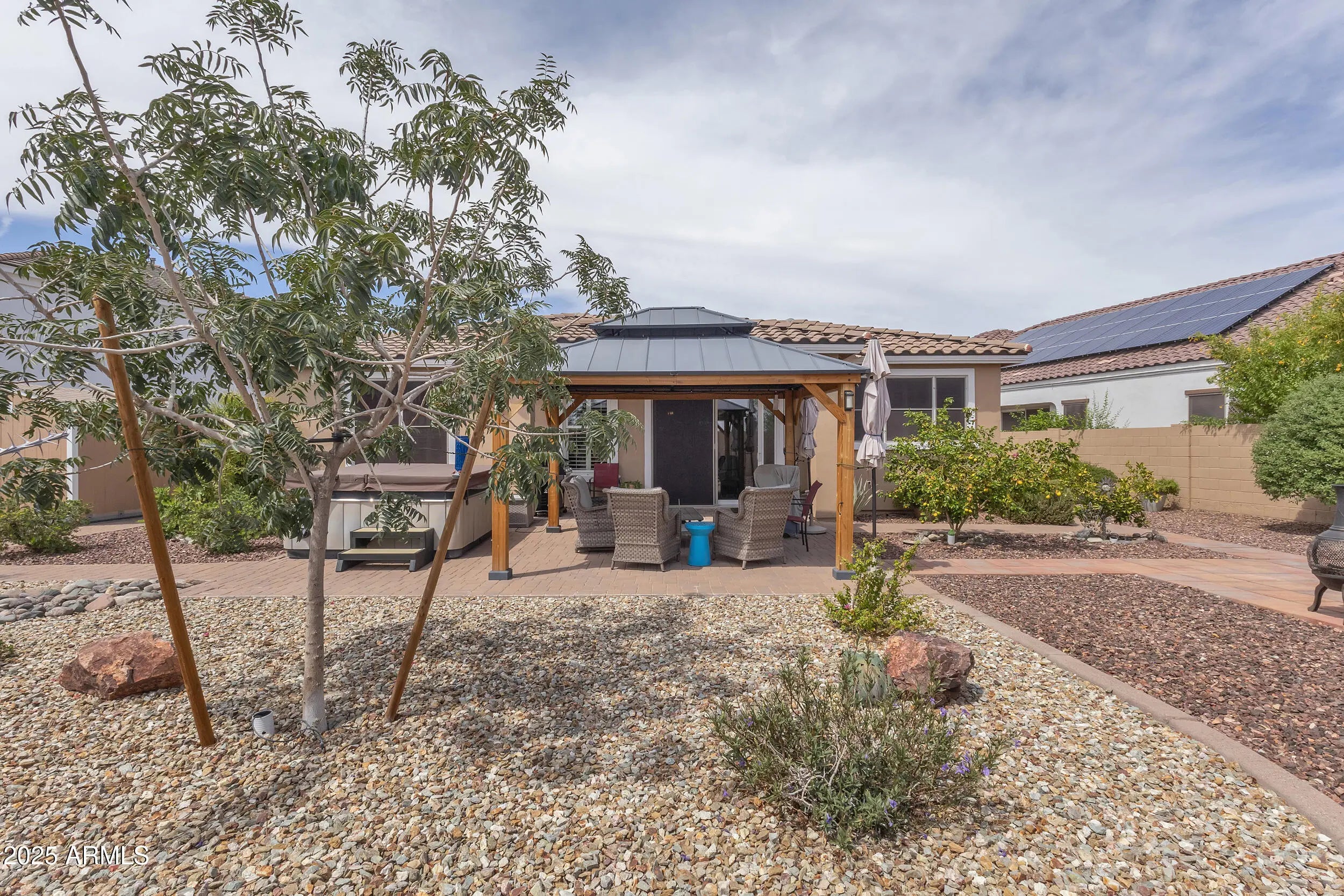 This Buckeye home has it all—3 bedrooms, 3 baths, a prepaid solar lease to keep energy costs low, and a recently painted exterior for added curb appeal. The updated kitchen is warm and welcoming with granite counters, upgraded cabinets, gas range, and custom hood. New tile flooring and a remodeled primary suite features double sinks, a separate shower and tub, and large walk in closet. One guest bedroom includes its own bath and walk-in closet and both guest baths have been upgraded. With separate living and dining areas plus a den, there's room for everyone. Step outside to enjoy the pergola, above-ground spa, and a private courtyard seating area—your own retreat at home.