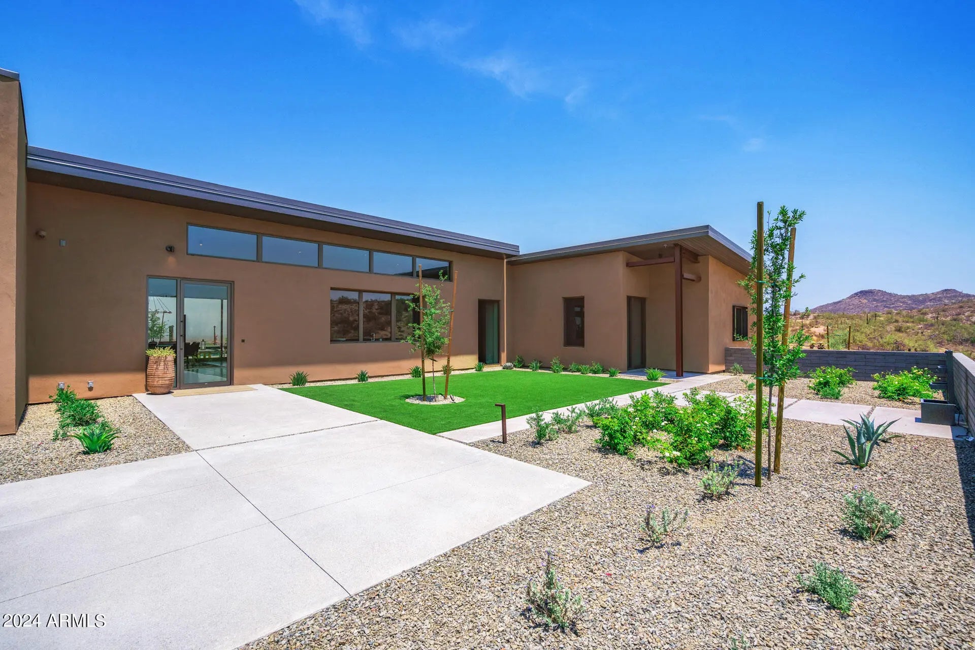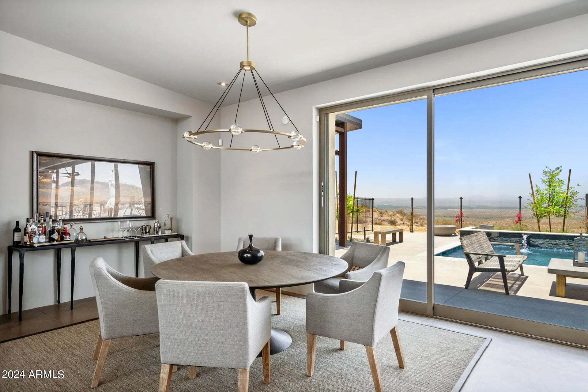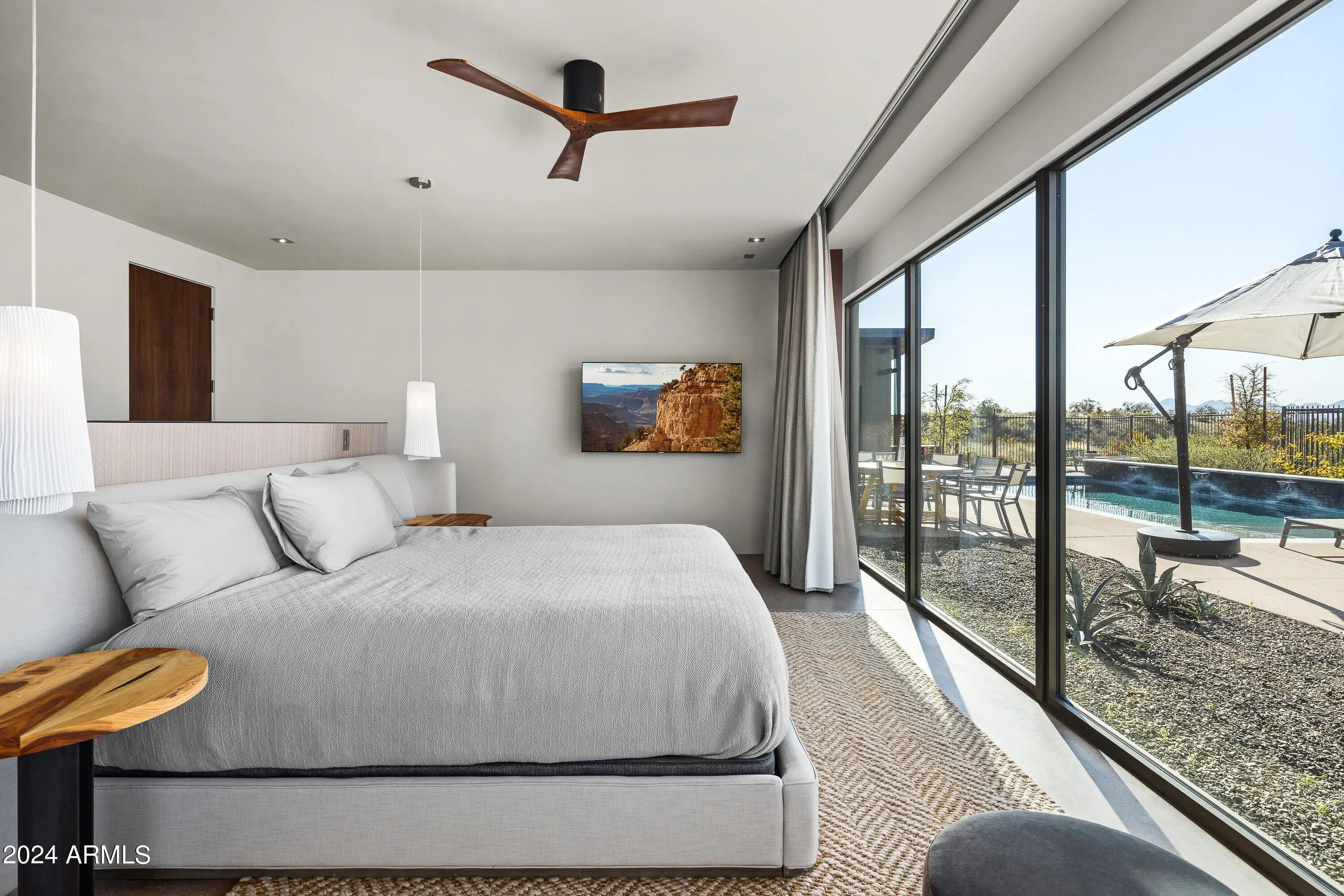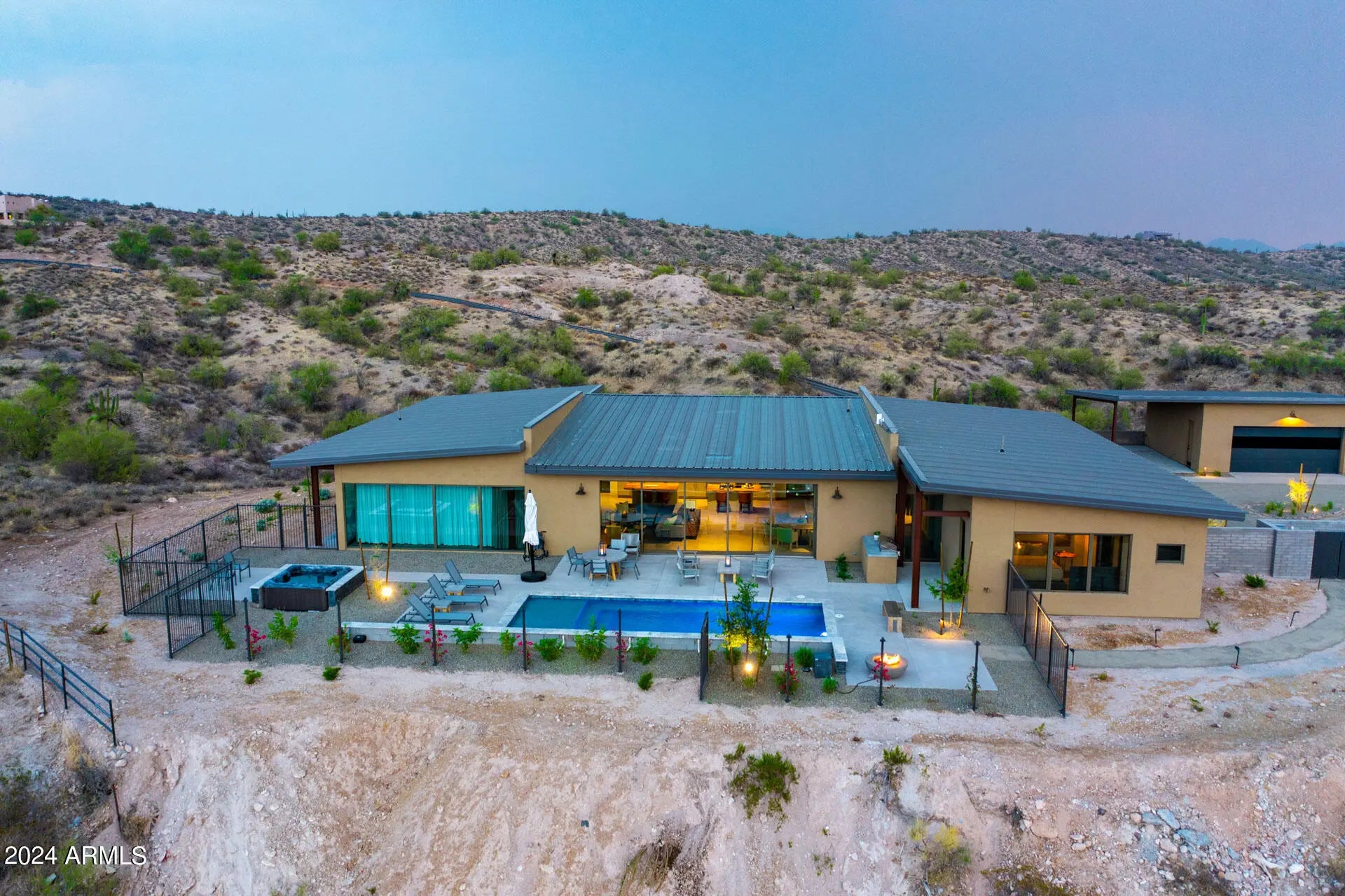Paradise Canyon - Estate 2 is a one-of-a-kind desert residence designed by acclaimed architect Cathy Hayes and inspired by the timeless influence of Frank Lloyd Wright. Set on more than 45 acres bordering the Tonto National Forest, this gated estate combines complete privacy with proximity—just 10 minutes from We-Ko-Pa Casino & Golf Course, dining, and entertainment. With sweeping mountain views, seasonal wildflowers, and refined design, the property provides a rare long-term lease opportunity for those seeking both tranquility and luxury. The interior features soaring ceilings, walls of glass, and an open-concept design that frames the desert landscape from every angle. Paradise Canyon - Estate 2 is a one-of-a-kind desert residence designed by acclaimed architect Cathy Hayes and inspired by the timeless influence of Frank Lloyd Wright. Set on more than 45 acres bordering the Tonto National Forest, this gated estate combines complete privacy with proximityjust 10 minutes from We-Ko-Pa Casino & Golf Course, dining, and entertainment. With sweeping mountain views, seasonal wildflowers, and refined design, the property provides a rare long-term lease opportunity for those seeking both tranquility and luxury. The interior features soaring ceilings, walls of glass, and an open-concept design that frames the desert landscape from every angle. The main living area is centered around a spacious great room with elegant furnishings, a fireplace, and a wet bar that makes entertaining seamless. A state-of-the-art chef's kitchen with high-end appliances, dual islands, and breakfast bar seating flows into a formal dining area, creating a perfect balance of functionality and style. Five bedrooms, each with its own ensuite bathroom, offer comfort and privacy for residents and guests. The primary suite includes a king bed, a spa-inspired bathroom with dual vanities, a soaking tub, walk-in shower, and an expansive walk-in closet. Additional suites feature a mix of king and queen layouts, with flexible options such as a Murphy bed, sleeper sofa, and a dedicated workspace. The outdoor living spaces are designed as a true desert oasis. A sparkling pool and spa are complemented by a bocce ball court, putting green, built-in BBQ with smoker, sun loungers, and a fire pit set against dramatic mountain views. Multiple patios and gathering areas make the outdoors an extension of the home year-round. Parking includes a two-car garage, a covered carport, and additional driveway spaces. A dedicated laundry area and smart home features add convenience. With its architectural pedigree, unmatched acreage, and resort-style amenities, Paradise Canyon - Estate 2 is a rare opportunity to lease a private desert retreat just minutes from Scottsdale's attractions.
