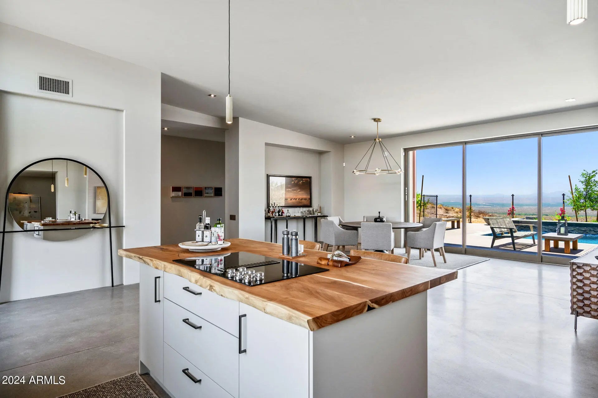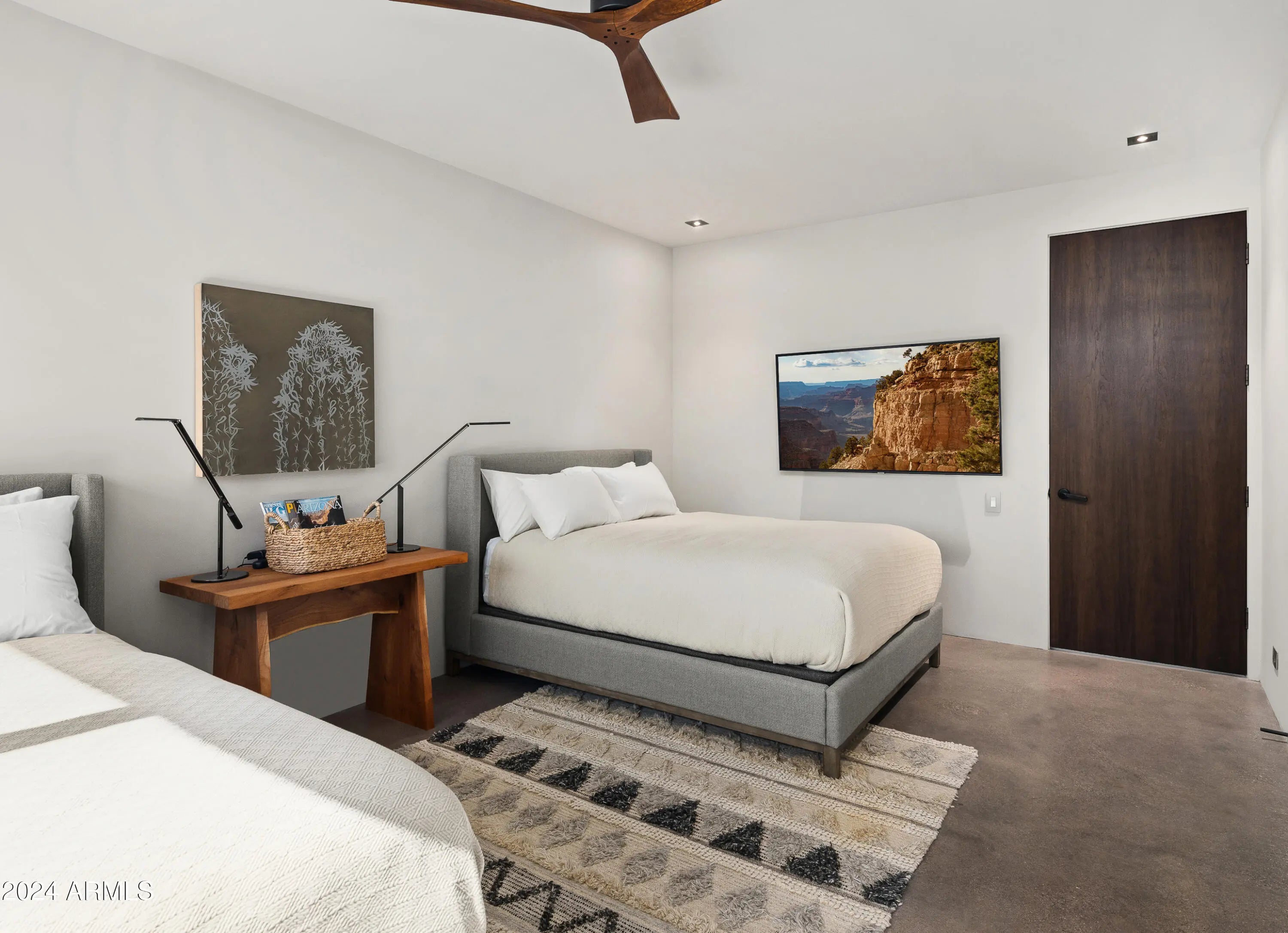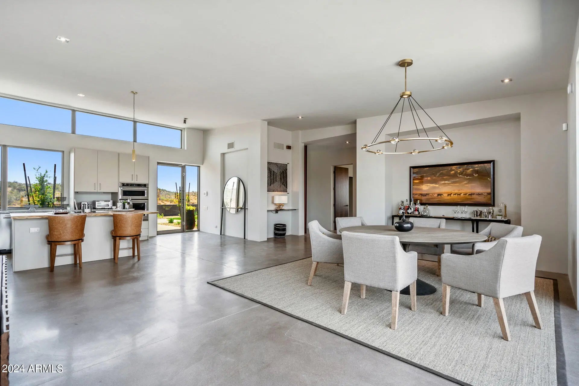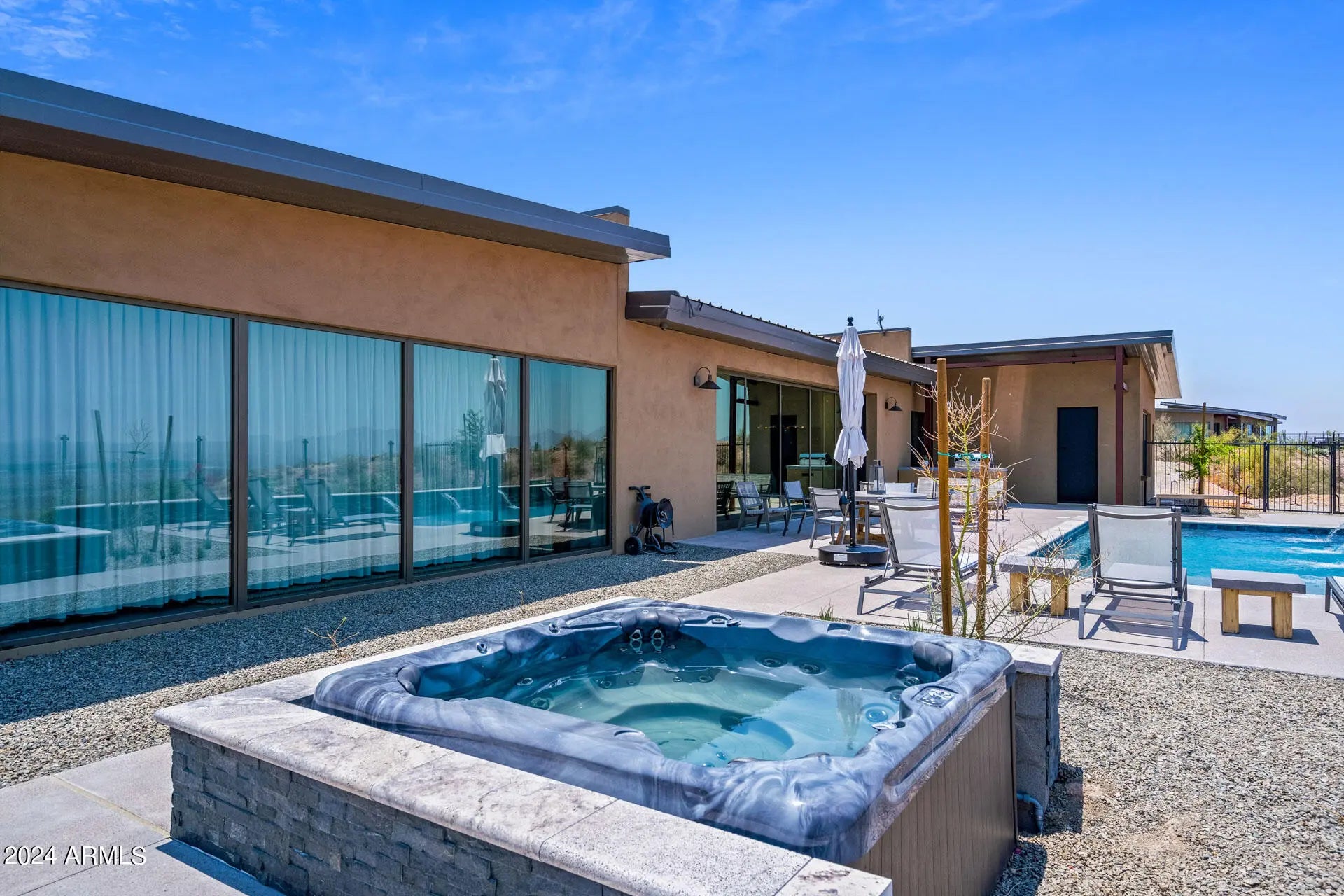 Paradise Canyon - Estate 2 is a one-of-a-kind desert residence designed by acclaimed architect Cathy Hayes and inspired by the timeless influence of Frank Lloyd Wright. Set on more than 45 acres bordering the Tonto National Forest, this gated estate combines complete privacy with proximity—just 10 minutes from We-Ko-Pa Casino & Golf Course, dining, and entertainment. With sweeping mountain views, seasonal wildflowers, and refined design, the property provides a rare long-term lease opportunity for those seeking both tranquility and luxury. The interior features soaring ceilings, walls of glass, and an open-concept design that frames the desert landscape from every angle. Paradise Canyon - Estate 2 is a one-of-a-kind desert residence designed by acclaimed architect Cathy Hayes and inspired by the timeless influence of Frank Lloyd Wright. Set on more than 45 acres bordering the Tonto National Forest, this gated estate combines complete privacy with proximityjust 10 minutes from We-Ko-Pa Casino & Golf Course, dining, and entertainment. With sweeping mountain views, seasonal wildflowers, and refined design, the property provides a rare long-term lease opportunity for those seeking both tranquility and luxury. The interior features soaring ceilings, walls of glass, and an open-concept design that frames the desert landscape from every angle. The main living area is centered around a spacious great room with elegant furnishings, a fireplace, and a wet bar that makes entertaining seamless. A state-of-the-art chef's kitchen with high-end appliances, dual islands, and breakfast bar seating flows into a formal dining area, creating a perfect balance of functionality and style. Five bedrooms, each with its own ensuite bathroom, offer comfort and privacy for residents and guests. The primary suite includes a king bed, a spa-inspired bathroom with dual vanities, a soaking tub, walk-in shower, and an expansive walk-in closet. Additional suites feature a mix of king and queen layouts, with flexible options such as a Murphy bed, sleeper sofa, and a dedicated workspace. The outdoor living spaces are designed as a true desert oasis. A sparkling pool and spa are complemented by a bocce ball court, putting green, built-in BBQ with smoker, sun loungers, and a fire pit set against dramatic mountain views. Multiple patios and gathering areas make the outdoors an extension of the home year-round. Parking includes a two-car garage, a covered carport, and additional driveway spaces. A dedicated laundry area and smart home features add convenience. With its architectural pedigree, unmatched acreage, and resort-style amenities, Paradise Canyon - Estate 2 is a rare opportunity to lease a private desert retreat just minutes from Scottsdale's attractions.