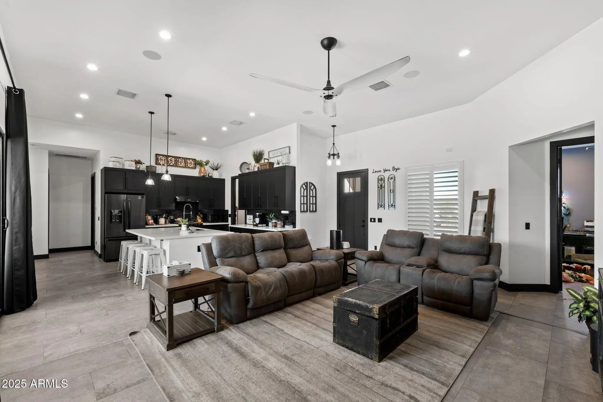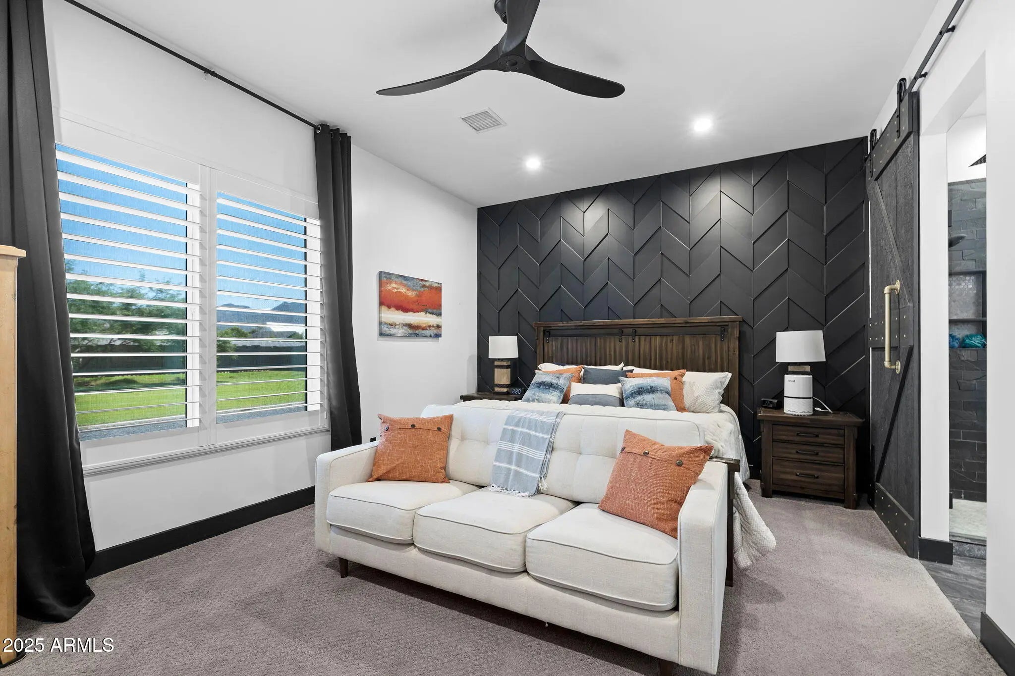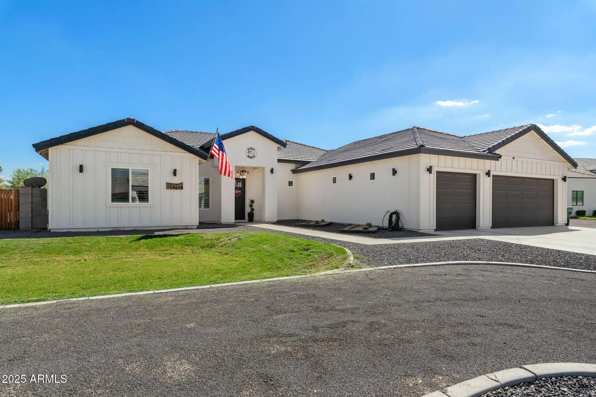 Set on more than three-quarters of an acre in one of Queen Creek's most desirable neighborhoods, this modern-chic residence offers the perfect balance of style, comfort, and functionality, all framed by breathtaking mountain views. Step inside to soaring 12' ceilings and an open-concept great room that flows seamlessly into a chef-inspired kitchen. The heart of the home features upgraded cabinetry, quartz countertops, a massive center island, premium appliances, and a walk-in pantry, ideal for both everyday living and entertaining. The primary suite is a true retreat, highlighted by a custom accent wall, sliding barn door, and a spa-like bathroom with a soaking tub, rain shower, dual vanities, and a private water closet. The oversized walk-in closet ensures space and organization. Additional conveniences include a dedicated mudroom, a well-appointed laundry room with sink and cabinetry, and upgraded finishes throughout, shiplap accents, wood shutter blinds, sunscreens, and modern lighting. Designed with quality in mind, this home features 2x6 construction, foam-insulated roof and exterior walls, a tile roof, Low-E dual-pane windows, and a high-efficiency 15 SEER A/C system with smart Nest controls. Car enthusiasts and hobbyists will love the six-car tandem garage with an integrated car wash station (pressure washer + ionized water system), 50-amp EV/RV plug, and RV gate. Outdoors, the extended patio, irrigated yard, and U-shaped driveway provide both beauty and functionality, while thoughtful details like Christmas light outlets add ease to every season. Recently painted and meticulously maintained, this home is truly move-in ready, delivering the best of Queen Creek living with every modern convenience.