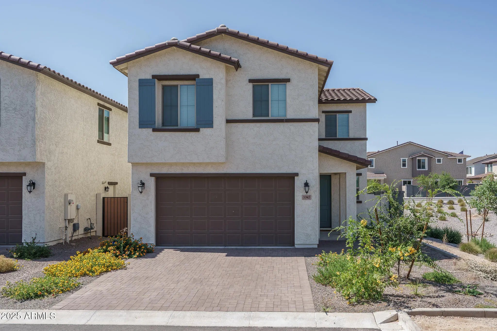 Why wait for new when you can move right into this 3 bedroom, 2.5 bath home that sits on a premium lot bordering the common area with only one side neighbor. This well-designed floor plan has a spacious great room, upstairs loft, & also a homework station, perfect for kids or your home office. The kitchen is beautifully equipped with shaker-style cabinets, Quartz counters, tile backsplash, a pantry, and an island with breakfast bar. Sliding doors lead out to the covered patio & low maintenance backyard leaving you more time to enjoy the community amenities which will include a community pool soon! Bedrooms & laundry are upstairs. The primary has an en-suite bath with dual sinks, oversized shower & walk-in closet. 2-car garage with service door, wiring for ceiling fans & much more!