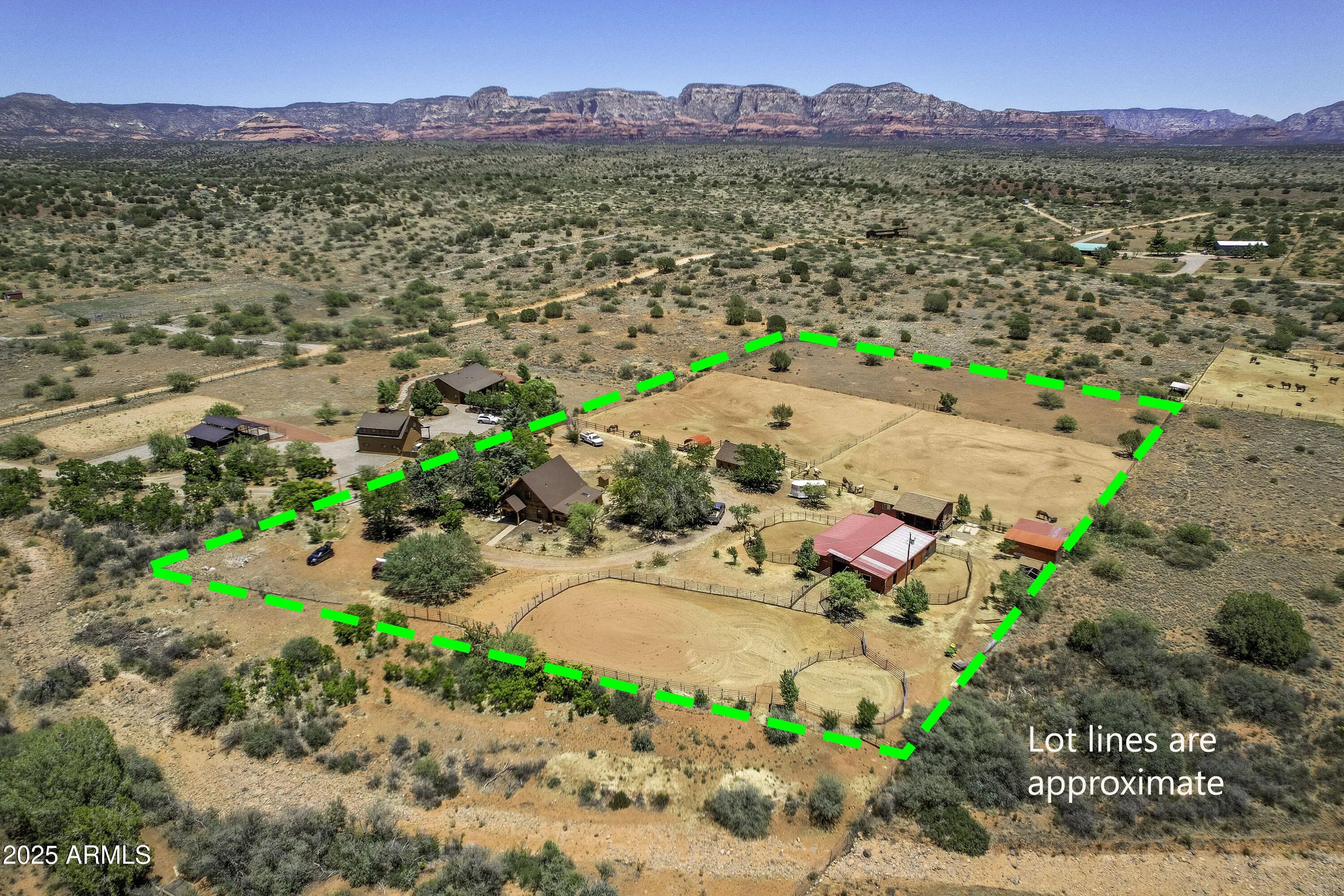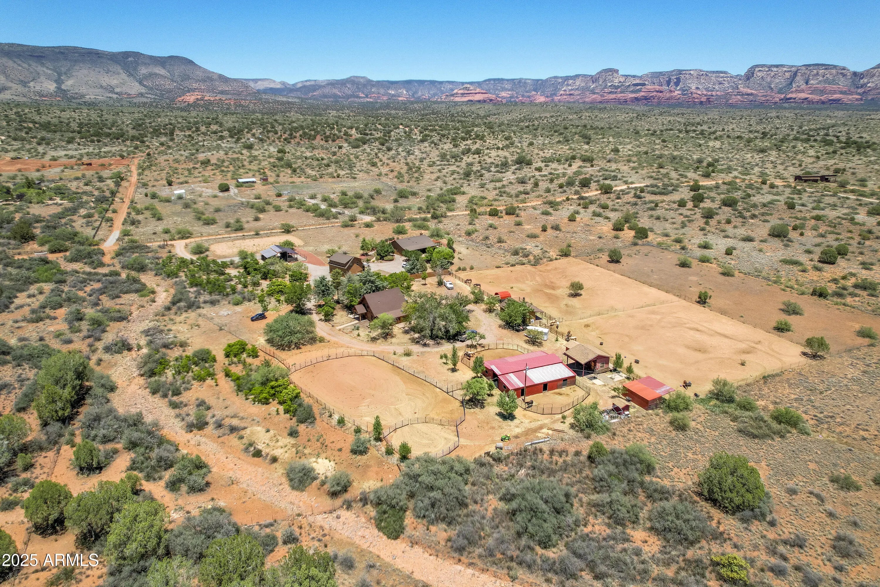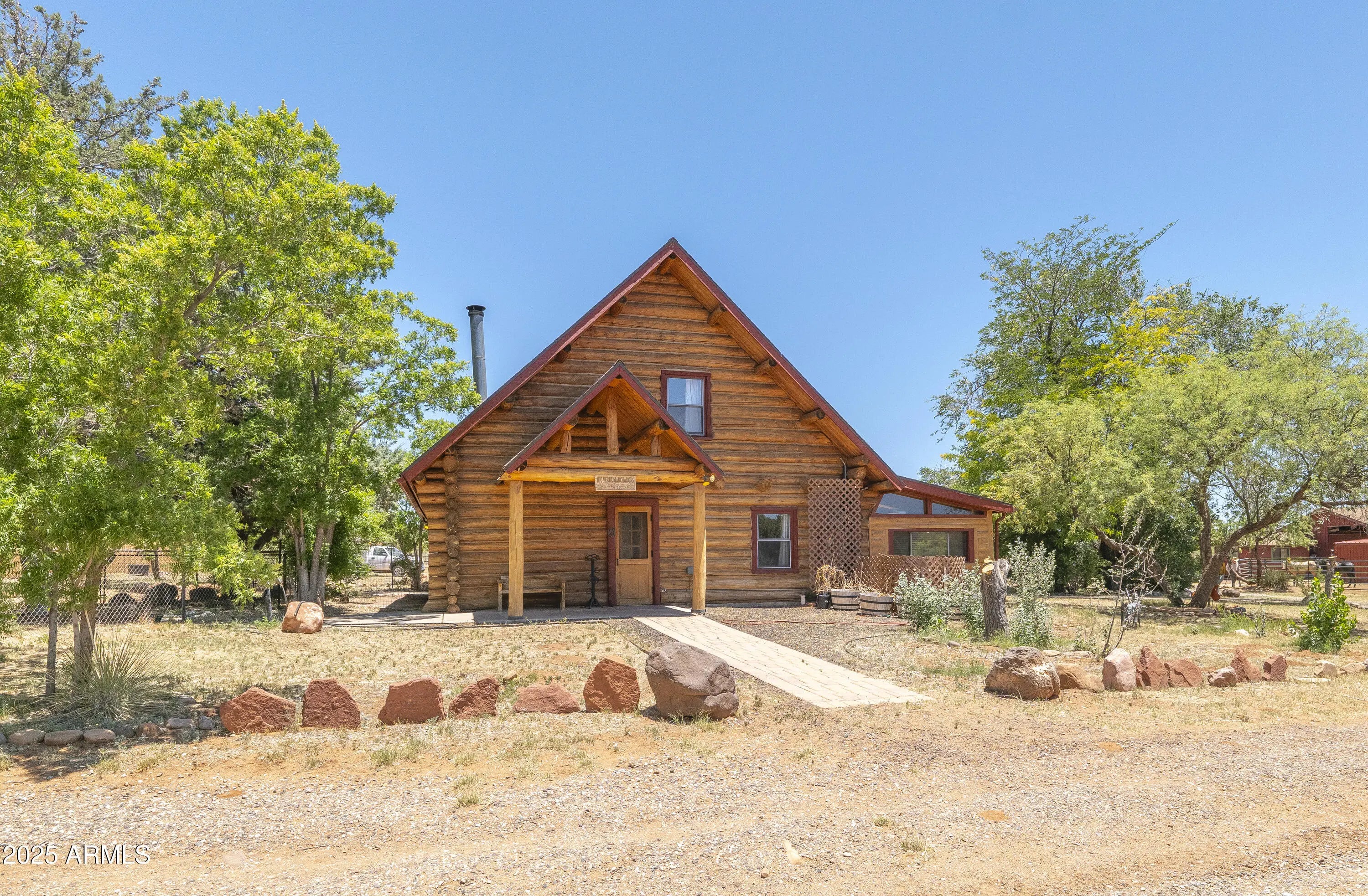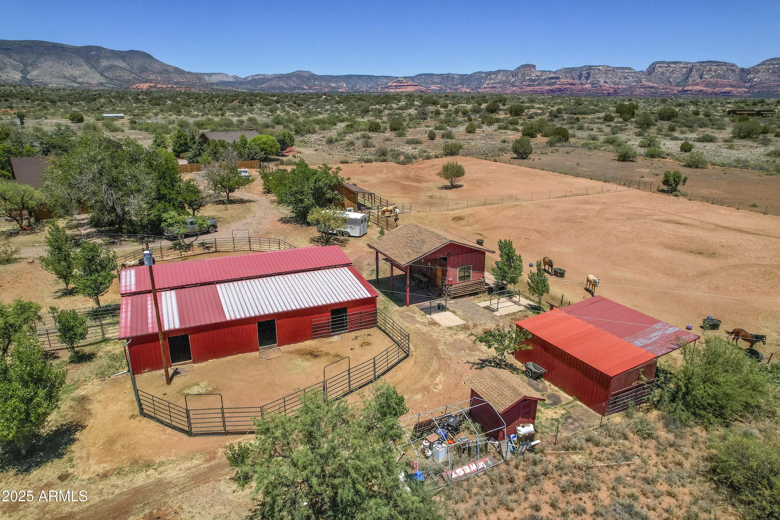 This stunning horse property sits on 5 ACRES in Sedona!!! Completely fenced and gated estate with stunning panoramic red rock & mountain views. Direct access to the pristine NATIONAL FOREST trails!!! Main house is a 2 bedroom, 1bath, log home that feels so spacious with the loft & large windows providing plenty of natural light. The gorgeous kitchen has stainless steel appliances, granite counter tops, filtered water, walk in pantry, and large island/breakfast bar. Dog run, chick coop, & back paved patio perfect for BBQ's, soaking in some sun or even stargazing. The studio with a 3/4bth 608sqft Bunkhouse was built in 2018. Large mature trees provide shade & owner recently planted 8 more trees. Horse Barn w/ 6 stalls, heaters, wash area, tack room, catch room, arena, & more. The main house even has a potential 2nd bedroom! Refer to custom features page for more info Main Log Cabin has 2 bedrooms: A loft upstairs and Bedroom downstairs has armoire, heating, but needs proper cooling added. Private access door to full bathroom. Guest House: 608 sqft Studio with 3/4 bath. Toilet room is separate. Stand up shower no bathtub in separate room. Sink separate.
