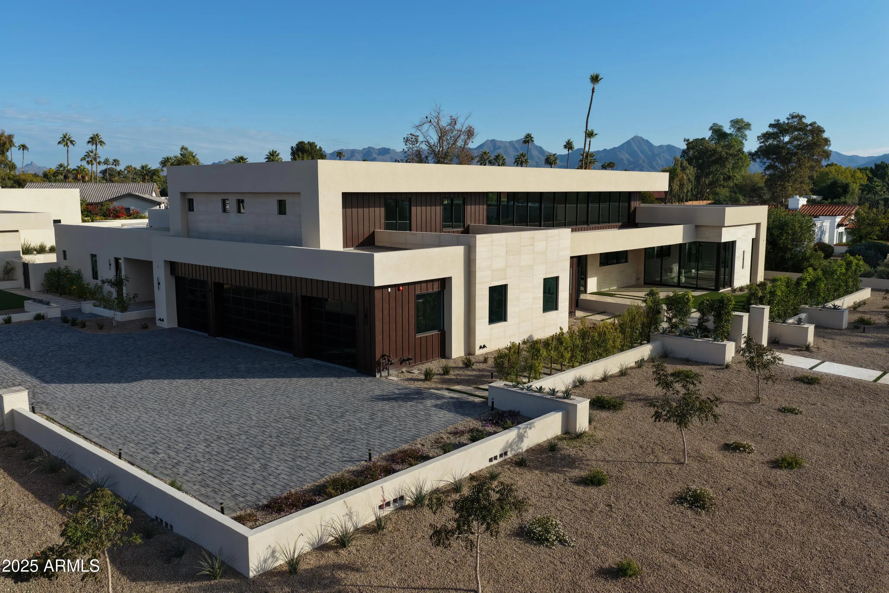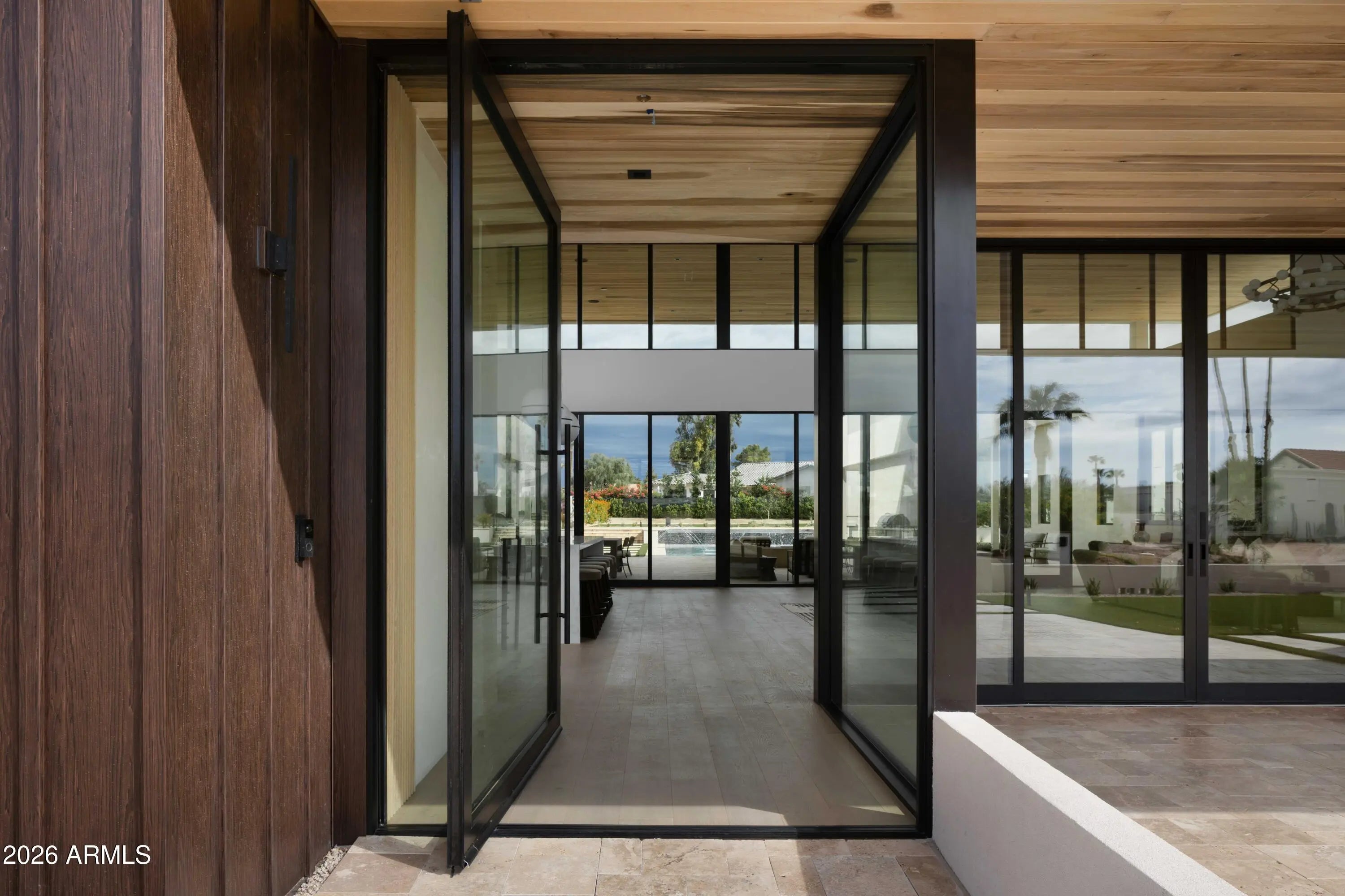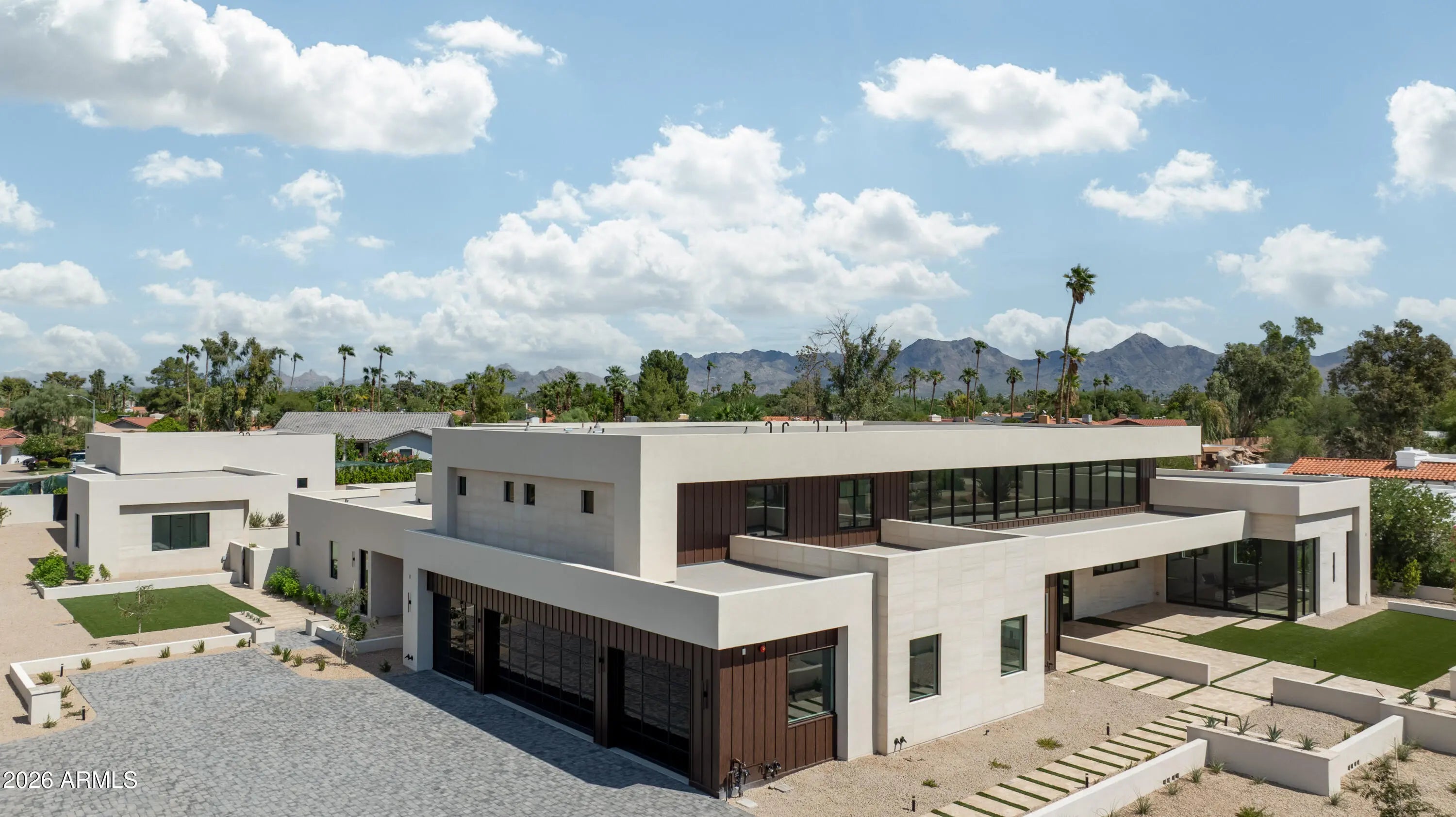 Brand-new 9,000 SF modern estate on 1.1 acres with a standout 7-car garage setup, built for the buyer who actually uses their space. The main residence is paired with a detached guest house featuring its own 3-car garage and private gated entry, creating a true secondary residence for visitors, multi-generational living, or a driver, staff, or security arrangement. Inside, a thoughtful split floor plan centers on an expansive great room, defined by 24-foot ceilings and walls of glass that open to the resort-style backyard. The chef's kitchen is anchored by a hidden prep kitchen for clean entertaining. The primary suite sits in its own private wing, and a nearby flex space with French doors and a full bath, separated by a striking wine wall, works perfectly a lounge, office, or gym. Every bedroom offers an en-suite bath for privacy and function. Outside, enjoy a pool, outdoor kitchen and bar, and a full sports court, all designed to match the home's seamless indoor-outdoor flow. Modern architecture, high-end finishes, and move-in ready completion make this one of Scottsdale's rare new-build luxury opportunities, with garage capacity that sets it apart.