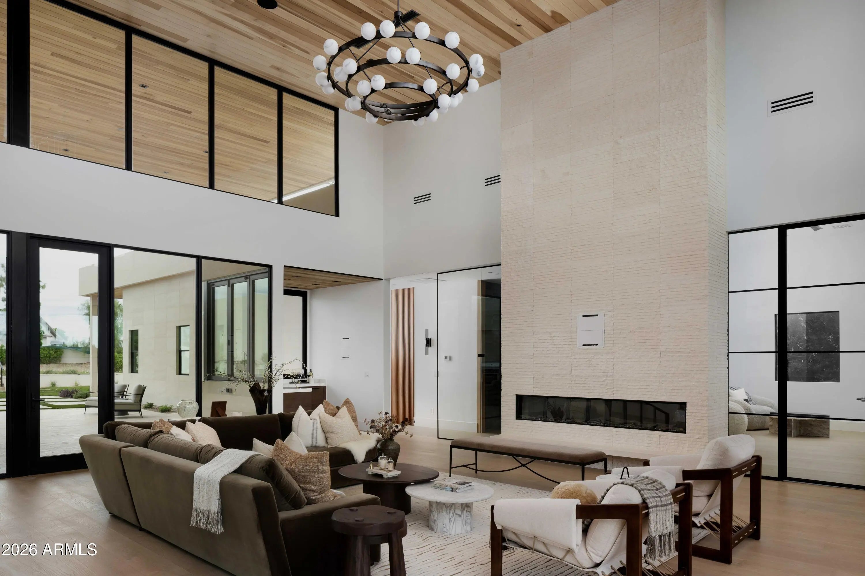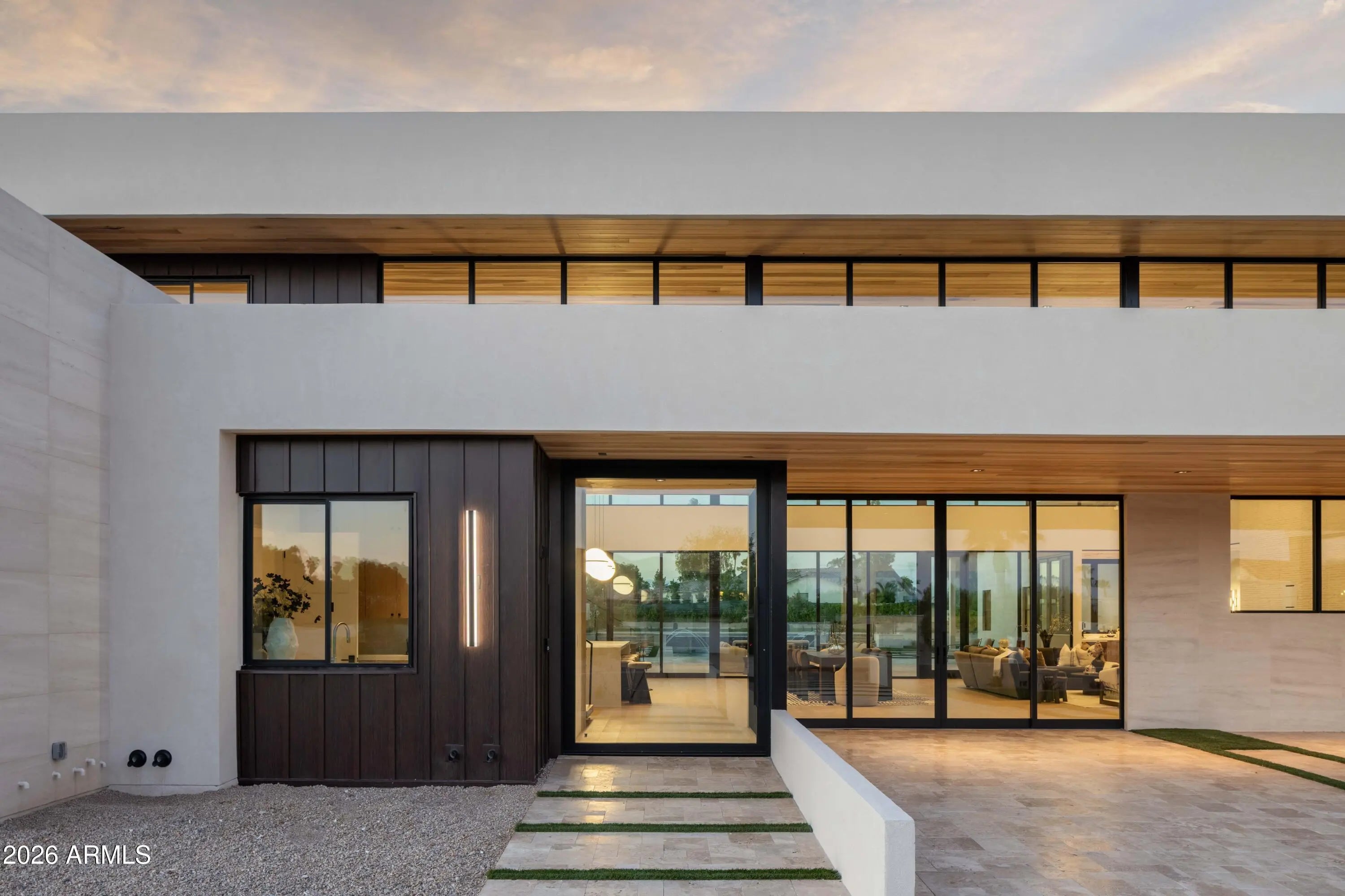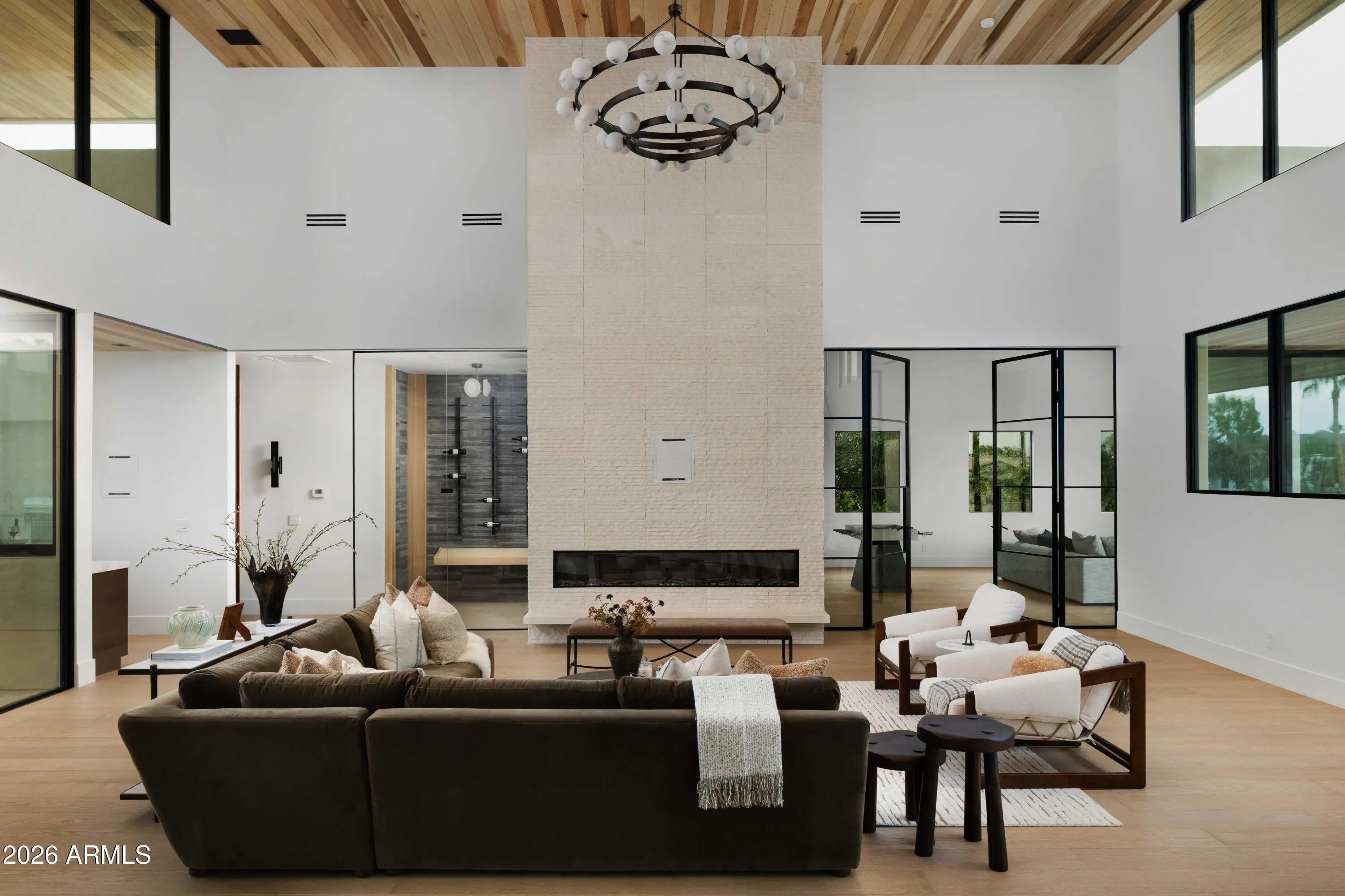 Brand-new 9,000 SF modern estate on 1.1 acres with a standout 7-car garage setup, built for the buyer who actually uses their space. The main residence is paired with a detached guest house featuring its own 3-car garage and private gated entry, creating a true secondary residence for visitors, multi-generational living, or a driver, staff, or security arrangement. Inside, a thoughtful split floor plan centers on an expansive great room, defined by 24-foot ceilings and walls of glass that open to the resort-style backyard. The chef's kitchen is anchored by a hidden prep kitchen for clean entertaining. The primary suite sits in its own private wing, and a nearby flex space with French doors and a full bath, separated by a striking wine wall, works perfectly a lounge, office, or gym. Every bedroom offers an en-suite bath for privacy and function. Outside, enjoy a pool, outdoor kitchen and bar, and a full sports court, all designed to match the home's seamless indoor-outdoor flow. Modern architecture, high-end finishes, and move-in ready completion make this one of Scottsdale's rare new-build luxury opportunities, with garage capacity that sets it apart.