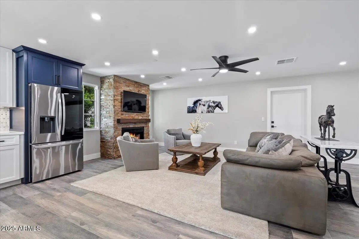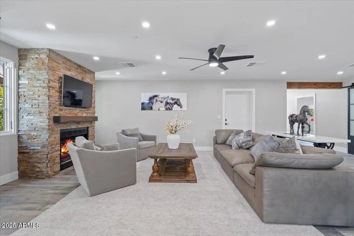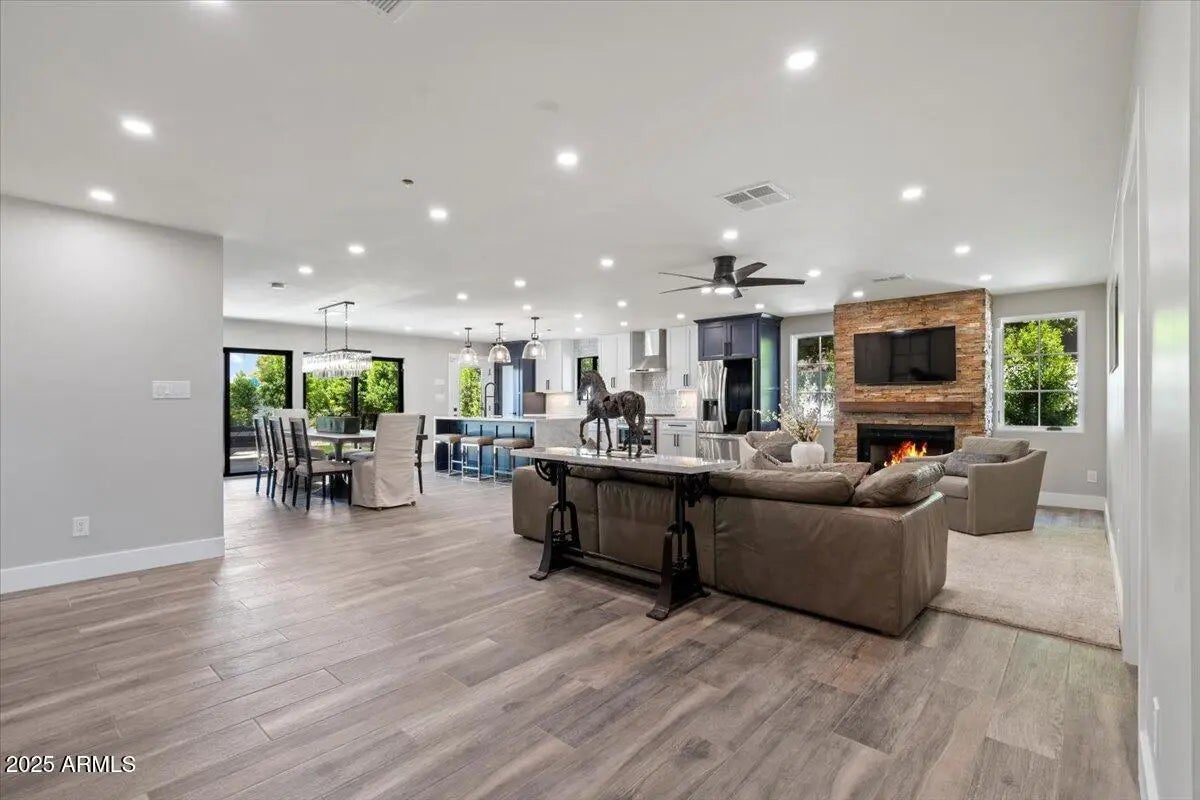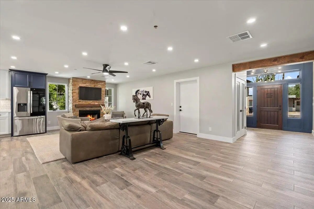 This beautifully updated, ranch-style, Italian crafted home offers the perfect blend of comfort, functionality, and luxury. With 4 spacious bedrooms plus a versatile bonus room—ideal for a home office, gym, or guest space—and 3 full bathrooms, there's generous living space for everyone. Step into the open-concept living space, where a large chef's kitchen steals the spotlight with stunning natural quartzite countertops, ample cabinetry, and premium appliances—perfect for entertaining or everyday cooking. Unwind in the cozy living room by the charming fireplace, or step outside to your personal backyard paradise. The sparkling pool with Baja deck invites you to cool off in style, while the outdoor kitchen and fully landscaped yard make this space ideal for hosting friend and family.
