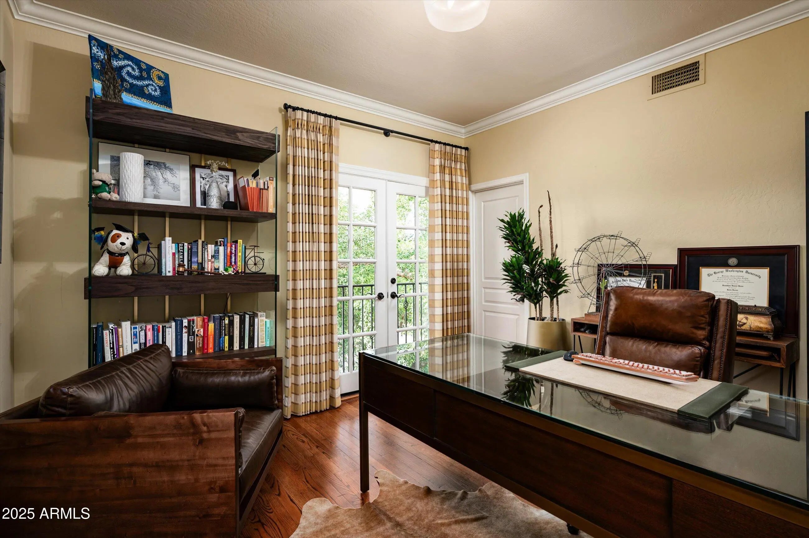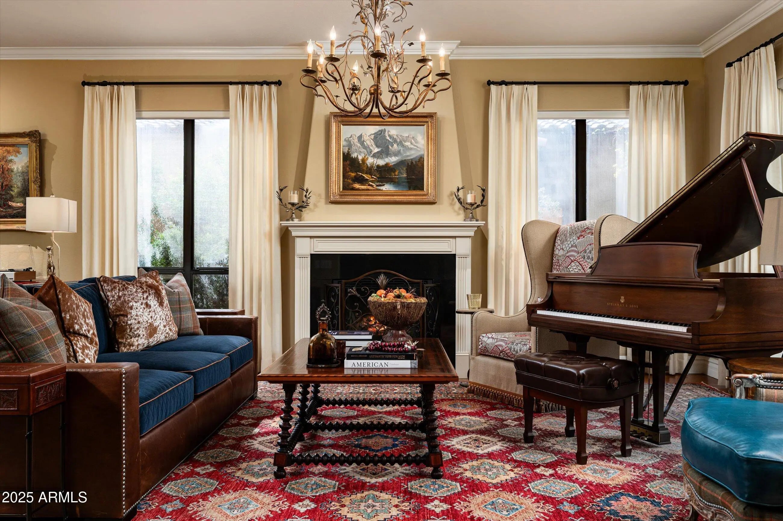 Welcome to a true Spanish Colonial masterpiece, a timeless architectural gem with subtle nods to the Arizona desert throughout. Privately tucked on a charming, tree-lined street of just five homes off Central Avenue, this residence offers rare privacy with unbeatable proximity to the Bridle Path, Uptown Farmers Market, and the area's best dining and schools. Inside, a grand staircase illuminated by sculptural American Agave sconces and custom Philip Jeffries wallpaper sets the stage beneath a sparkling crystal chandelier. Designed for both grand entertaining and everyday comfort, the floor plan flows effortlessly between formal and casual spaces. The west wing features a warm living room with gas fireplace, richly detailed executive office, and elegant dining room overlooking the pool and gardens. To the east, the spectacular "grand room" combines the family room, breakfast nook, and chef's kitchen, blending classic craftsmanship with modern luxury. Recently updated, the kitchen showcases custom wood cabinetry, white quartz countertops, decorative Spanish tile, and professional-grade Miele, Wolf, and Sub-Zero appliances. Every room on the main level opens to the lush backyard retreat, complete with shaded patios, an outdoor kitchen beneath a pergola, a cascading rock waterfall, outdoor fireplace, sparkling pool, and elevated spa accented with Spanish tile. Upstairs, the primary suite is a serene escape with sitting area, fireplace, and spa-like bath featuring dual vanities, Jacuzzi tub, walk-in shower, and expansive custom closet. Three additional bedrooms and ample storage complete the second level. Rarely does a home of this caliber come to market in North Central Phoenix, offering an elegant blend of timeless design, modern comfort, and authentic Arizona charm.