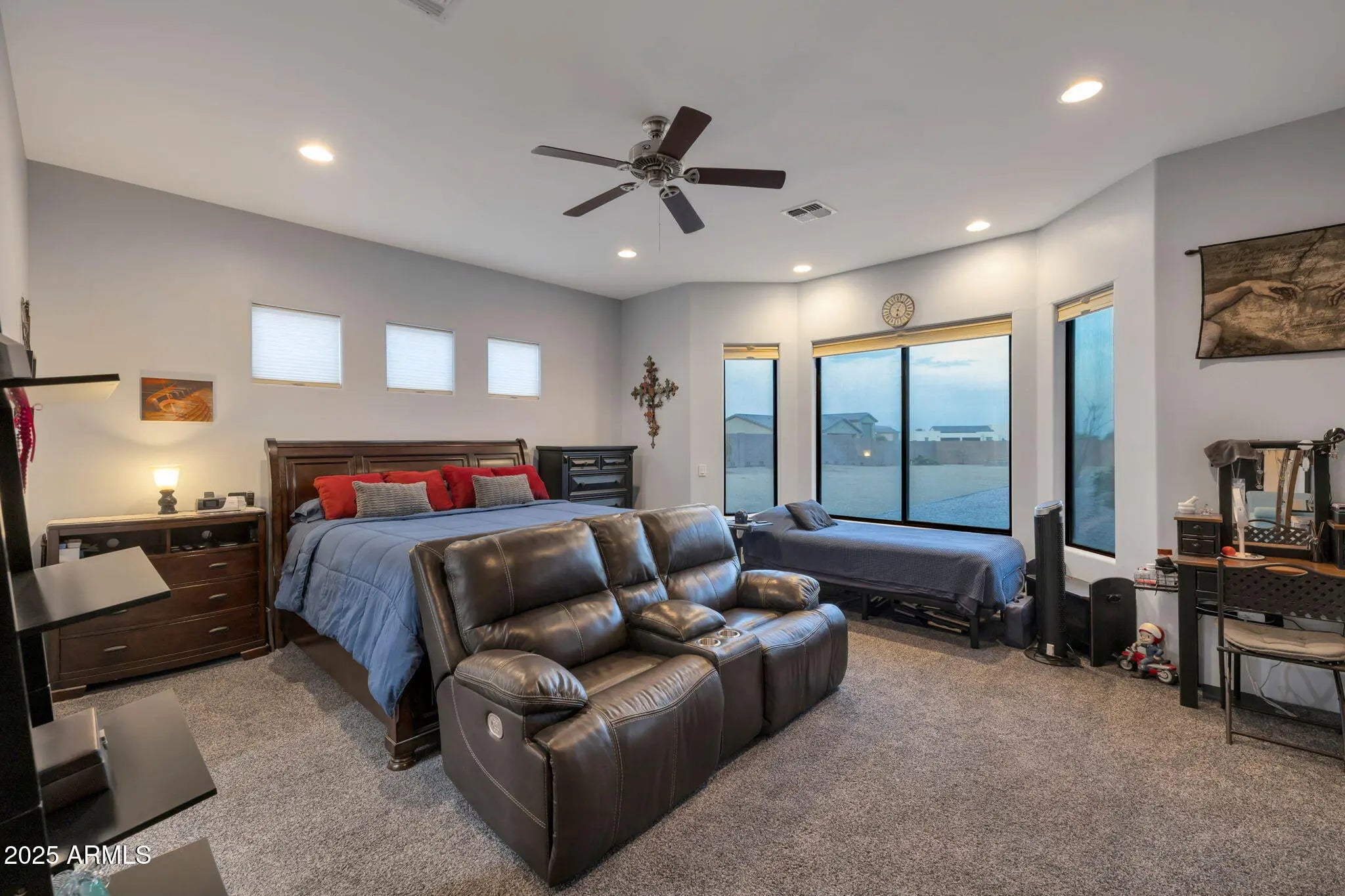 Discover this beautiful custom built Surprise home nestled in a cul-de-sac on an expansive acre+ lot offering privacy and room to spread out. The inviting backyard is a true retreat with a desert landscape and sparkling pool to take in the mountain views, perfect for Arizona summers. Inside, you will find spacious 12' ceilings and a split floor plan with a secondary suite with is own bathroom, walk in closet and outdoor access, ensures comfort and functionality, with upgrades throughout. This property also features RV gates on both sides of the home for easy access, plus a 3-car garage providing plenty of storage and parking. Whether entertaining by the pool or enjoying the peace and quiet of your private surroundings, this home combines comfort, updates, and space in one ideal package.