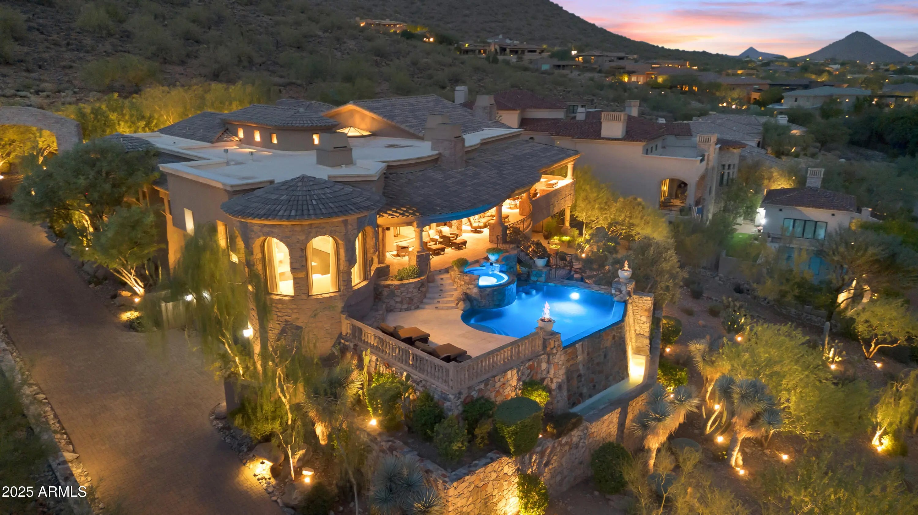 Perched atop the hillside in the exclusive guard-gated golf community of Ancala, nestled in the scenic foothills of the McDowell Mountains, this estate offers the lifestyle you've been dreaming of—right in one of Scottsdale's most sought after central locations. With sweeping panoramic views of Camelback Mountain, city lights, and unforgettable Arizona sunsets, this one-of-a-kind custom estate embodies luxury living at its finest. Arrive through a private driveway and gated entrance to a 6-car garage. Inside, the main level showcases an elegant primary suite retreat, formal living and dining rooms designed for grand entertaining, and a chef's dream gourmet kitchen featuring top-of-the-line appliances and designer finishes. A sophisticated library/home office, two additional en- -suite bedrooms, a wet bar, and a 1,500+ bottle temperature-controlled wine cellar complete this level. Expansive 17-foot sliding doors open to breathtaking views and seamless indoor-outdoor living, with wraparound patios and a misting system perfect for warm Arizona evenings. Take the private elevator to the expansive lower level, where two additional guest suites awaitone with its own living roomalongside a fully equipped home theater, game room with wet bar, state-of-the-art fitness center, and a spa sanctuary featuring both sauna and steam room. Outdoors, the resort-style backyard offers dramatic fire features, tranquil fireplaces, and a stunning double negative-edge pool and spa, all set against an unforgettable desert landscape. Ancala Country Club provides a variety of membership opportunities and is recognized as one of Arizona's premier private golf club, offering a community pool, fine dining, tennis, state-of-the-art fitness facilities, and vibrant social events.