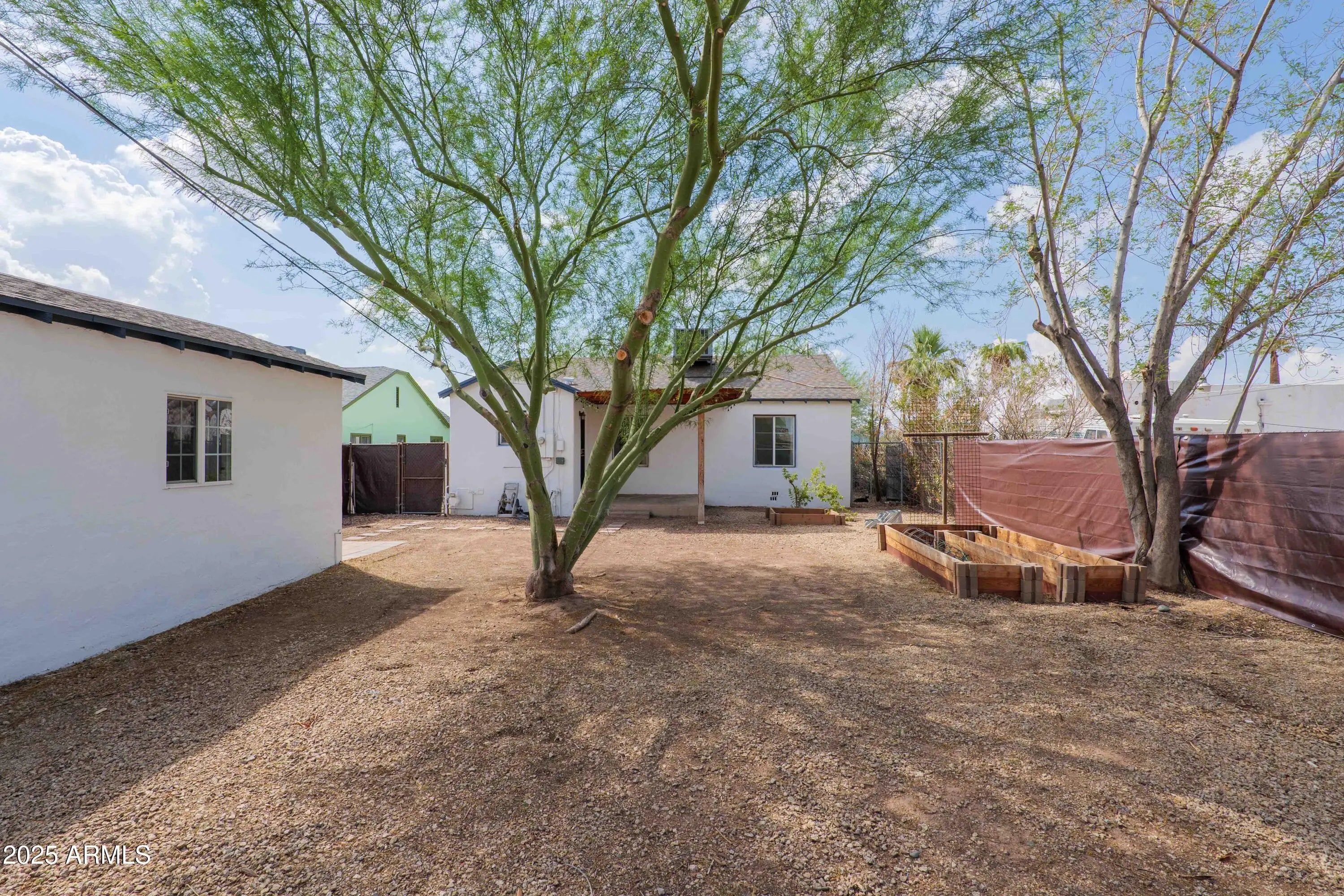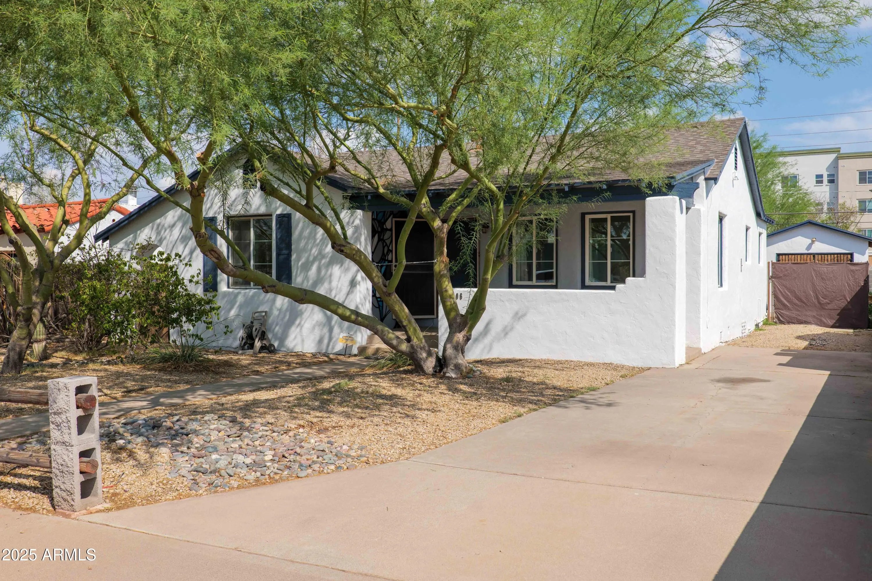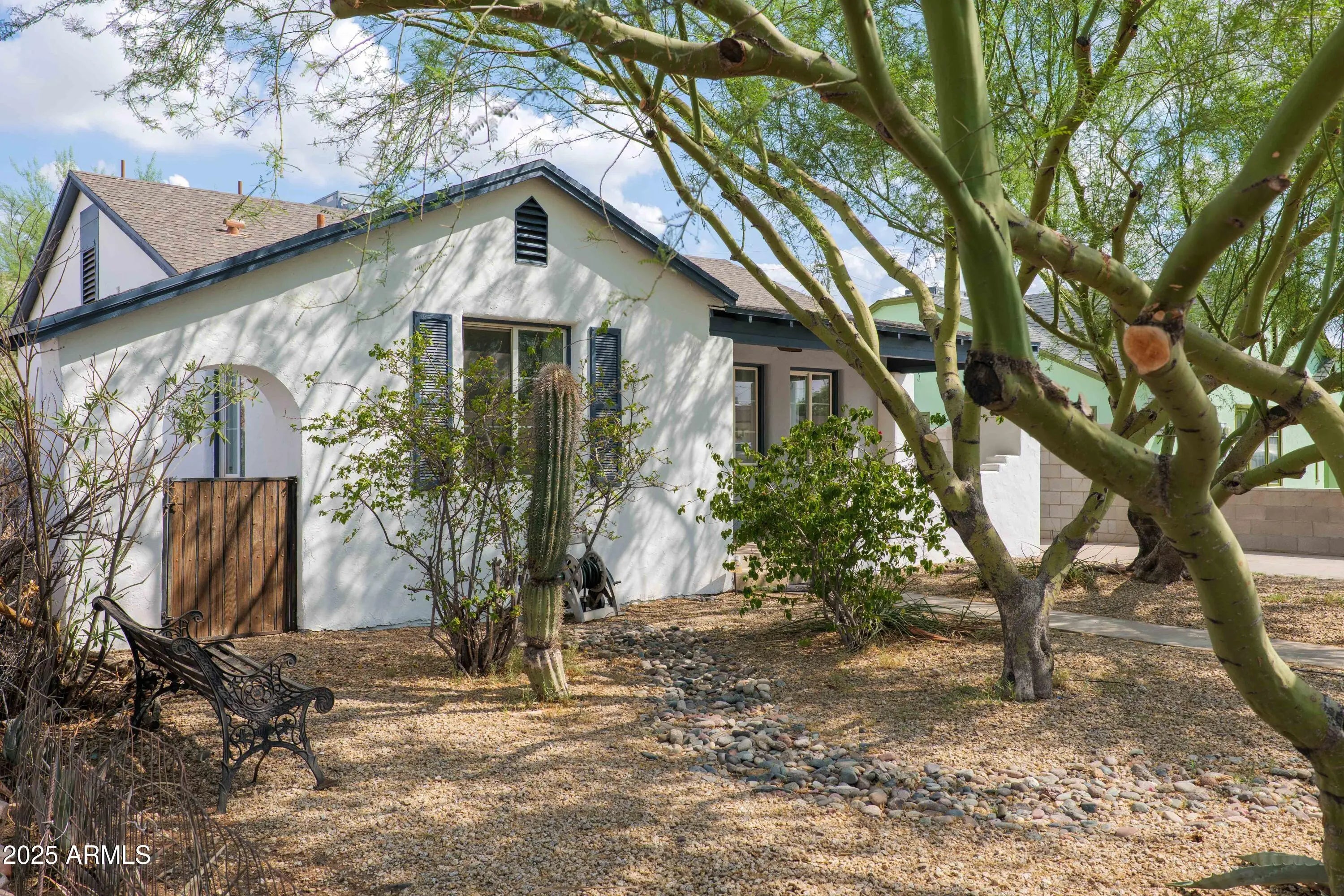 Come explore this well maintained adobe-cottage home, offering an ideal blend of historic charm and modern updates, located in the sought-after Garfield Historic District! With an impressive amount of square footage for a 2-bedroom / 1-bathroom house, both bedrooms are generously sized, and the bathroom is exceptionally spacious. There's a great opportunity to add an extra bathroom here, transforming the home into a 2bed/2bath gem without compromising any space in the bedrooms or living room. The property includes a detached studio (approx. 216 sq ft, not included in the listed total), perfect for a home office, gym, music room, art studio, or more. With a beautiful desert landscape featuring mature palo verde trees in both the front and backyard, maintenance is easy and affordable. Relax on the shaded front porch, which features a custom mural by a renowned local artist, adding a unique and personal touch to the exterior! Inside, the home seamlessly blends modern amenities with its historic character. Enjoy energy-efficient updates like Low-E dual pane windows, enhanced attic insulation, and modern appliances, while retaining the home's original charm - cove ceilings, vintage front door, original wood floors, crystal doorknobs, and lots of charming built-ins throughout the living spaces. Abundant natural light fills the interior, which is complemented by a spacious backyard, freshly painted interiors and exteriors, and a large laundry room with plenty of storage, a utility sink, and the convenience of a washer and dryer that convey. With a prime downtown location, this home puts you within walking or biking distance of the best local restaurants, entertainment venues, museums, coffee shops, and art galleries!
