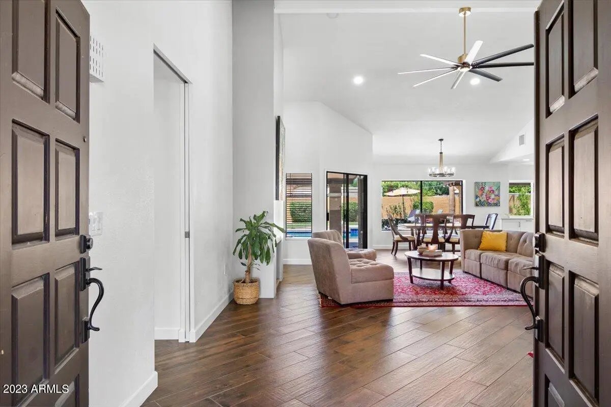 Hurry to this stunning REMODEL in Scottsdale Ranch! This beautiful home has 3 bedrooms, PLUS a flex space that could be used as an office/den/game room/ gym/secondary living area or whatever you can dream up! The vaulted ceilings coupled with an open concept floorplan really showcase this light, bright and inviting space. The magnificent eat in kitchen features an oversized island, cooktop, double ovens and storage galore. Wood look tile flooring t/o the entire house which means NO CARPET! Generously sized bedrooms and luxurious updated bathrooms make this a luxury rental you don't want to pass up! Not to mention this gem of a house is located on a huge cul de sac lot with a diving pool, extended covered patio and a 3 car garage! AND this location can't be beat! Refrigerator, washer, dryer, landscape & pool maintenance are all included. Pets are lessor approval. See it today!