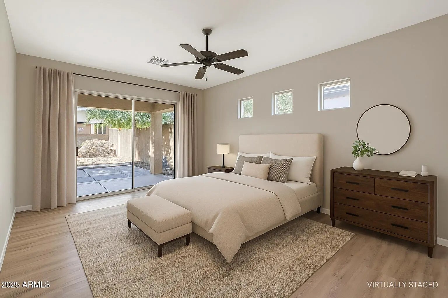Step into this light-filled and roomy 3 bed, 2 bath residence located in a secure, gated community. Featuring one of the most generous layouts—over 2,100 sq ft! The kitchen is perfect for entertaining, complete with a raised breakfast bar, custom backsplash, and abundant cabinetry. Relax by the elegant fireplace on cozy nights, or spend sunny afternoons at the community pool. Freshly painted and upgraded with beautiful new flooring in 2025, the home feels brand new. The primary suite offers private backyard access, a luxurious bathroom with dual sinks, soaking tub, and walk-in closet. Outdoors, enjoy a shaded backyard with covered patio, pavers, and mature landscaping. Welcome to South Mountain—where resort-style living is is part of everyday life!
