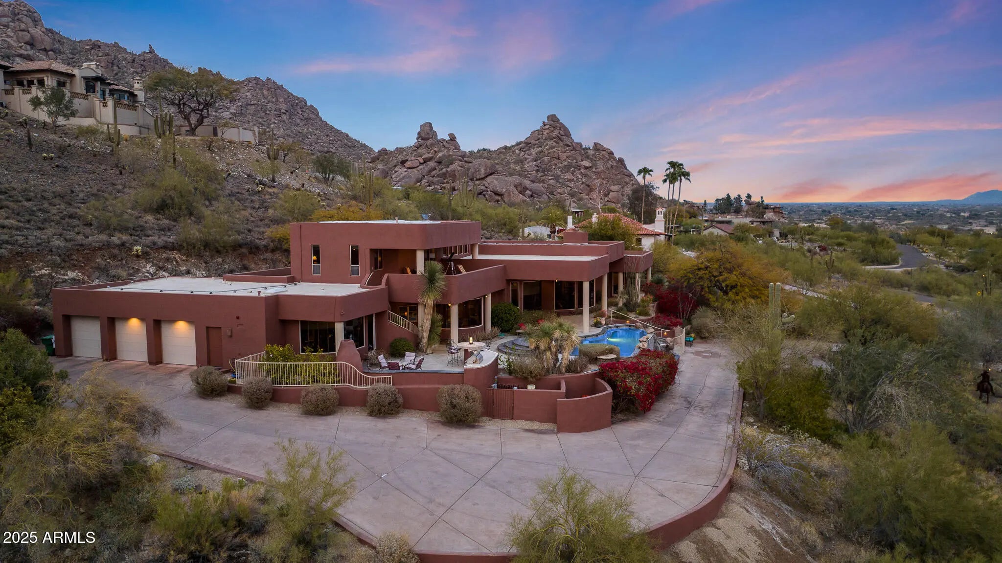 Nestled high on Black Mountain in the prestigious, gated Carefree Grand View Estates, this stunning southwest contemporary home offers an unparalleled lifestyle with sweeping city views, vibrant sunsets, and twinkling lights that create a breathtaking backdrop every evening. The 5,489 square foot residence is beautifully designed to blend modern luxury with the natural beauty of the surrounding hillside. Step inside to find a spacious circular living room with entertaining bar and breakfast room, gourmet chef's kitchen with picturesque windows. The main level is designed for convenience and luxury, offering a private primary suite with expansive views, a guest suite, a dedicated office, and a bonus room—perfect for a media room or additional living space. A seamless flow leads to the outdoor oasis, where the backyard is a resort-like retreat. The second level includes two luxurious en-suite bedrooms, a cozy sitting room with its own kitchenette, and a spacious view deck patioideal for relaxing or hosting guests while taking in the stunning vistas. Outside, the grounds are equally impressive, set on 1.88 acres of hillside terrain. The negative-edge saltwater pool appears to cascade into the horizon, complemented by a 20-foot waterfall flowing from the mountainside. Additional features include a fire pit and ample patio space for dining and lounging, creating the perfect atmosphere for outdoor living and entertaining. The home also boasts a three-car garage and is perfectly situated to offer privacy, tranquility, and the ultimate in scenic desert living. This is a rare opportunity to own a one-of-a-kind residence in one of Carefree's most sought-after communities.