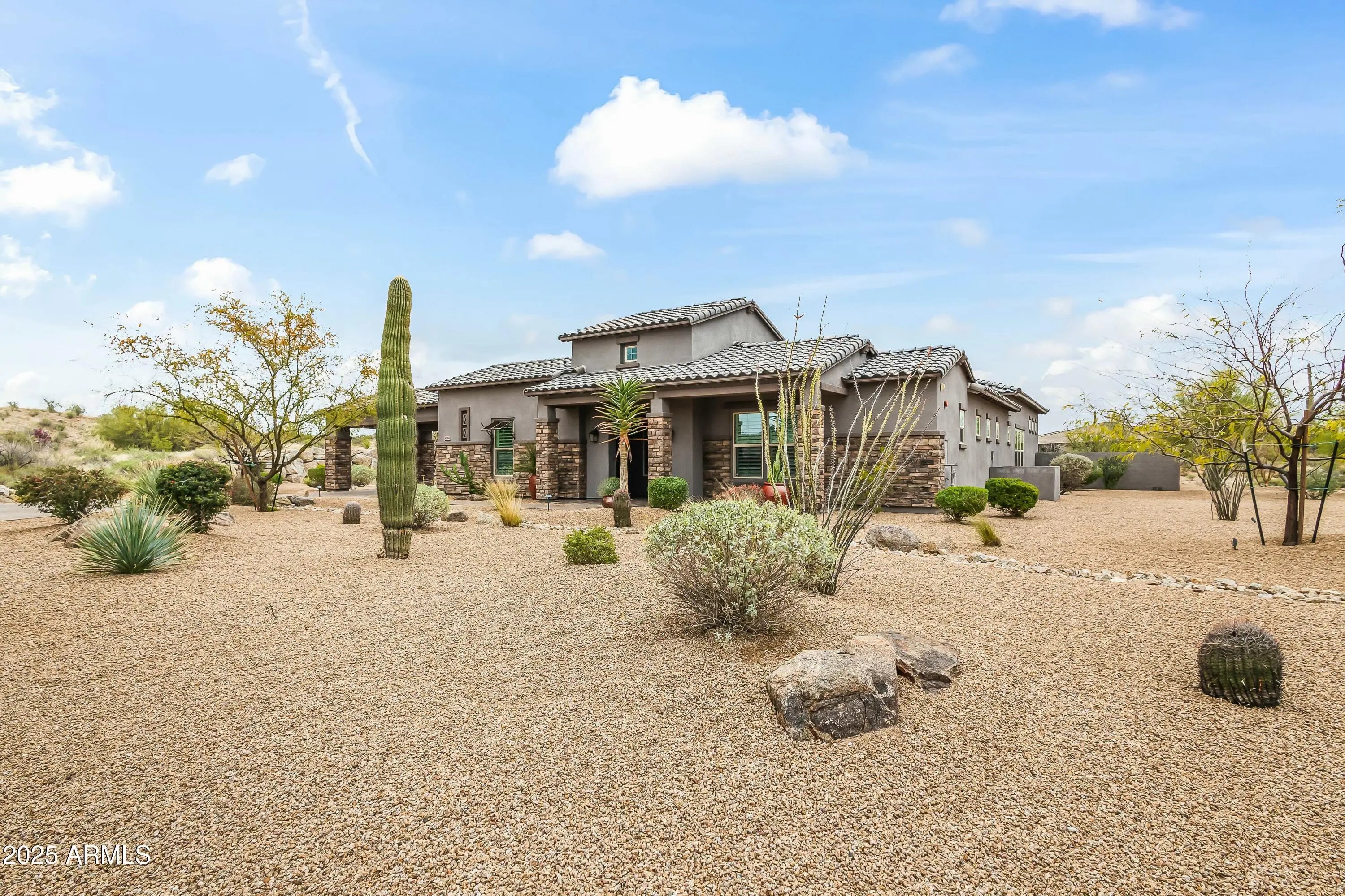 Situated in the private, gated community of Copper Sky in N Scottsdale, this 3-bedroom, 4.5-bath retreat sits on a premium 1.4-acre cul-de-sac lot. The meticulously landscaped south facing backyard offers a resort-style setting, featuring a covered patio with misters, heated pool with Baja shelf, spa, decorative gas urns and firepit, built-in barbecue bar, and putting green. This exceptionally maintained residence, built in 2019, offers a modern design, and numerous upgrades throughout, including a separate prep kitchen with full fridge and walk in pantry, speaker and alarm systems, and electronic shades. Lightly lived in and move-in ready, the home features en-suite bathrooms for every bedroom, along with a powder room and a full bath with direct access from the pool patio. The primary suite is separate from the secondary bedrooms and features a spacious private office/ lounge area, walk-through shower, and oversized walk-in closet with direct access to the laundry room. The great room, dining area, and kitchen are thoughtfully designed for indoor-outdoor living, with stacked sliding glass doors that enhance natural light and create a seamless open flow for both ease of daily function as well as effortless entertaining.