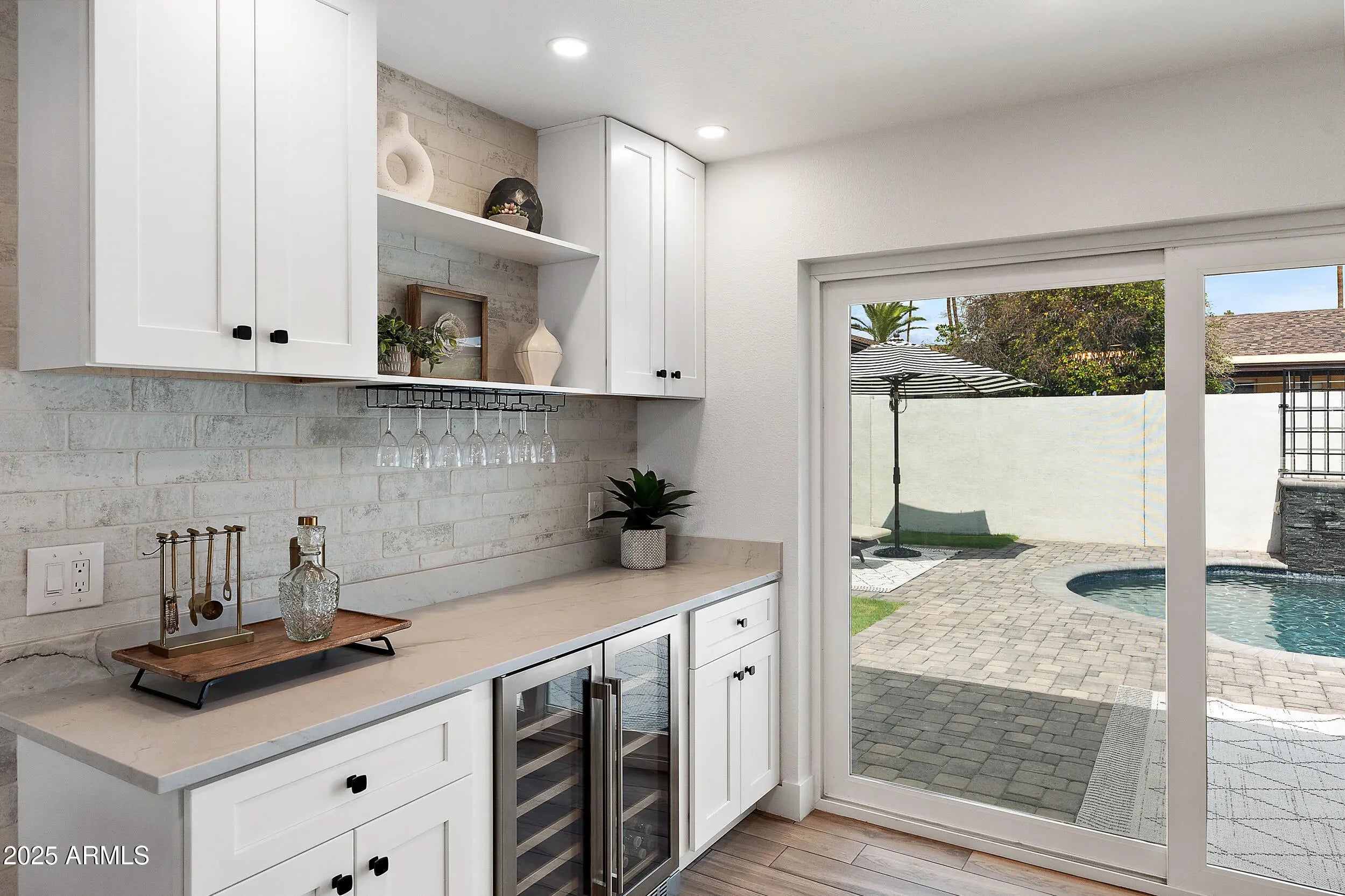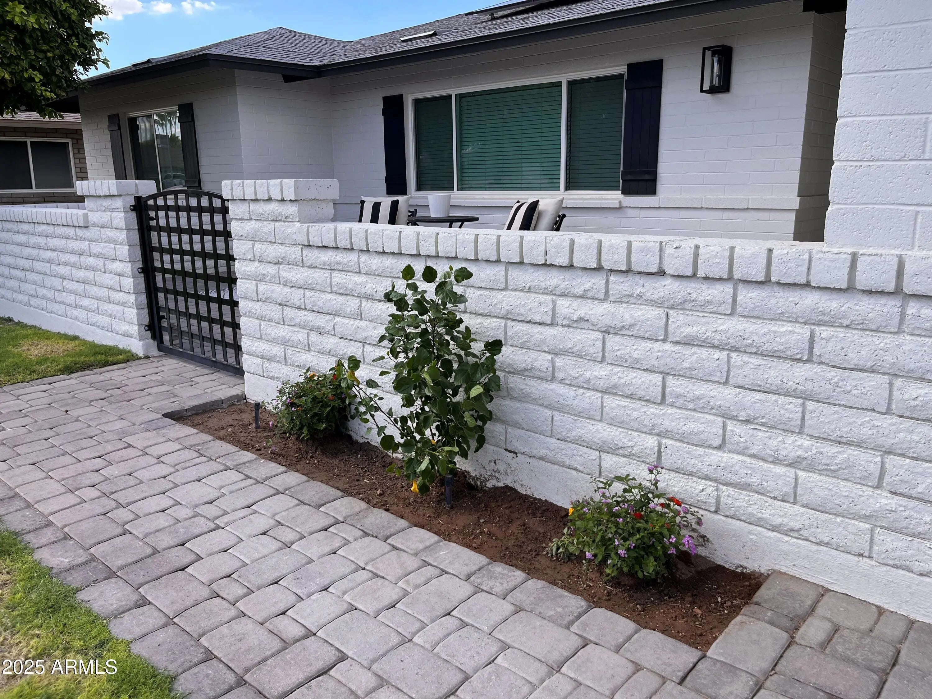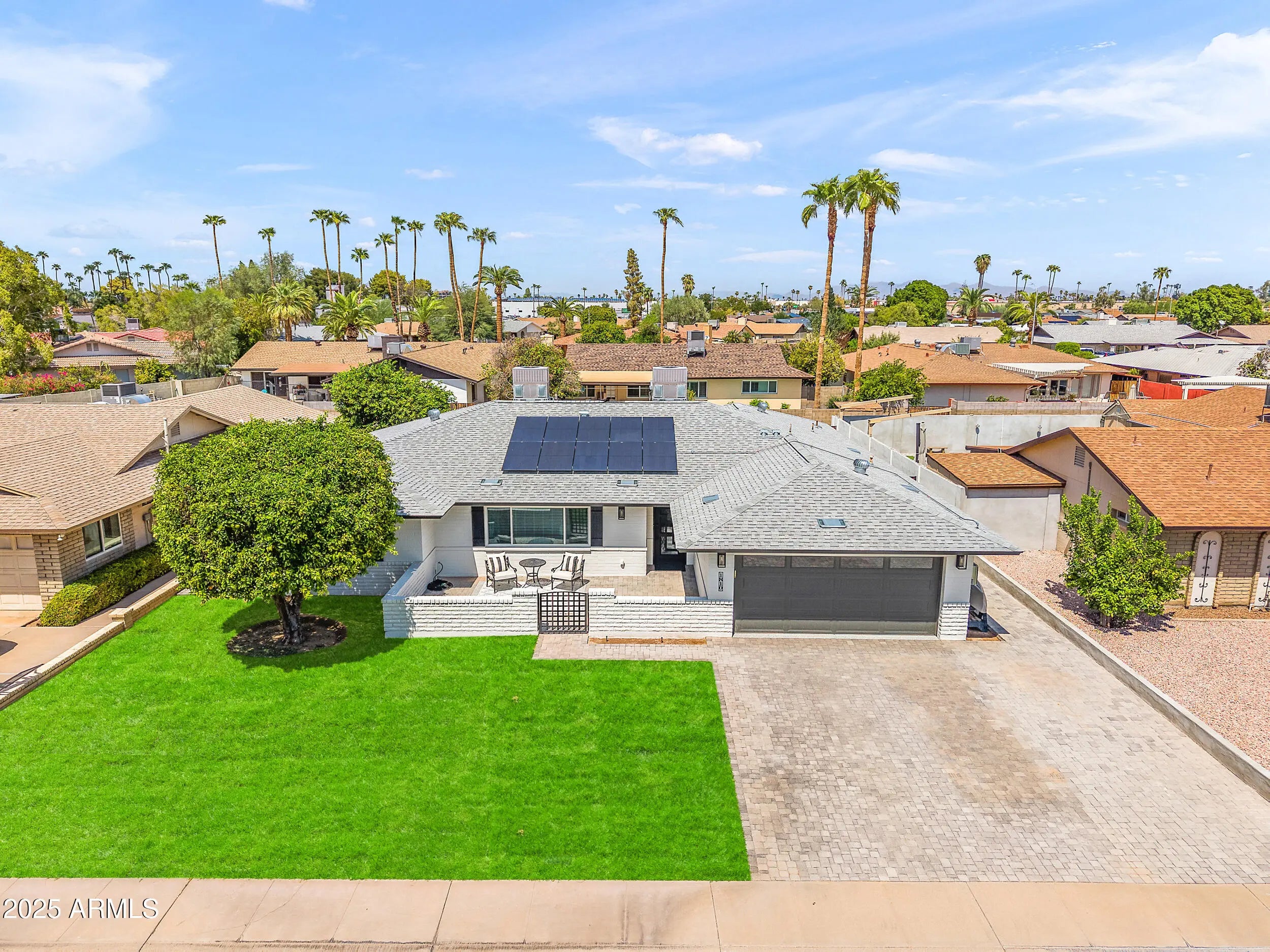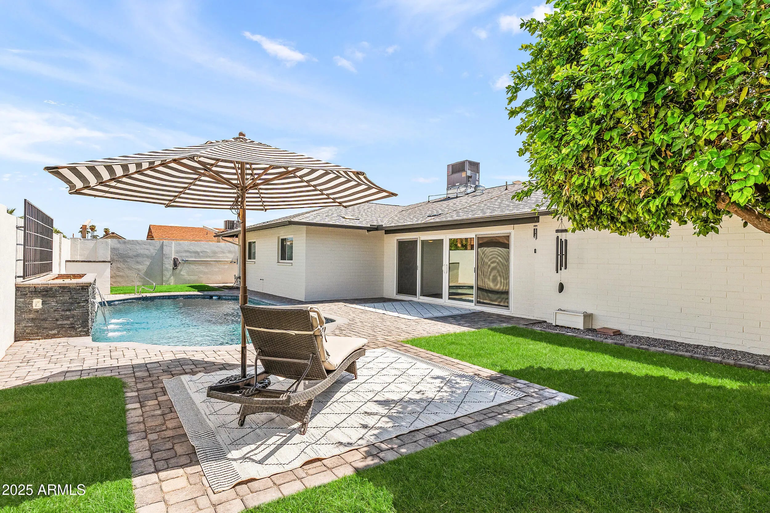 Exquisite Mid-Century Modern Retreat in Tempe This fully reimagined 5-bedroom, 2-bathroom mid-century modern home blends timeless design with today's luxury. Built in 1974 and crafted from classic slump block (with all exterior walls injected with insulation), it has been thoughtfully renovated top-to-bottom over a 2 year time span with meticulous attention to detail at a cost over $250K. The light-filled, open-concept floor plan features raised kitchen ceiling, all-new windows and doors, wood-look tile flooring, NO carpet, 5.5'' baseboards, and designer touches including white brick accent walls and board & batten details. At the heart of the home, the chef's kitchen shines with Bosch stainless appliances, including a Professional pedistal DUAL FUEL gas range, fridge & dishwasher, BUILT-IN Sharp drawer microwave & stainless steel range hood; ALL complemented by Arizona Tile's stunning "mont "blanc" Quartzite natural stone ("3CM") countertops in kitchen and bar area. Both bathrooms along with laundry room countertops are the same "Mont Blanc" Quartzsite countertops in 2CM. The redesigned laundry room, expanded gas line, recessed dimmable led lighting, and custom wine/beverage bar along with dual fridges elevate everyday living. Step outdoors to your brand-new pebble-SHEEN pool with waterfall and planter, illuminated by high-tech lighting in pool and waterfall. Surrounding the pool and property is a massive insulation of new pavers, extending across the wide driveway, courtyard, side yards and patio for a true resort-like setting. There is also a front walled/paver courtyard for soirees or just welcoming dinner guests. Offered at $895K, this one-of-a-kind Tempe home is simply better than new!