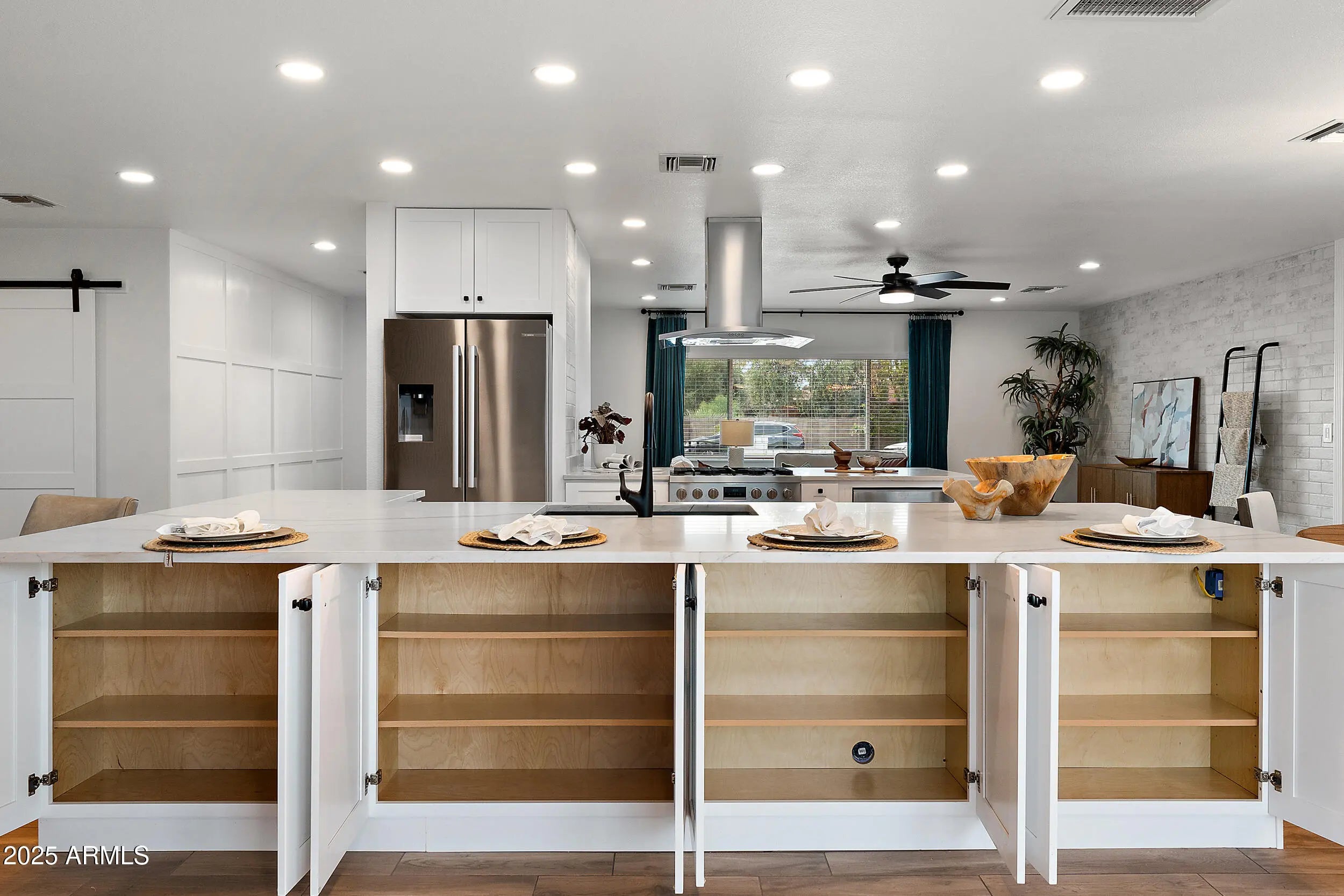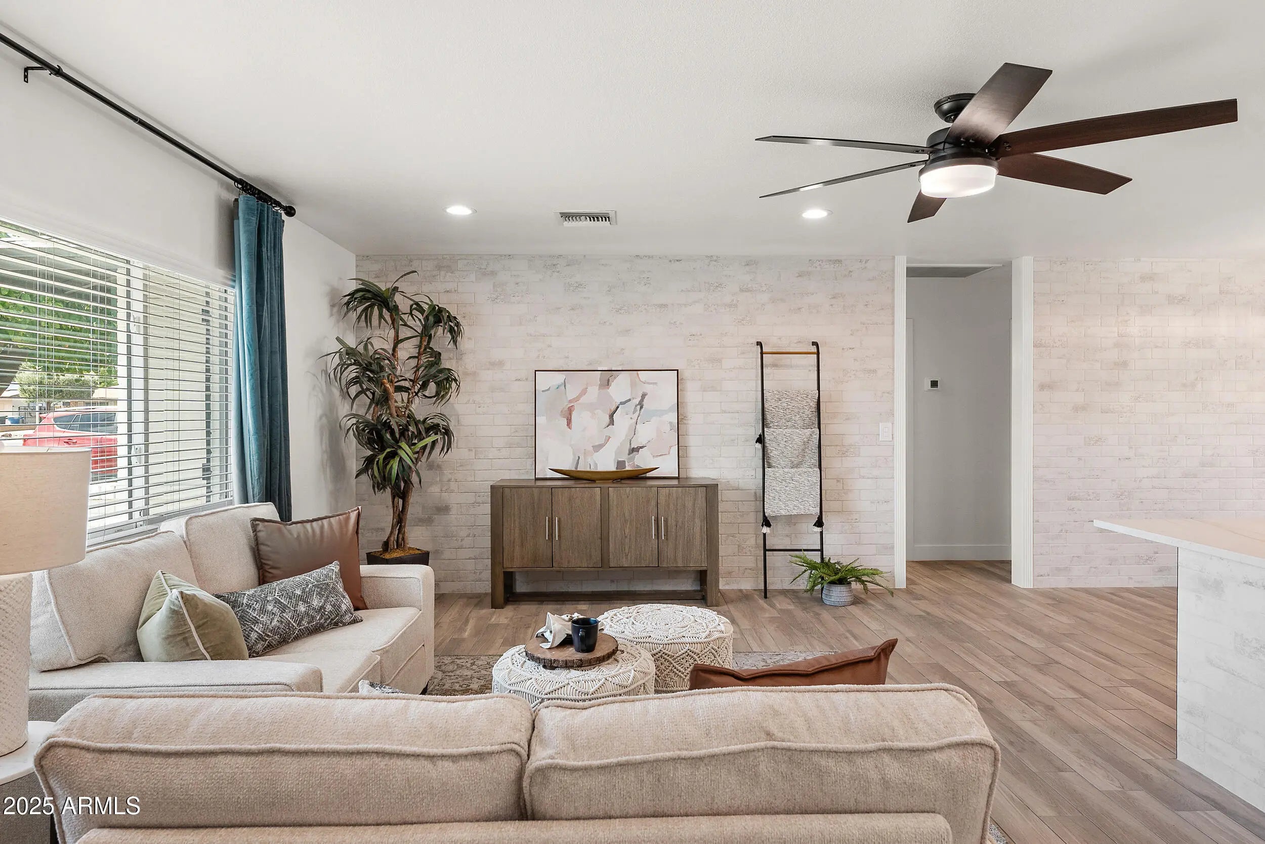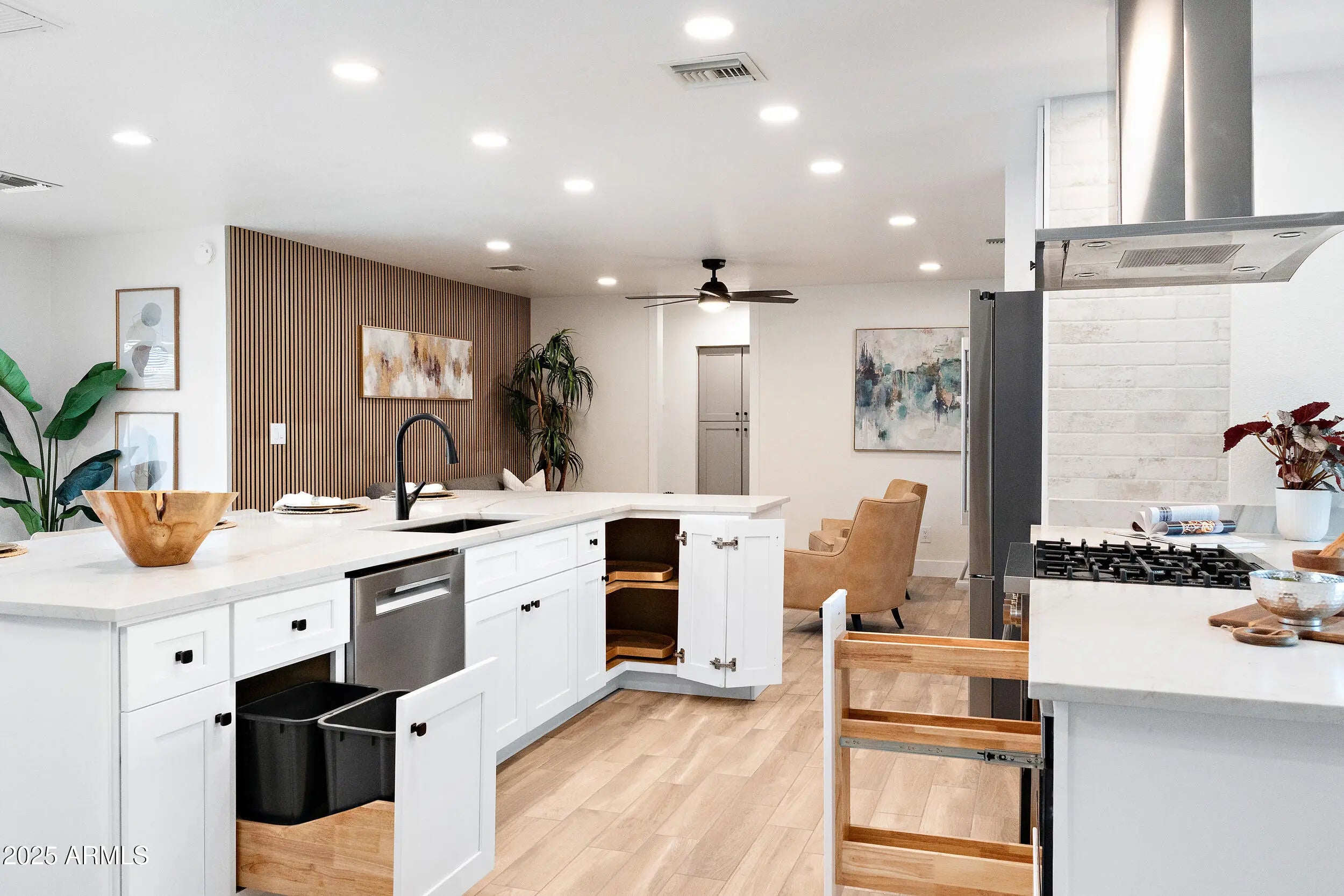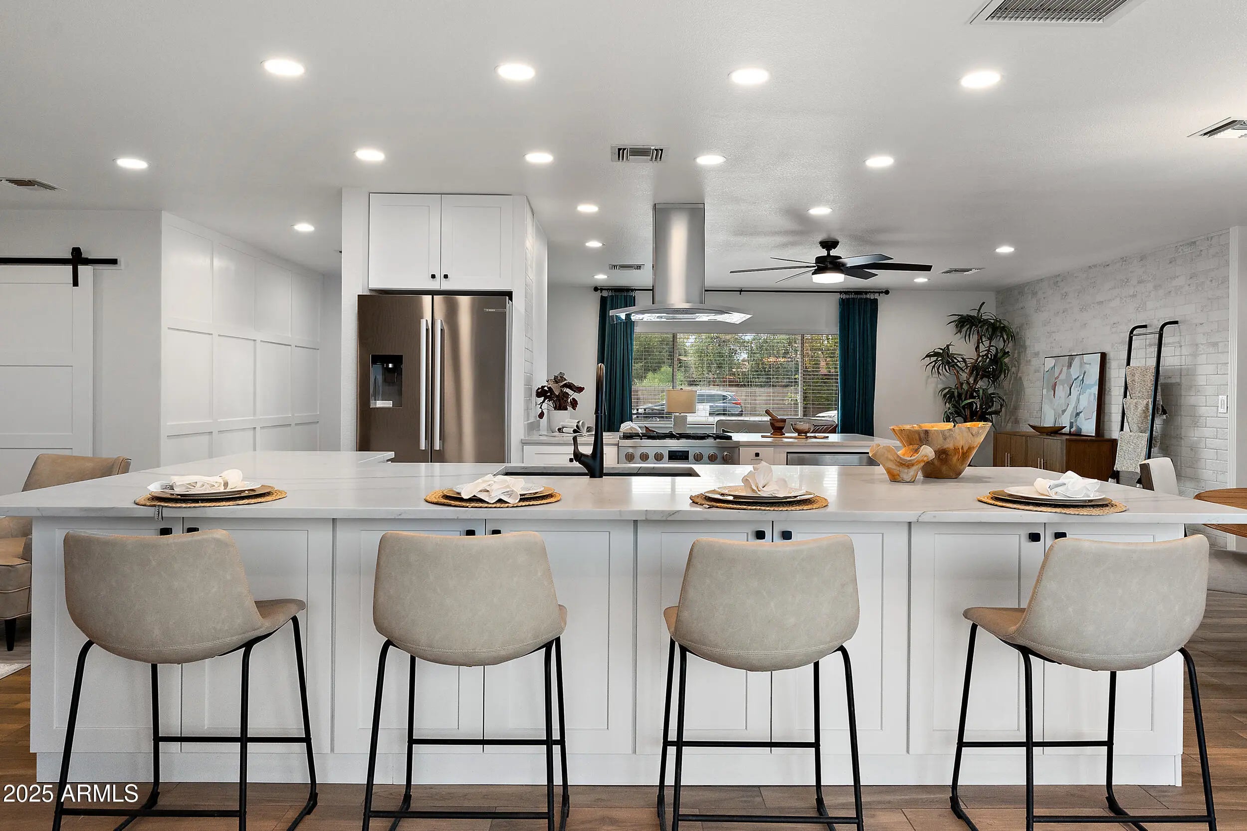 Exquisite Mid-Century Modern Retreat in Tempe This fully reimagined 5-bedroom, 2-bathroom mid-century modern home blends timeless design with today's luxury. Built in 1974 and crafted from classic slump block (with all exterior walls injected with insulation), it has been thoughtfully renovated top-to-bottom over a 2 year time span with meticulous attention to detail at a cost over $250K. The light-filled, open-concept floor plan features raised kitchen ceiling, all-new windows and doors, wood-look tile flooring, NO carpet, 5.5'' baseboards, and designer touches including white brick accent walls and board & batten details. At the heart of the home, the chef's kitchen shines with Bosch stainless appliances, including a Professional pedistal DUAL FUEL gas range, fridge & dishwasher, BUILT-IN Sharp drawer microwave & stainless steel range hood; ALL complemented by Arizona Tile's stunning "mont "blanc" Quartzite natural stone ("3CM") countertops in kitchen and bar area. Both bathrooms along with laundry room countertops are the same "Mont Blanc" Quartzsite countertops in 2CM. The redesigned laundry room, expanded gas line, recessed dimmable led lighting, and custom wine/beverage bar along with dual fridges elevate everyday living. Step outdoors to your brand-new pebble-SHEEN pool with waterfall and planter, illuminated by high-tech lighting in pool and waterfall. Surrounding the pool and property is a massive insulation of new pavers, extending across the wide driveway, courtyard, side yards and patio for a true resort-like setting. There is also a front walled/paver courtyard for soirees or just welcoming dinner guests. Offered at $895K, this one-of-a-kind Tempe home is simply better than new!