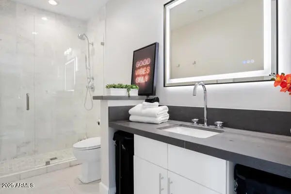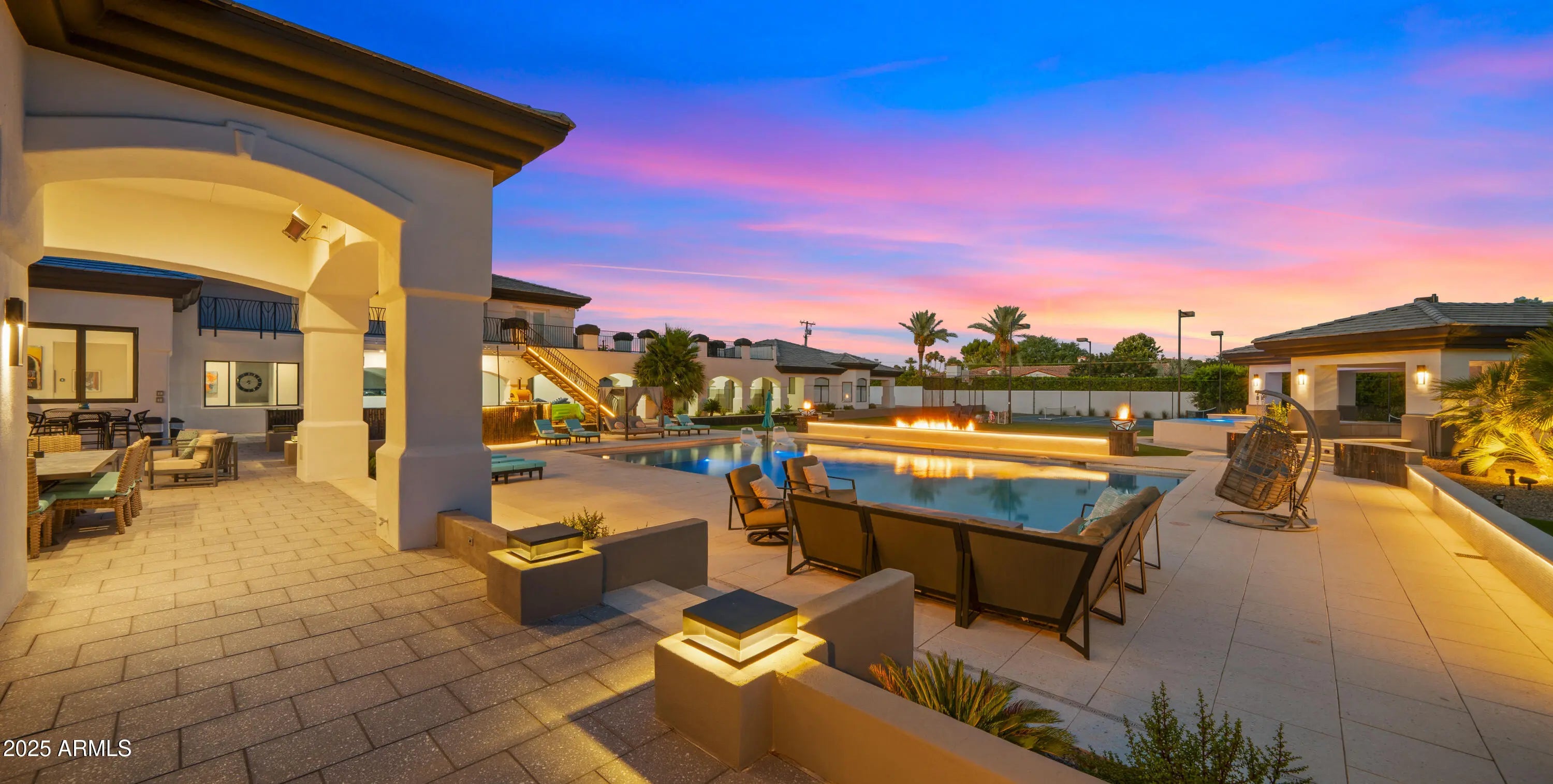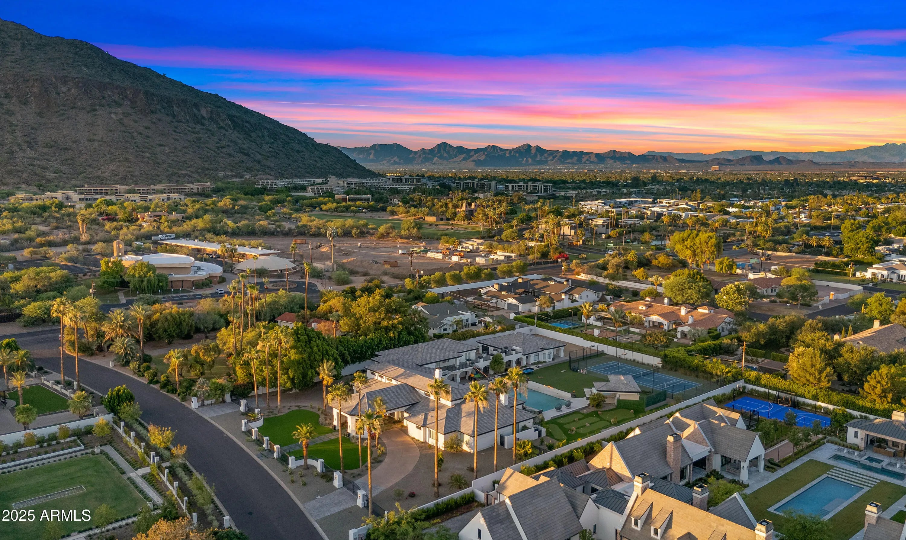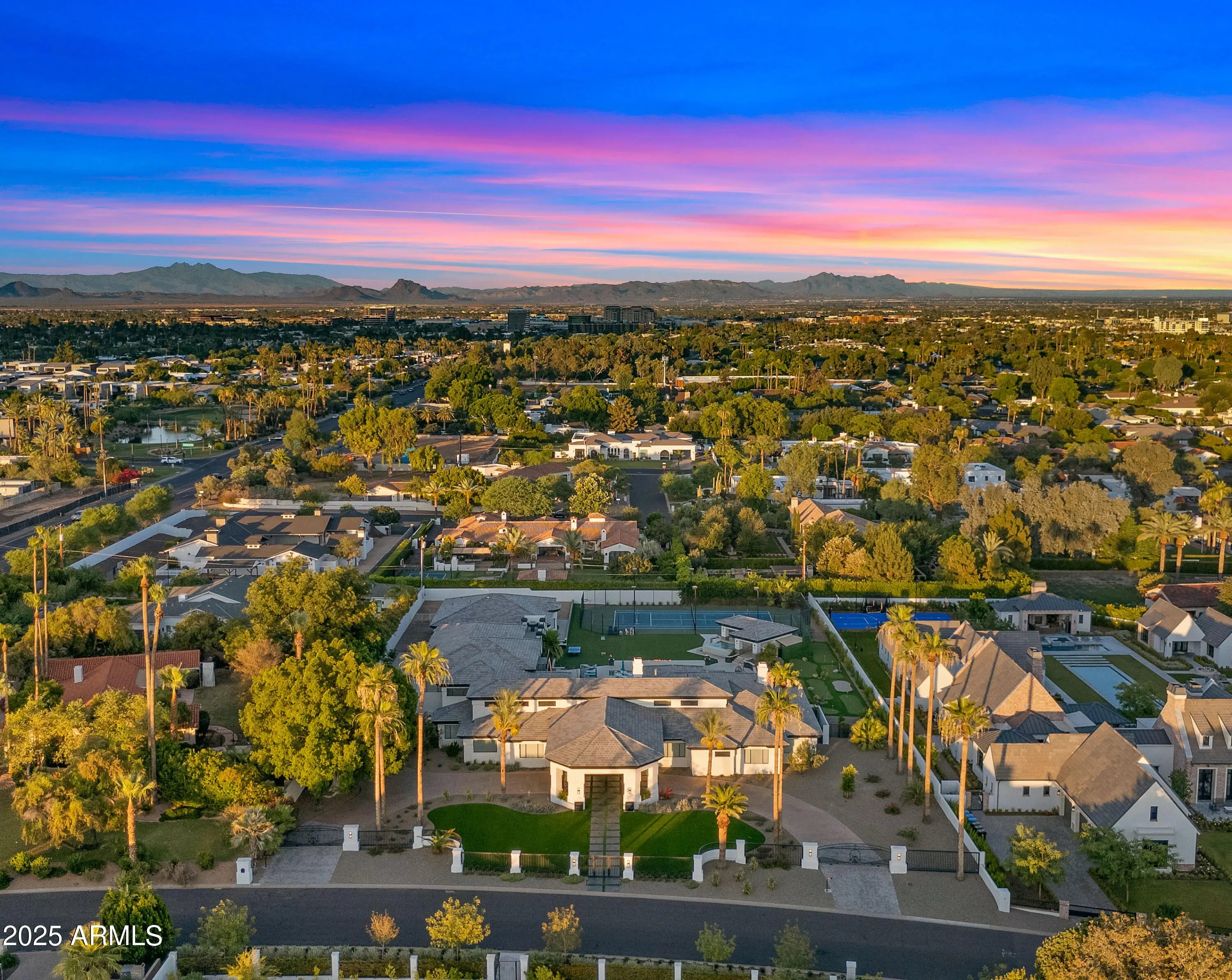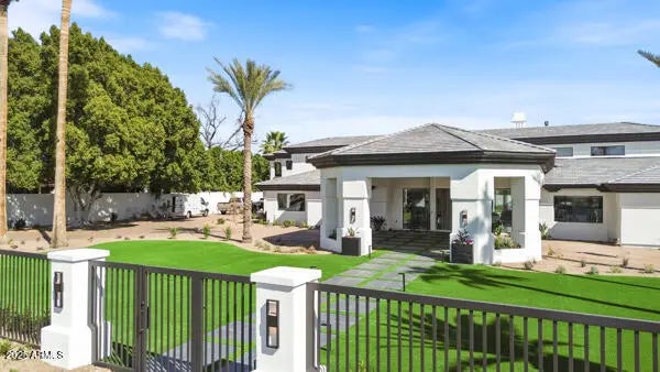 Welcome to the Arcadia Estate — a rare resort-style luxury residence in the heart of Arcadia proper, free from HOA restrictions. Nestled on one of the most prestigious streets, this nearly 10,000 SQFT residence captures iconic Camelback Mountain views while resting on an expansive lot of almost 1.5 acres—one of the largest and most private properties in Arcadia. The setting combines grandeur with seclusion, creating the feeling of a private resort in the city. The grounds are nothing short of world-class, featuring a sparkling pool, full-size jacuzzi, infrared sauna, lighted tennis court, and private putting green—delivering the ultimate in recreation, relaxation, and entertainment. Inside, the home showcases lavish interiors with timeless sophistication. The expansive great room boasts soaring ceilings and a seamless flow into the chef's gourmet kitchen, designed for both elegance and functionality. With a total of 8 luxurious bathrooms, including a spa-like steam shower, the home offers ample comfort and convenience for residents and guests alike. The main level features three en-suite bedrooms, each thoughtfully designed, while the upstairs wing includes a spacious family room, a private gym, two additional bedrooms, and a full bath with a separate entry, ideal for guests or extended family. This home is truly move-in ready, with furnishings available on a separate bill of sale, each piece custom-selected to complement and perfectly fit the residence. The guest house is a luxury retreat of its own, offering a full kitchen, living area, two bedrooms, two bathrooms, laundry facilities, and private garageperfect for guests or extended stays.