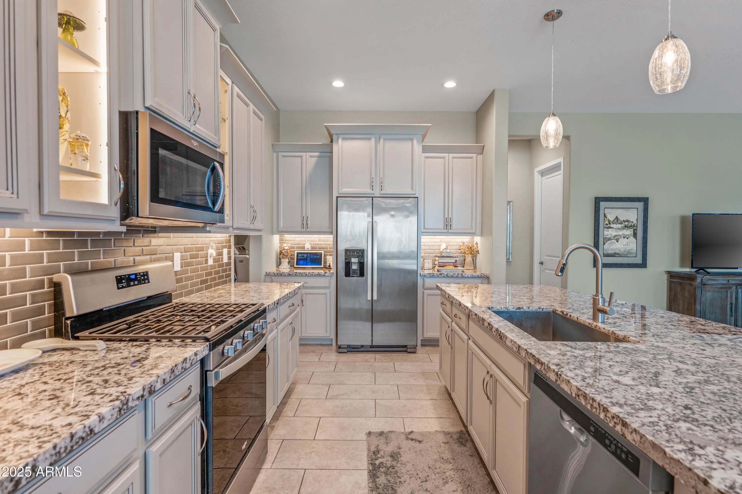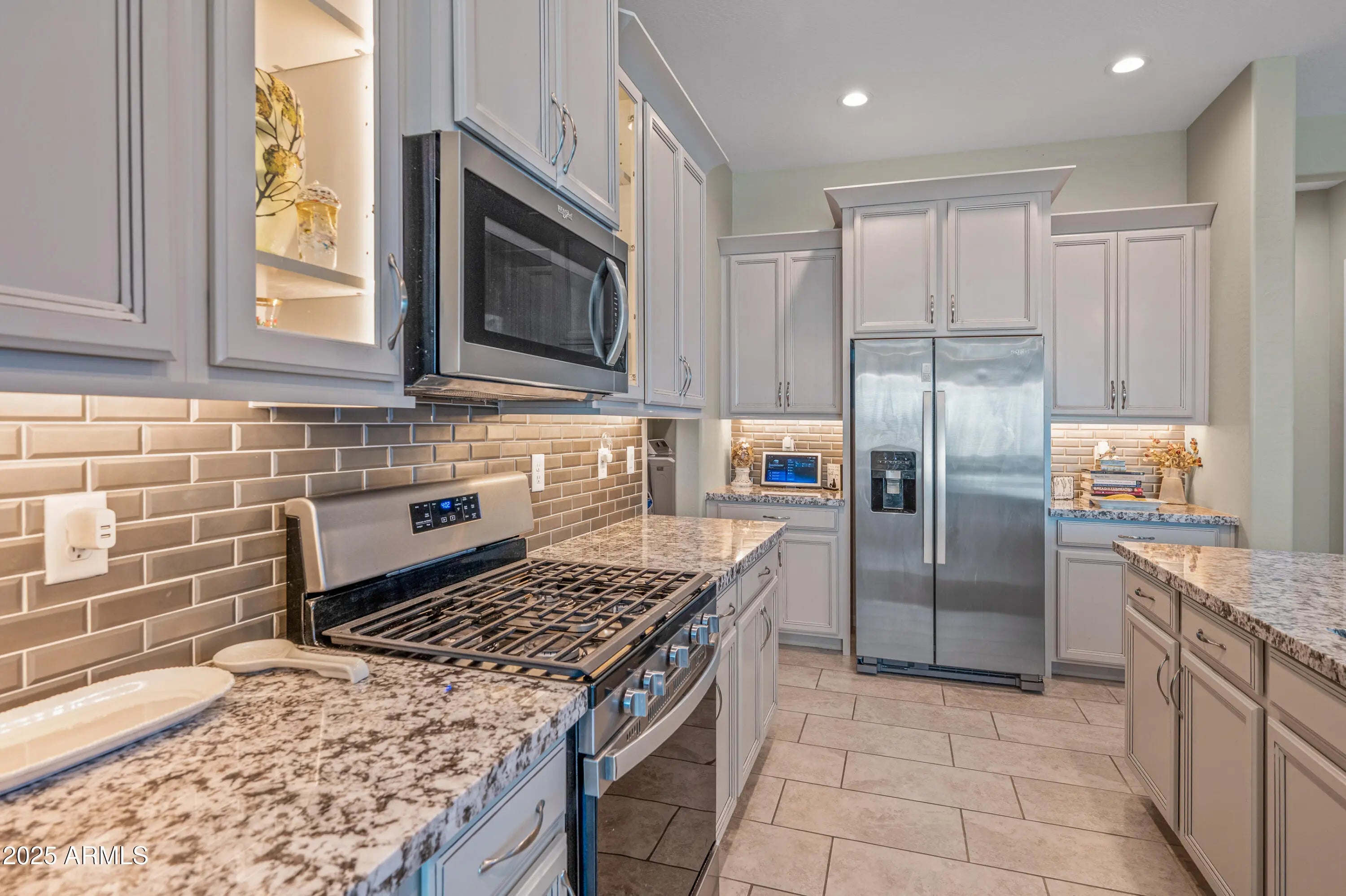 Welcome to this beautifully upgraded home in the award-winning 55+ community of Province in Maricopa. Built in 2021 and set on a desirable corner lot with no neighbors behind, this residence offers privacy and a greenbelt backdrop you'll appreciate year-round. Step through the gated front courtyard into a bright, open layout featuring a split floor plan, plank tile flooring and plantation shutters throughout. The kitchen is a true centerpiece with granite counters, tile backsplash, crown-topped cabinetry, glass display cabinets with interior lighting, undercabinet lighting and stainless appliances including a gas range. A reverse osmosis system plumbed to the refrigerator, water softener and a walk-in pantry add both convenience and functionality. The spacious owner's suite is enhanced by a bay window that fills the room with natural light. The ensuite bath features dual sinks with vanity seating, custom chandelier lighting, a private water closet, and a walk-in closet. Additional highlights include an extended garage, large laundry room with cabinets, shelving, and plumbing for a utility sink, and Berber carpet in bedrooms for comfort. Outdoors, enjoy an L-shaped covered patio perfect for relaxing or entertaining with peaceful greenbelt views. Some furniture available on separate bill of sale. Province offers a lifestyle unlike any other with guarded gates, community lakes, walking paths, pickleball, fitness center, indoor/outdoor pools, and endless activities.