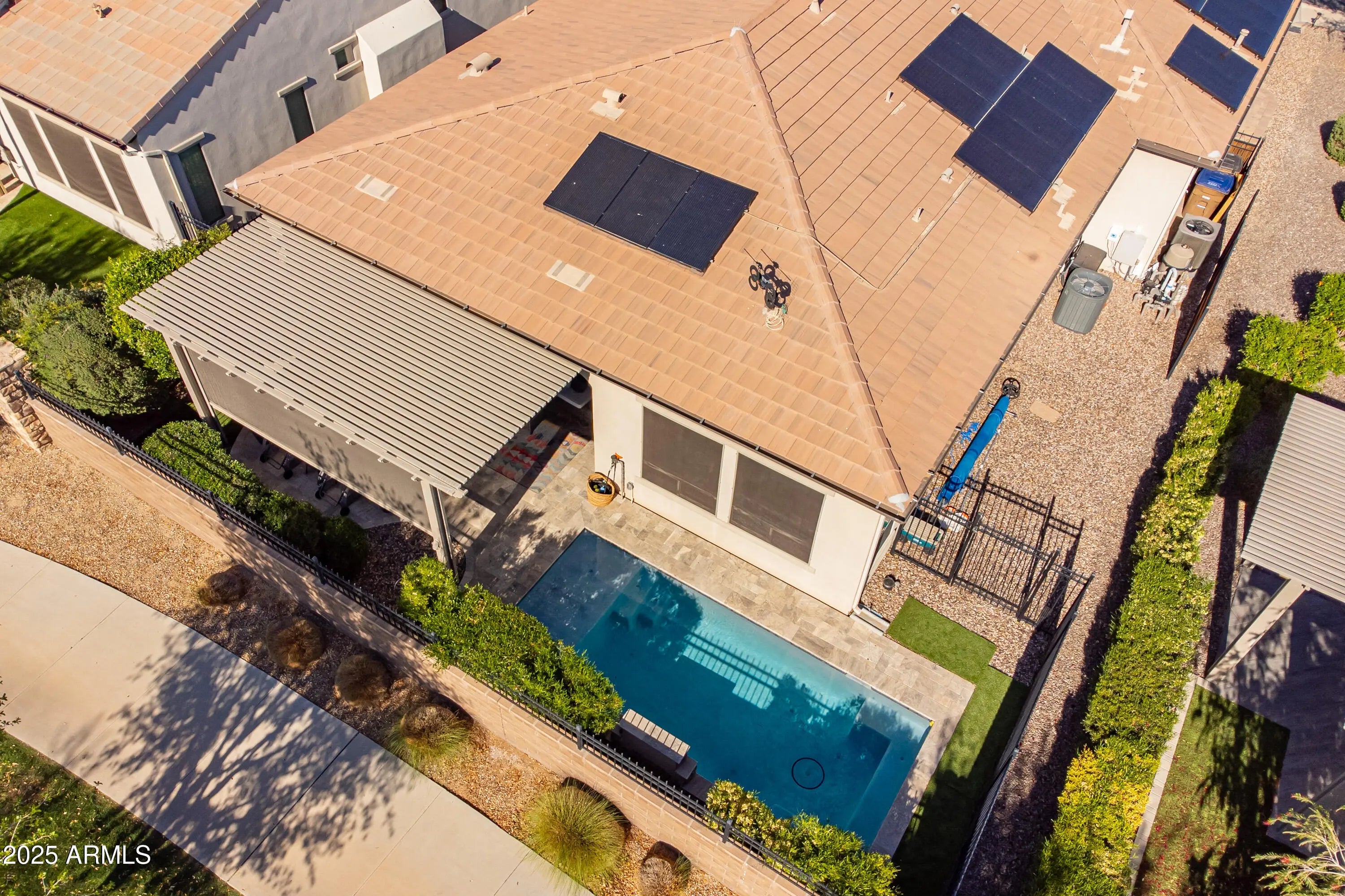 Wow, you will LOVE this beautiful Captivate floor plan, with your own private heated pool, 2 car garage PLUS golf cart garage AND PAID SOLAR!! Situated near the Algarve club with pickleball courts, bocce ball, art studio and all of the amazing things the Algarve club area has to offer. This home is beautifully appointed with a custom built in bar w/beverage fridge, Auto shades in primary suite and sliding doors in great room, tile floors, gorgeous kitchen with granite and custom backsplash. Primary bath with two separate sink areas for your own space and spacious walk-in closet. This rear yard is made for entertaining, with pergola, pool with fountain and room for guests or quiet morning coffee. This home is truly living ''The Good Life''!