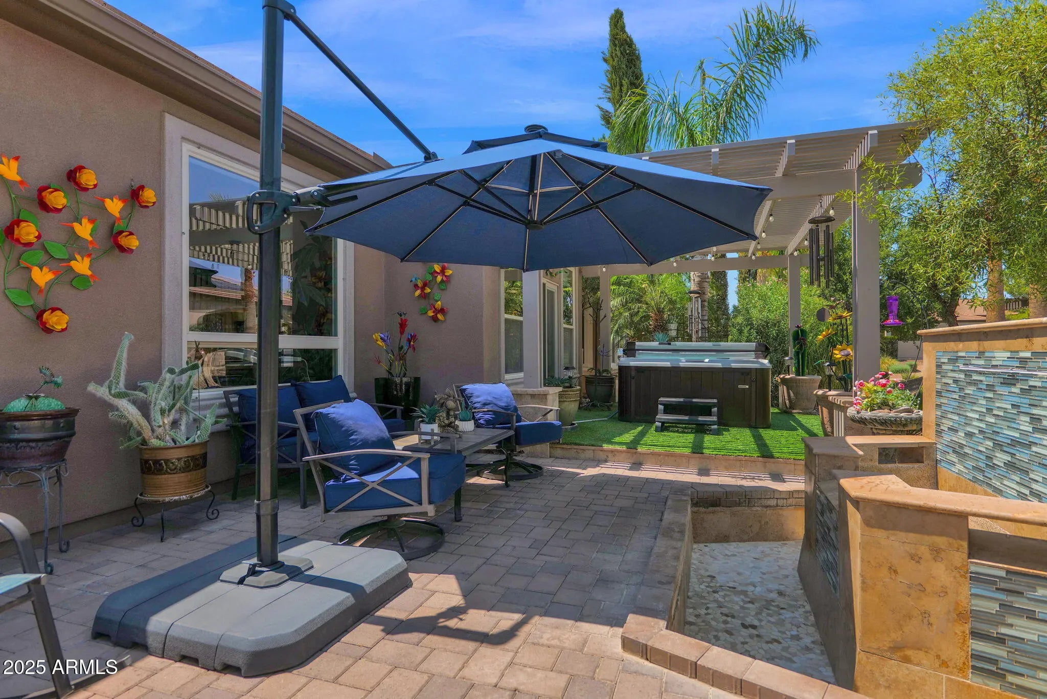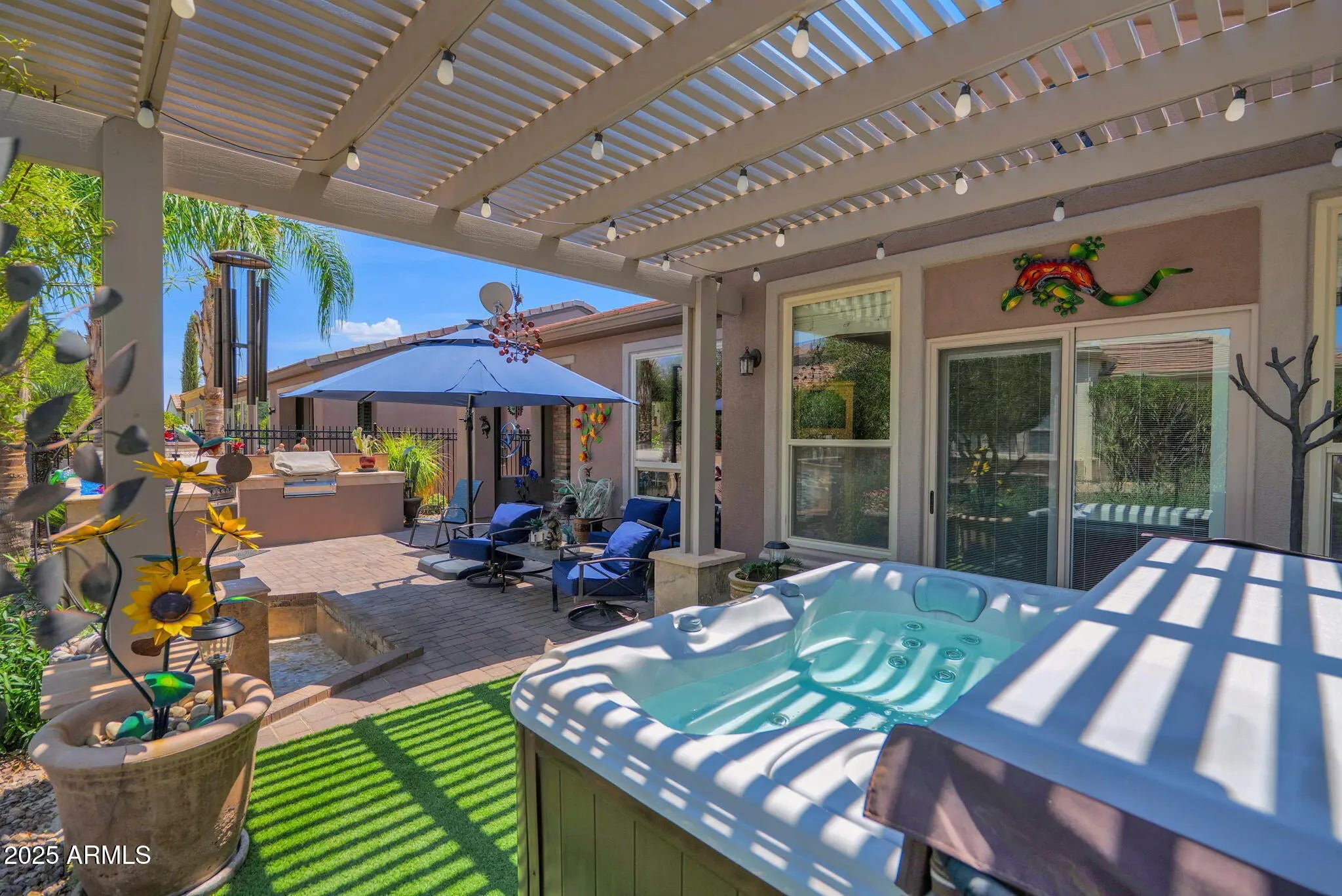 Discover the beauty of this uncompromising NICE model, perfectly designed for those seeking their own private paradise. Ideally situated on a North/South-facing lot, the home features a serene backyard overlooking a lush greenbelt. Inside, the spacious Great Room seamlessly connects to a versatile open Den/Office, a dedicated Smart Space/Laundry Room, a Dining Area, and two bedrooms with two full baths. Elegant stonework accents the interior archway, while a cozy brick-faced fireplace warms the patio for year-round enjoyment. The home is appointed with beautiful tile and wood flooring. The chef's kitchen showcases granite countertops with a custom backsplash, staggered cabinetry, stainless steel appliances, and a wine fridge—perfect for entertaining. Step outside to the screened covered patio and enjoy an outdoor fireplace, multiple built-in BBQs, a tranquil water feature, and an inviting pergola and hot tub that creates the ultimate space for relaxation and entertaining. Additional upgrades include multiple sky lights, custom master closet, epoxy-coated garage flooring, tankless water heater, soft water and reverse osmosis systems. Come experience the renowned Encanterra Resort Lifestylethis exceptional home is truly a must-see!