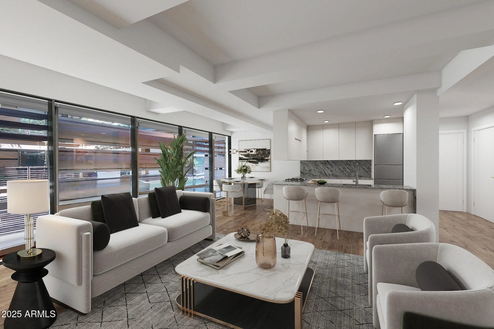Recently updated and move-in ready, this spacious luxury corner unit blends modern sophistication with everyday comfort in one of Scottsdale's most desirable communities. Rich wood flooring, fresh enhancements, and an open, light-filled layout create an inviting atmosphere from the moment you enter. The generous primary suite offers a spa-inspired bath and ample closet space, while the formal dining area and expansive living room are ideal for entertaining. Floor-to-ceiling glass and a private patio extend the living space outdoors for effortless indoor-outdoor enjoyment. Residents enjoy resort-style amenities including indoor and outdoor pools, a state-of-the-art fitness center, steam rooms, concierge services, and beautifully landscaped courtyards with tranquil water features.