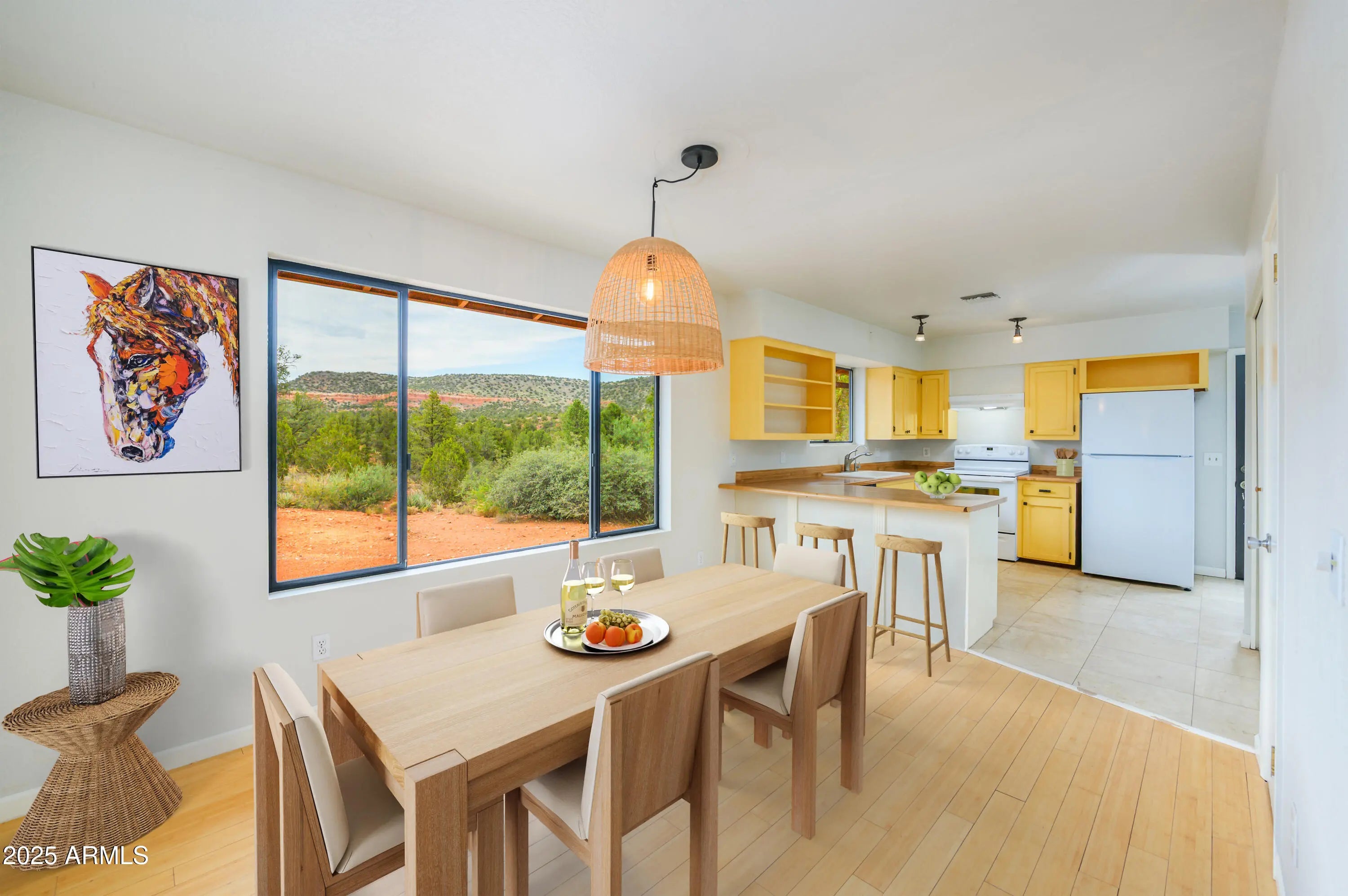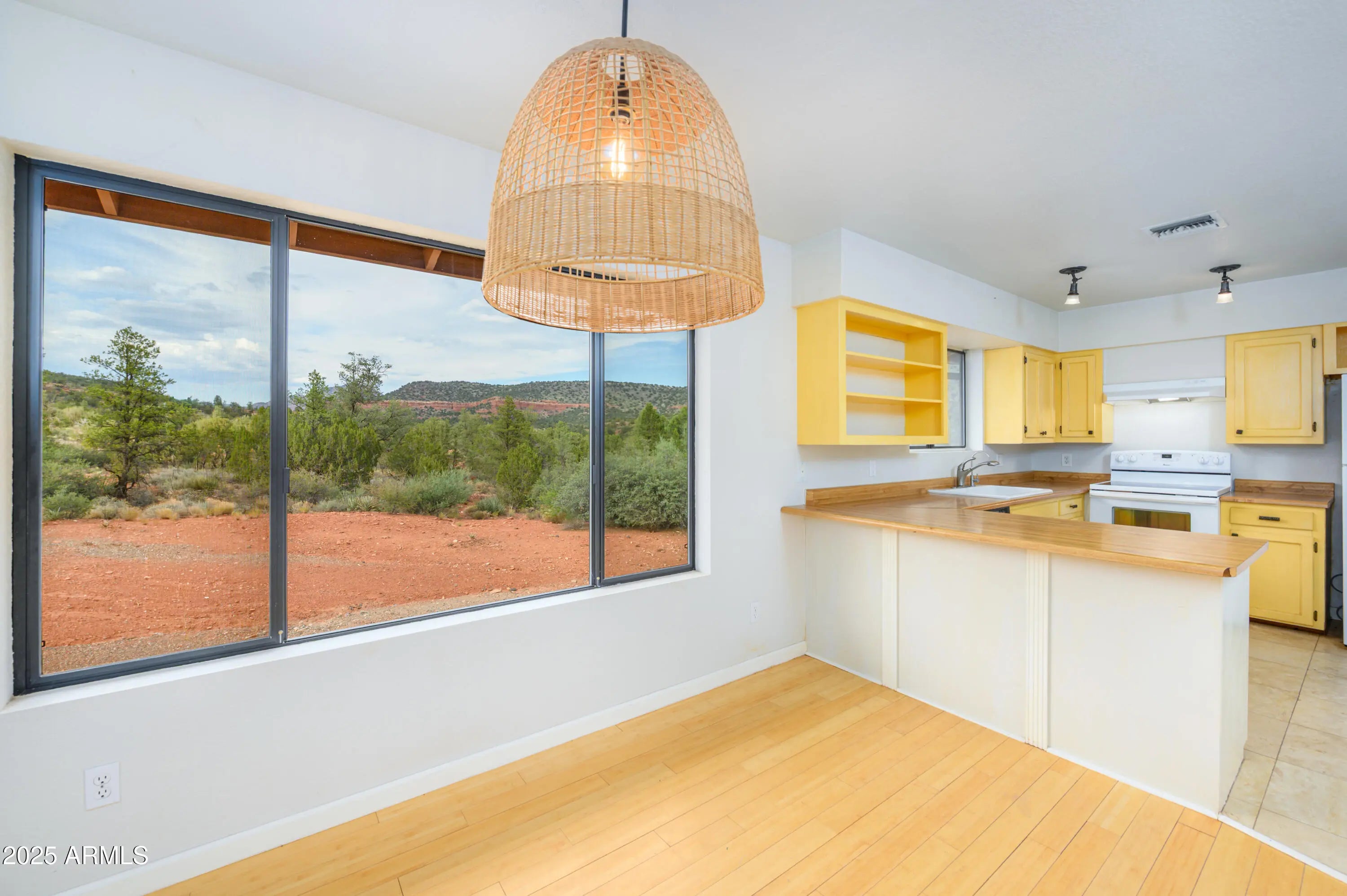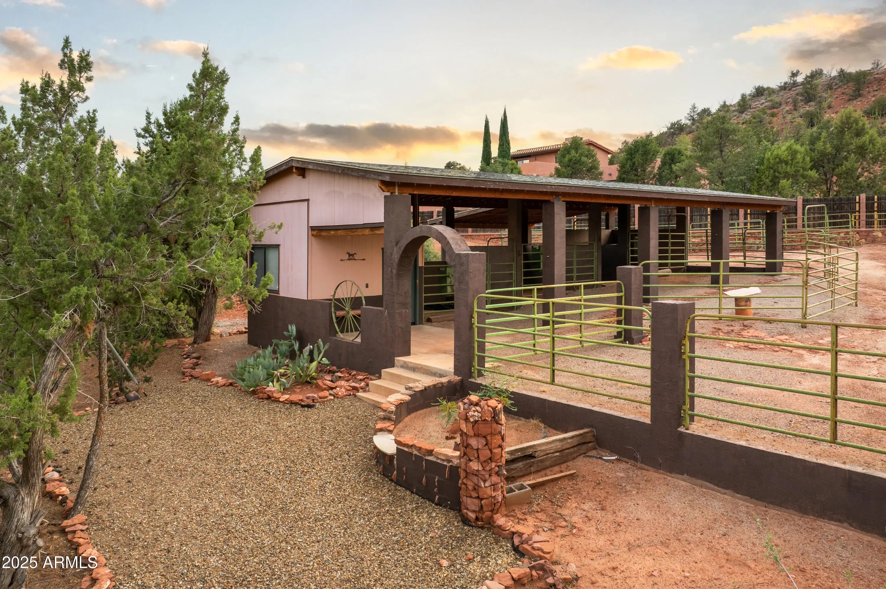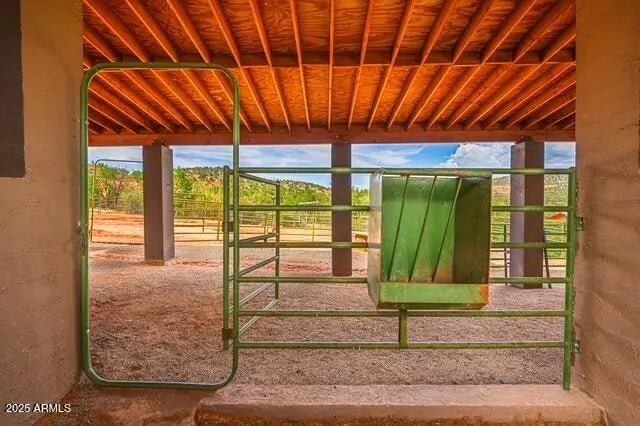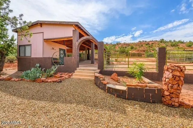 Scenic country living with endless Red Rock views, NO HOA, and bordering Coconino National Forest! This 1 acre property borders National Forest with direct views of Thunder Mountain and sits just 3 minutes from Red Rock State Park and only 5 minutes to the shops, restaurants, and conveniences of West Sedona. A true hiker's and horse rider's paradise, with direct trail access from your own backyard and the ability to ride out into Red Rock Country straight from your own stable. The charming 3 bedroom, 2 bath ranch style home features bamboo flooring throughout, a spacious eat in kitchen with plenty of cabinets, a large patio deck overlooking the property into Red Rock country, cozy living room with a newer Jotul wood stove, central air conditioner, ceiling fans in every bedroom, central air conditioner, ceiling fans in every bedroom, and full laundry facilities. The owner's suite offers a soaking tub, double closets, and a private patio perfect for morning coffee while watching hot air balloons float over the Red Rocks. The third bedroom has direct access from the garage, ideal for a guest space or home office. The oversized garage features a rear sliding glass door that opens to views and privacy, perfect for hobbies or a workshop. Outside, enjoy a fenced garden, stone BBQ, front and backyard covered patios, laundry line, and plenty of room to take in the peaceful National Forest views. The home is equipped with its own private water well and storage tank. Horse lovers will appreciate the 1,584 sqft, 3 stall mare motel with tack room, private driveway, breezeway with rubber mats, covered hay storage, and fully fenced turnout arena. The lockable tack room is equipped with a wash sink, storage shelving, and plenty of room for supplies. The horse barn has extra covered parking away from the home for convenient access for potential guests or horse boarders. This home offers Sedona living at its best, quiet, scenic, private, and just minutes from everything. Don't miss your opportunity to own a true Red Rock gem in a great location.