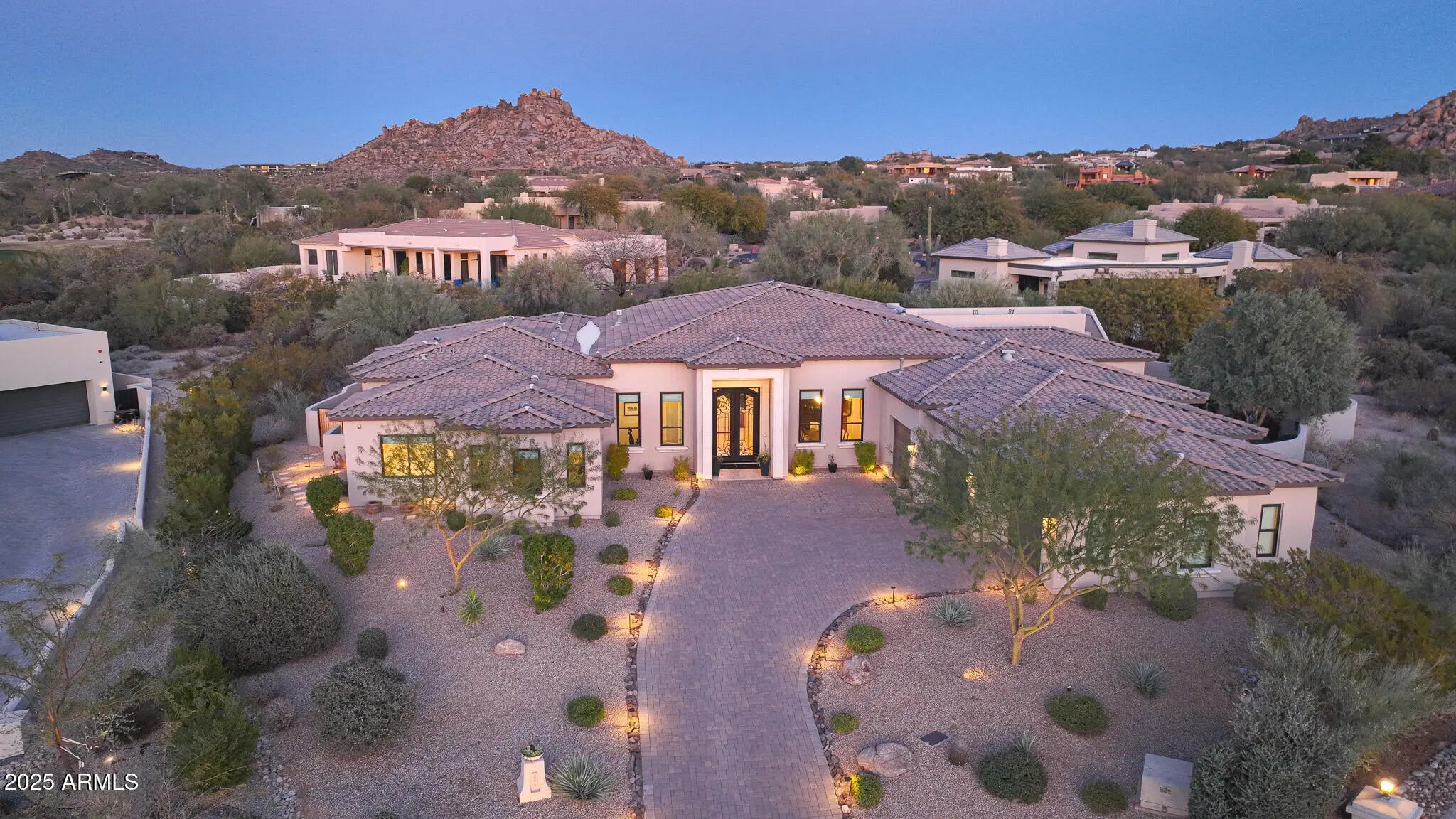 Perched on an elevated cul-de-sac lot within the guarded gates of Troon Golf and Country Club, this custom home built in 2020 by Neidhart Enterprises offers an unmatched combination of luxury, comfort, and modern living. With panoramic views of Troon Mountain and Pinnacle Peak, the residence is thoughtfully designed to showcase its stunning surroundings while providing a serene retreat. This home features a versatile layout with 4 bedrooms, an office, a den, a bonus/gym space, and 3.5 baths. The interior boasts soaring 14' ceilings in the main living areas, a custom limestone fireplace, and oversized bifold French doors that seamlessly connect to the outdoors. The gourmet kitchen is a chef's dream, complete with Thermador stainless steel appliances, custom Woodcase