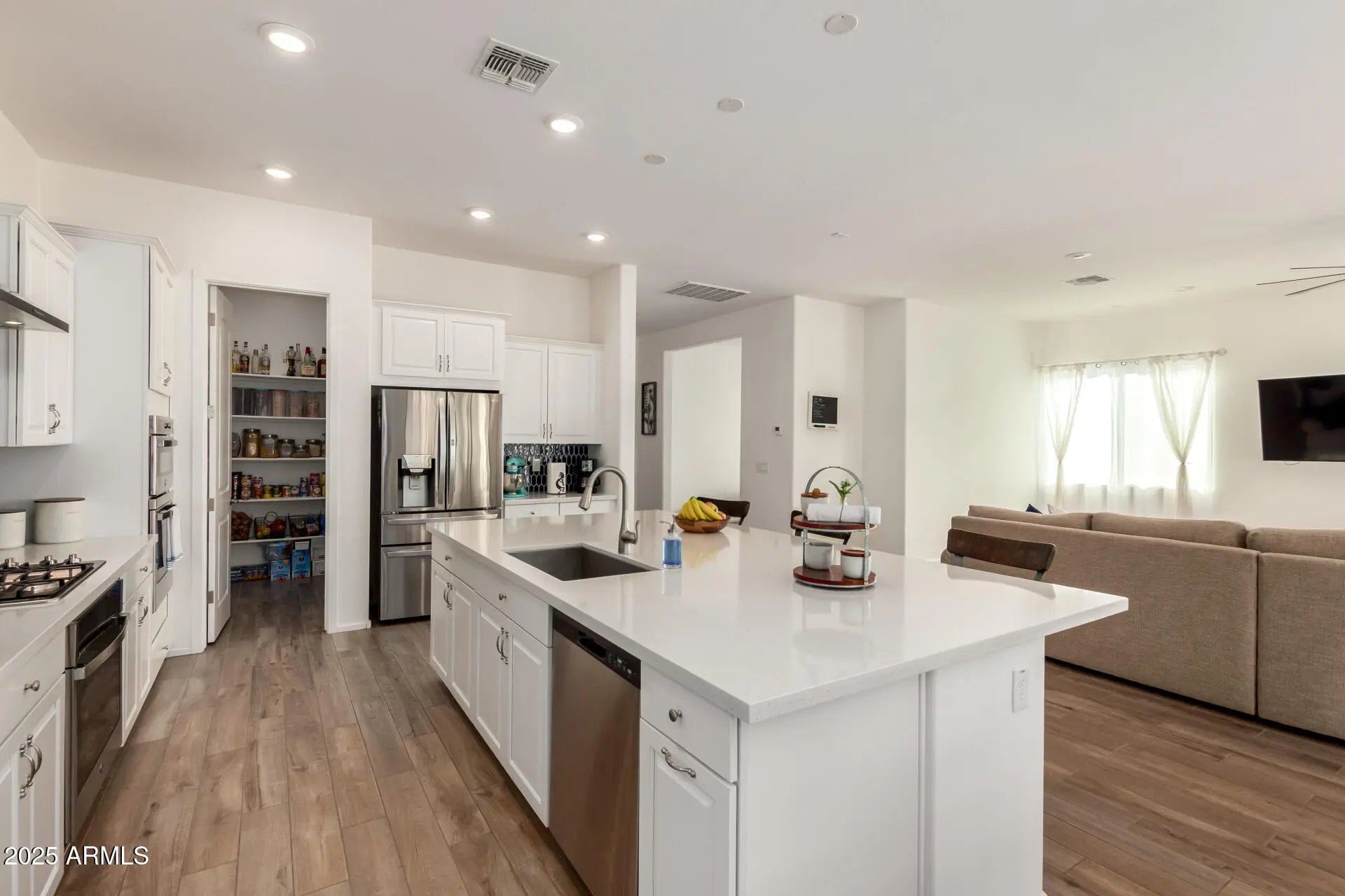 You'll LOVE this beautiful home in Homestead at Marley Park! Sits on a corner lot, offering 4 beds, 3 baths, 2-car garage, & a manicured landscape. The fabulous interior showcases tons of natural light, neutral paint, & wood-look tile flooring w/carpet in bedrooms. The spacious open layout is paired with multi-sliding doors to the back! The gourmet kitchen boasts SS appliances w/cooktop gas, quartz counters, ample white cabinets, stylish tile backsplash, recessed lighting, a walk-in pantry, and an island w/breakfast bar. The versatile den is perfect for an office! The main bedroom has a lavish ensuite with two vanities, soaking tub, & a partitioned walk-in closet. Tranquility awaits outback! A covered patio, built-in grilling station, fireplace, & lush lawn complete the picture. Just WOW!