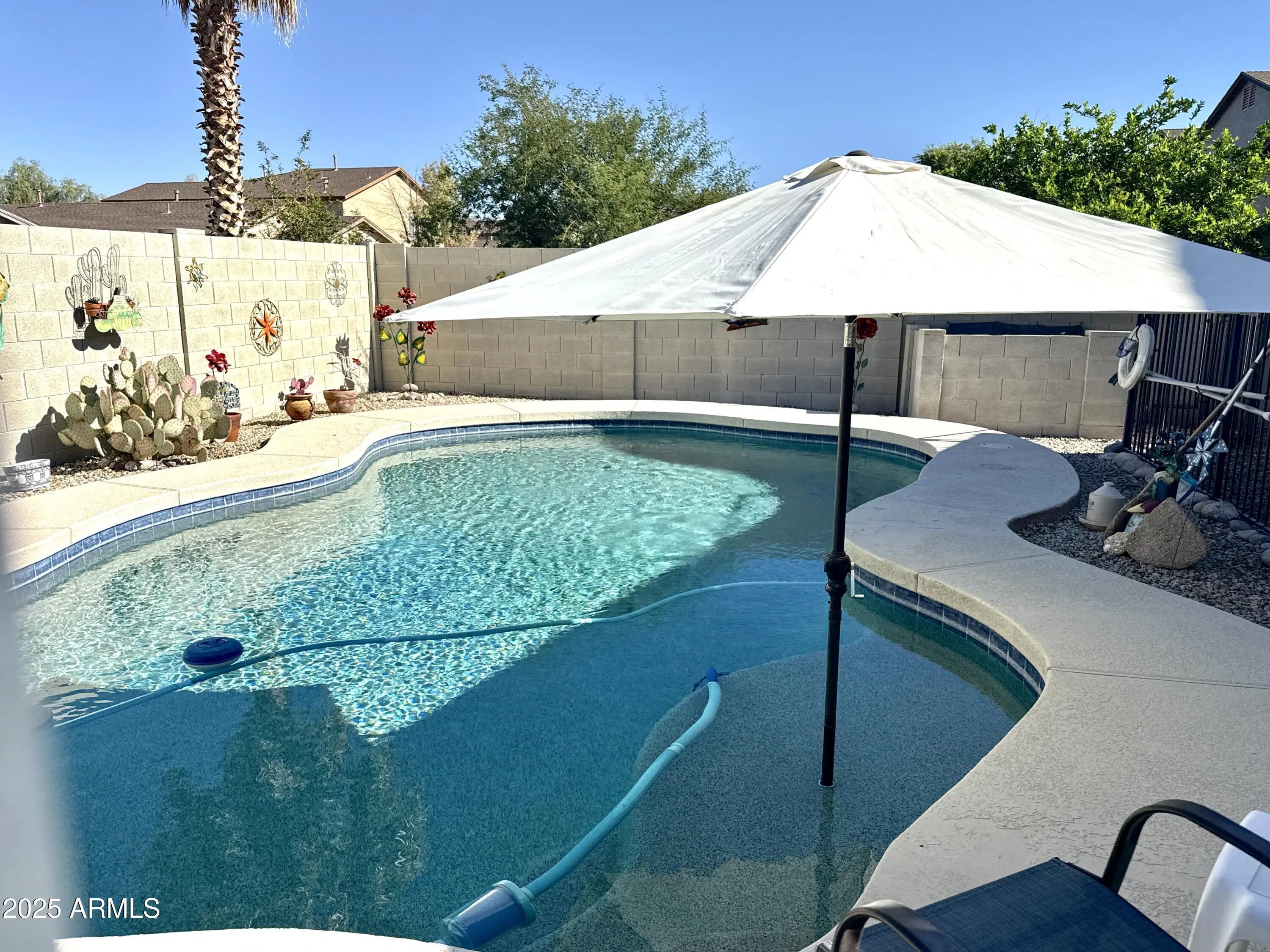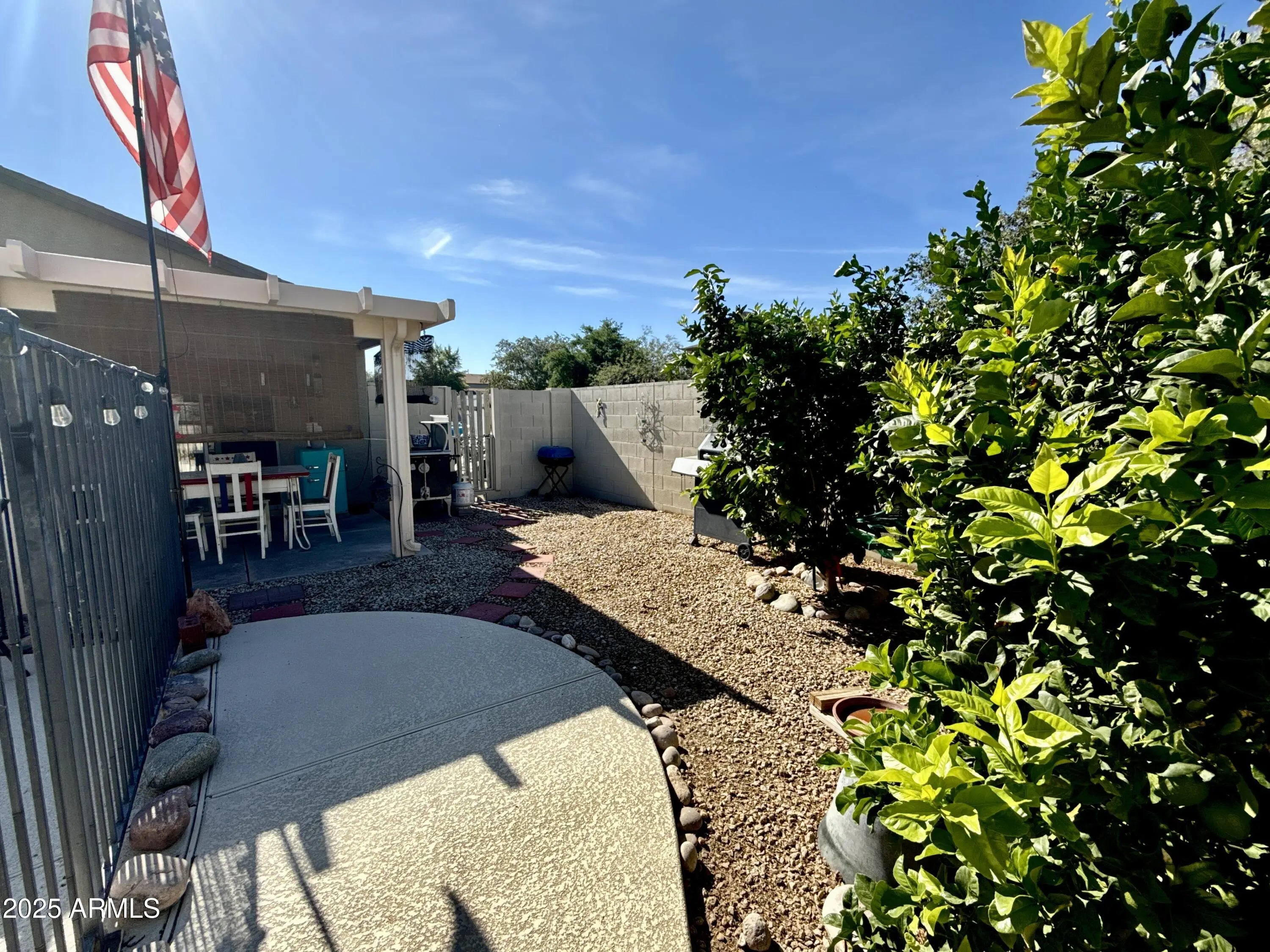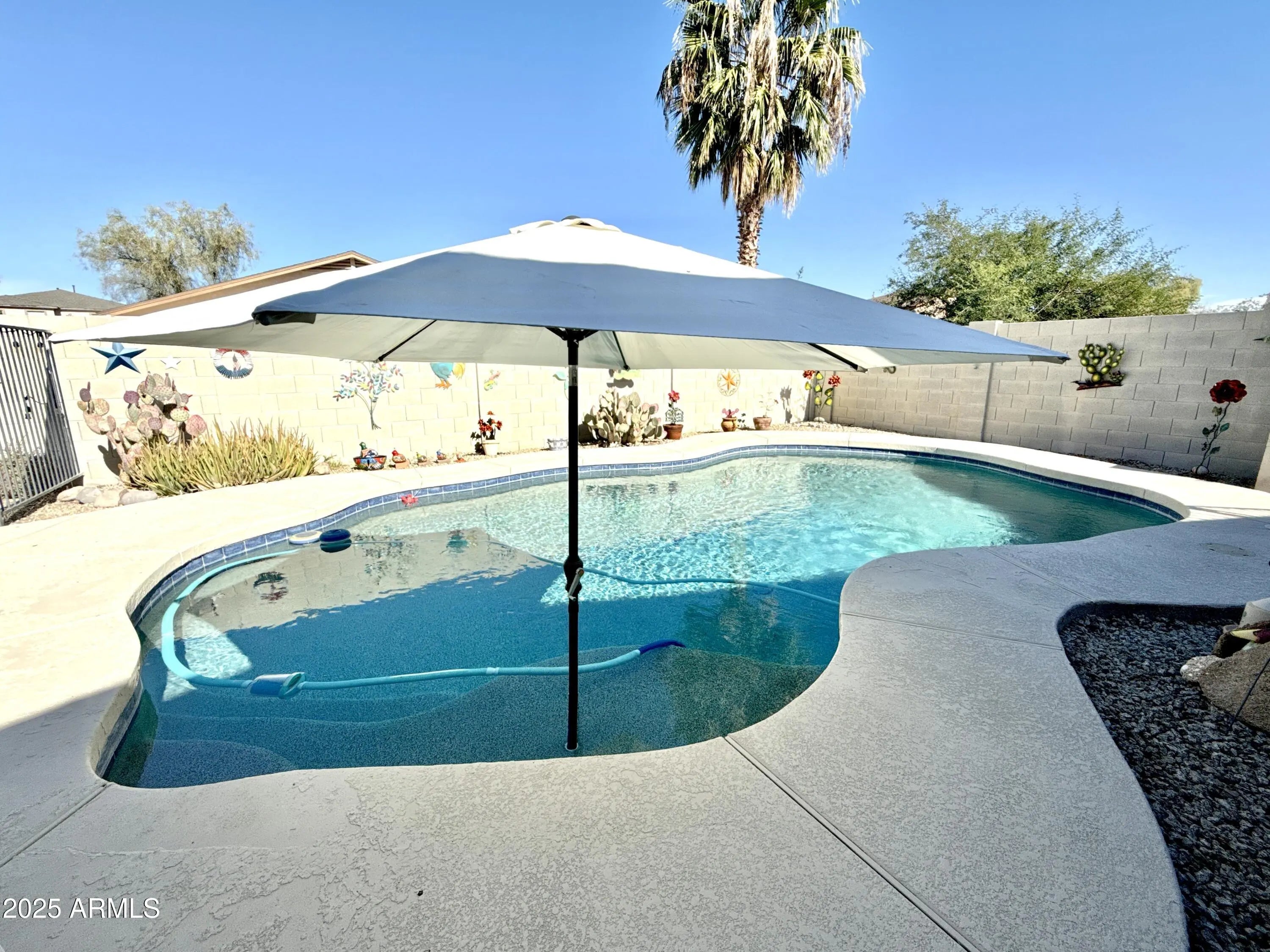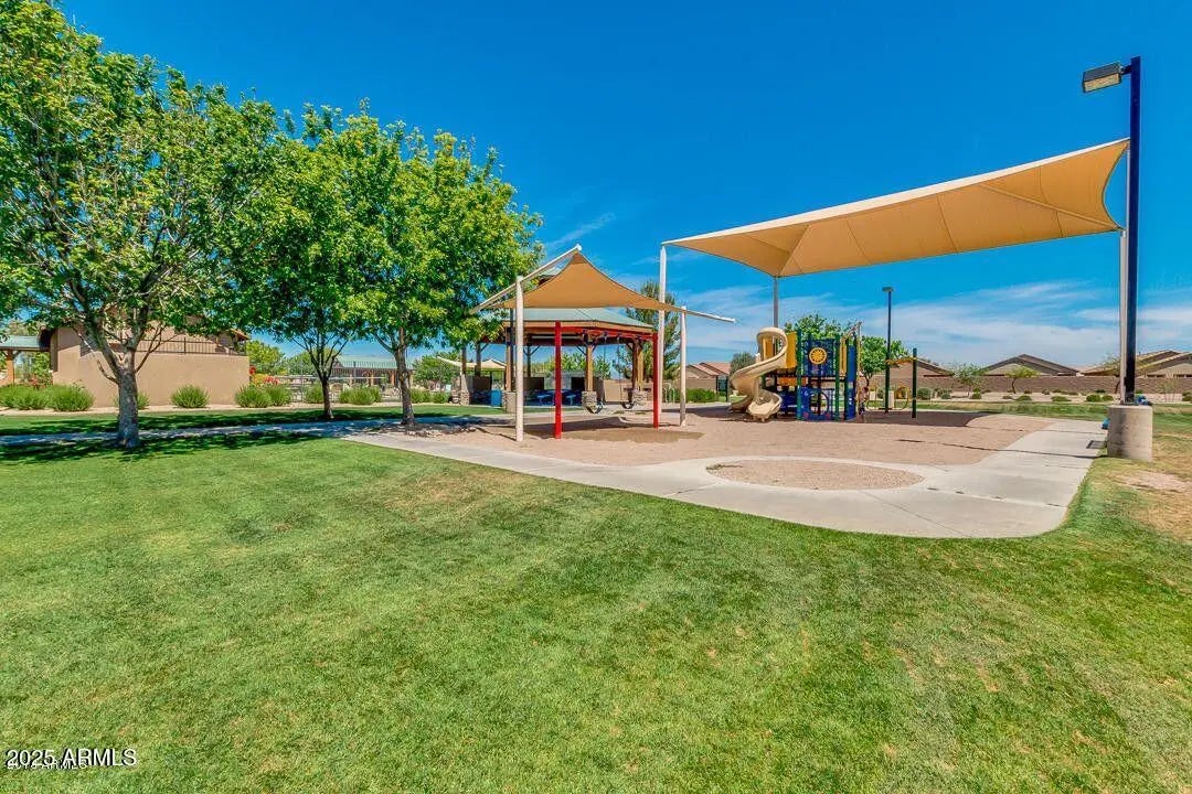 Beautifully maintained 3-bedroom, 2-bath single-story home nestled on a corner lot in the fast-growing & highly desirable San Tan Valley community! The oversized lot includes an RV gate, 15 tons of gravel desertscaping, a gated back courtyard, and a sparkling pebbletec pool with a walkout island for lounging. Mature sweet orange & lemon trees, evergreen turf, & patio shades create the perfect outdoor dining, lounging, or BBQ setup. Step inside to a spacious, open concept layout filled with natural light sourced from 10 solar tubes. Kitchen appliances only 2 years old. Exterior & Interior painted in 2019. Each bedroom is generously sized, & two feature walk-in closets, making storage a breeze. New hot water heater in '24. Custom storage cabinets & epoxy coating in garage.
