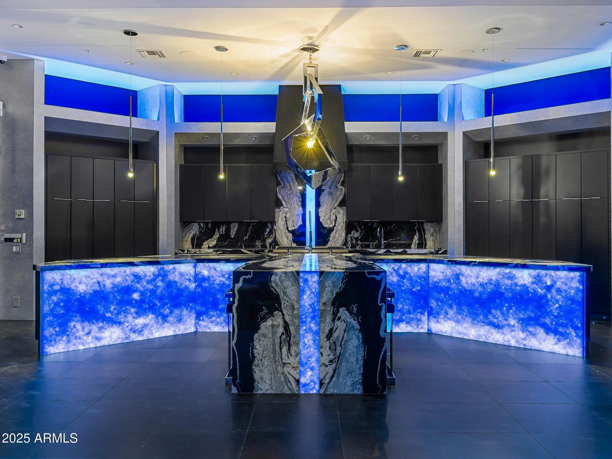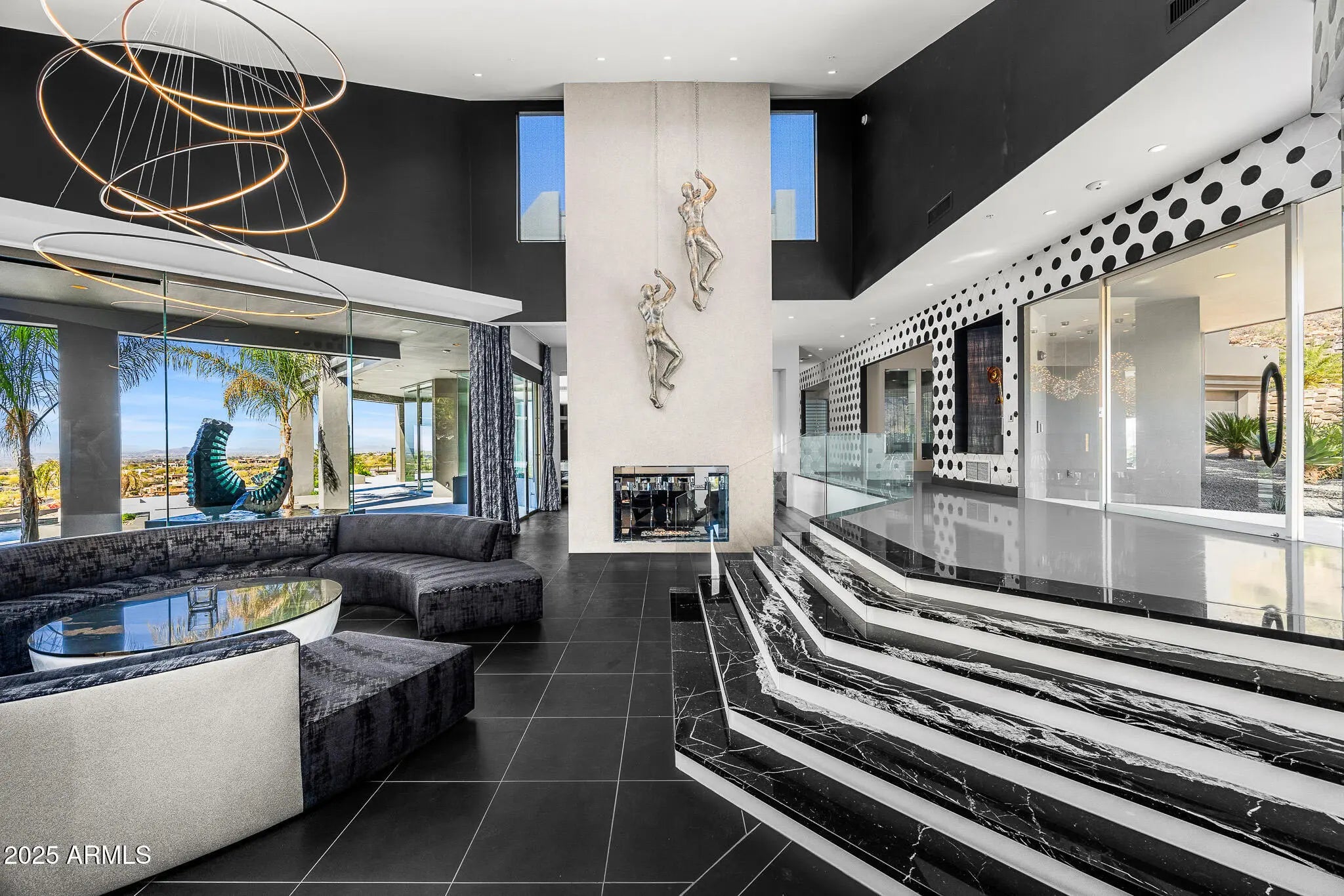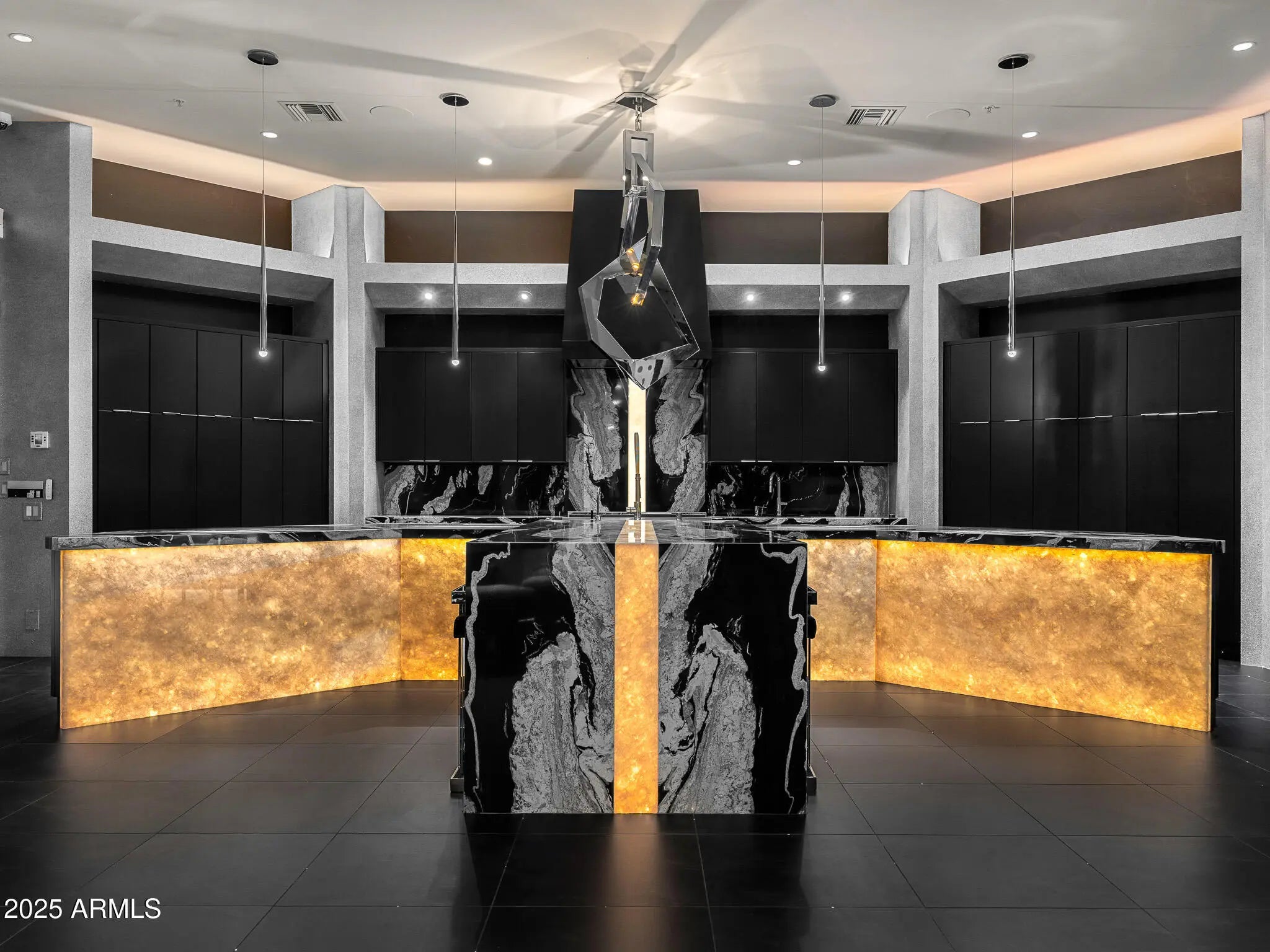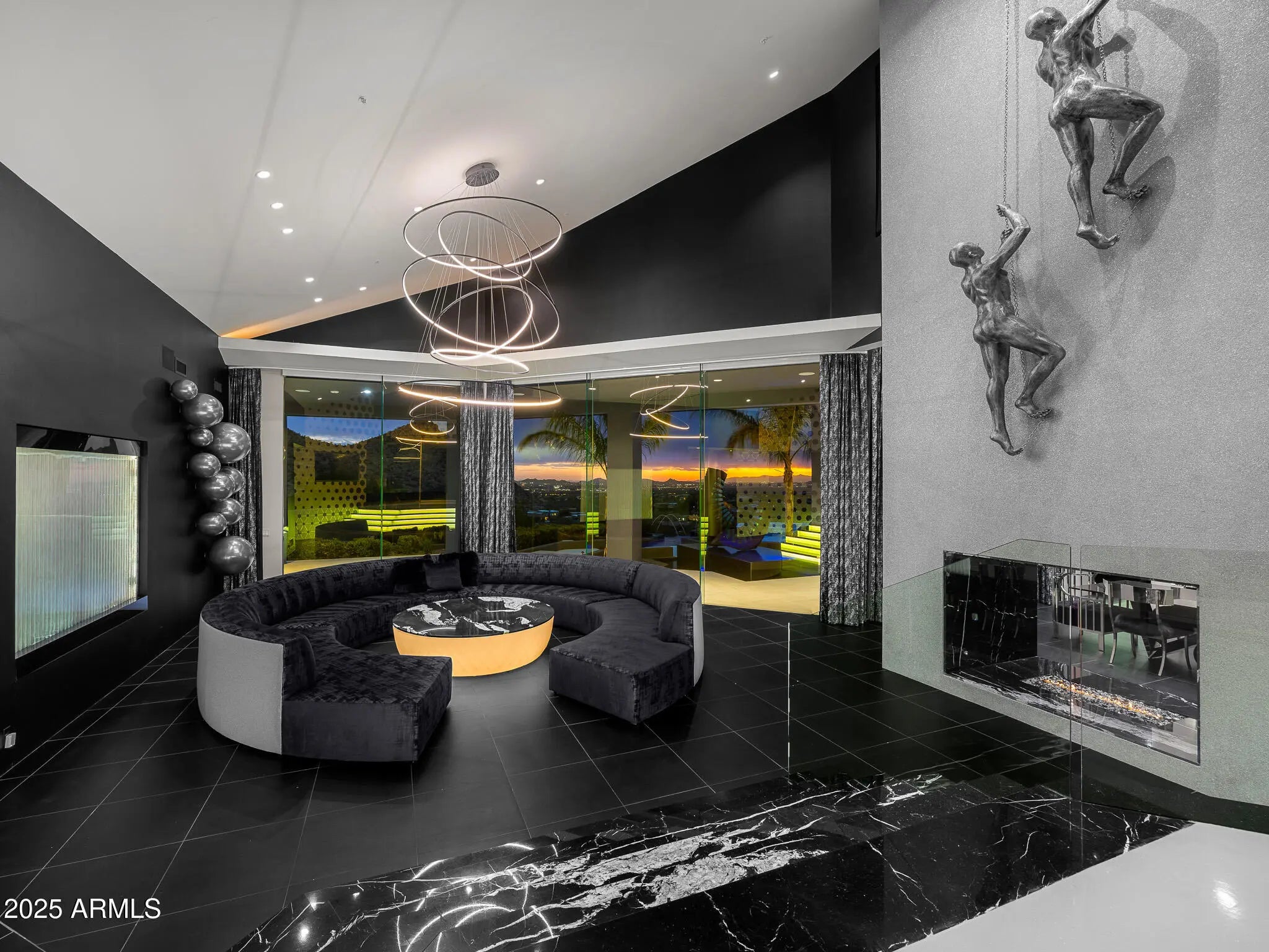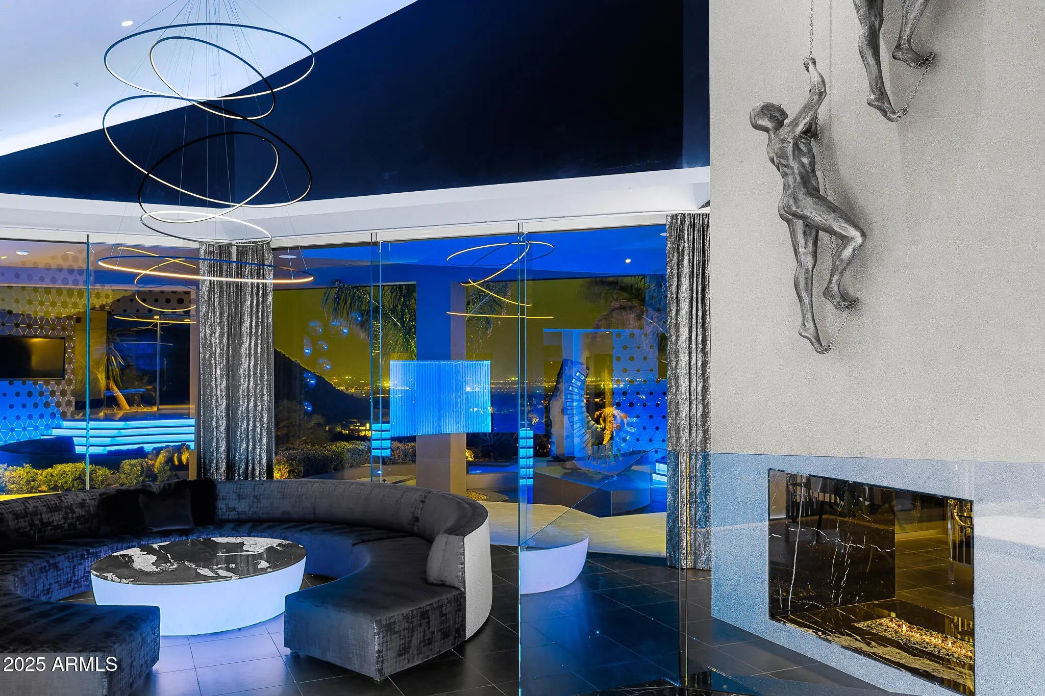 Over 1 Million under appraised value! Prepare to be amazed! With finishes you have never seen. This home is truly one of a kind, boasting bold, modern design and unmatched style. Nestled in the serene, private hills of Canyon Heights, this gated estate is a true masterpiece. As you approach, the winding driveway sets the tone for what lies ahead, and the striking modern architecture is sure to impress. Step inside to discover black marble flooring and a backlit staircase, creating an immediate sense of elegance. Custom hand-painted walls and a dramatic fireplace add to the sophistication, but it's the stunning views that truly take your breath away. The kitchen is a chef's dream, featuring sleek black granite, backlit onyx countertops, and an authentic teppanyaki grill. Entertain in style in the formal dining room