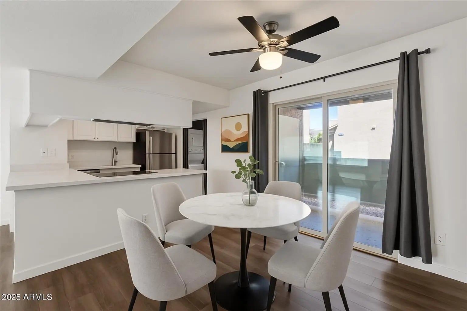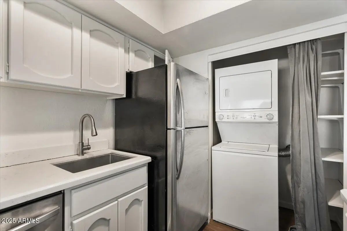 Stacked Washer/Dryer, Dryer, Washer, Refrigerator, Built-in Microwave, Dishwasher, Disposal